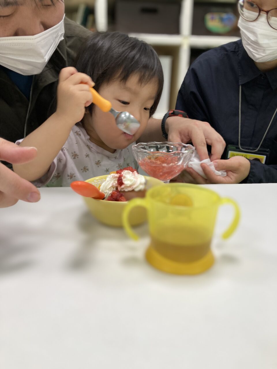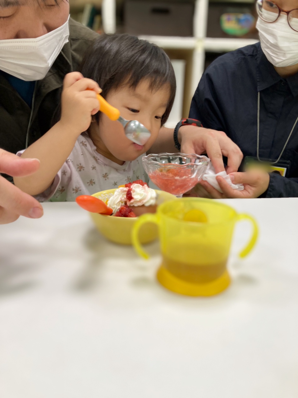 次はお待ちかねのケーキの登場です?みんなでお祝いして、ろうそくをふーーーーーーと頑張りました??