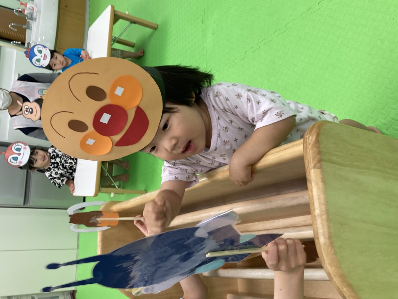 保育士によるペープサートの前に、、、、、、、Hちゃんにアンパンマンに変身してもらいました!