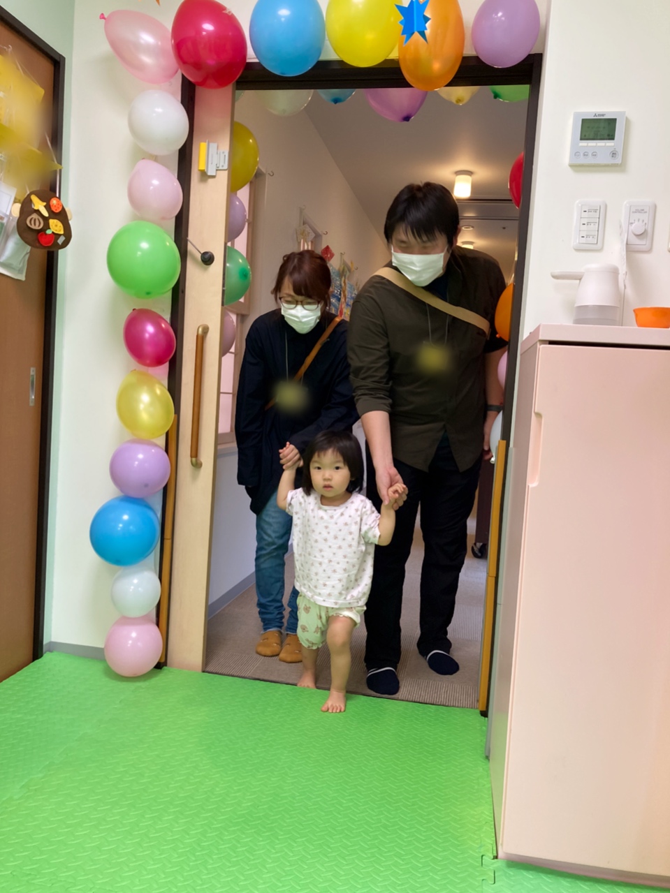 お昼寝から起きて準備していると、大好きなママとパパが来てくれてニコニコなHちゃん♪