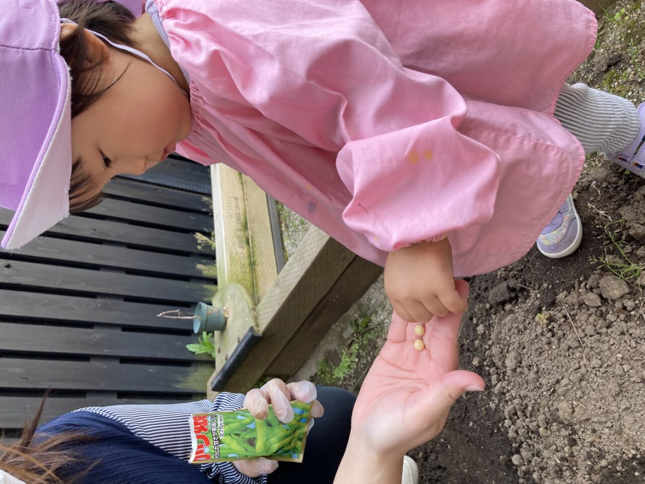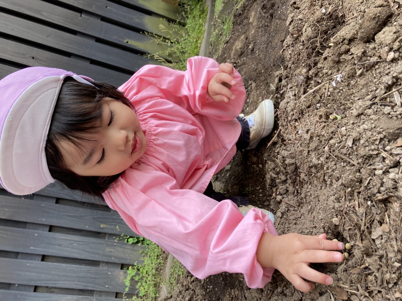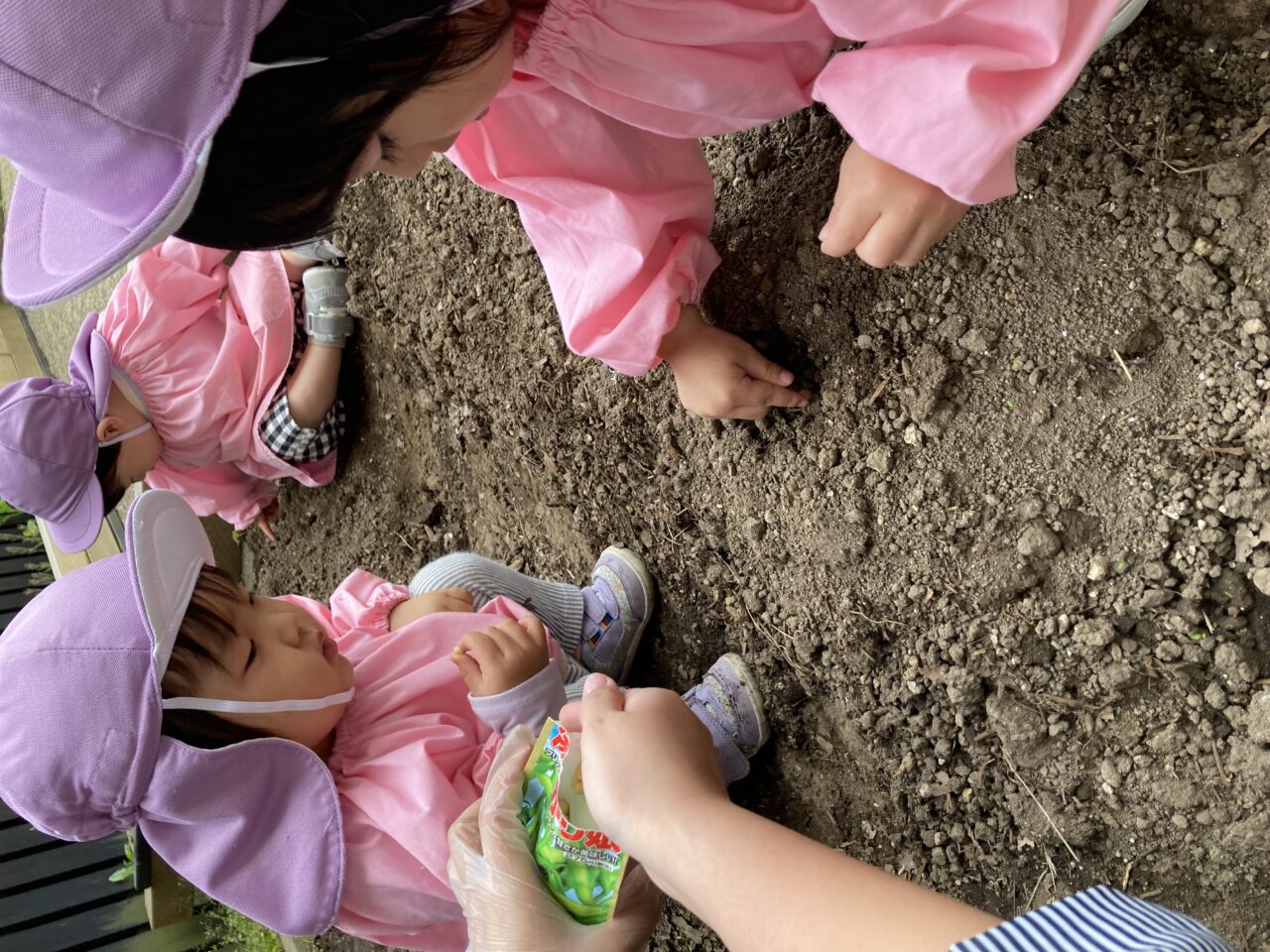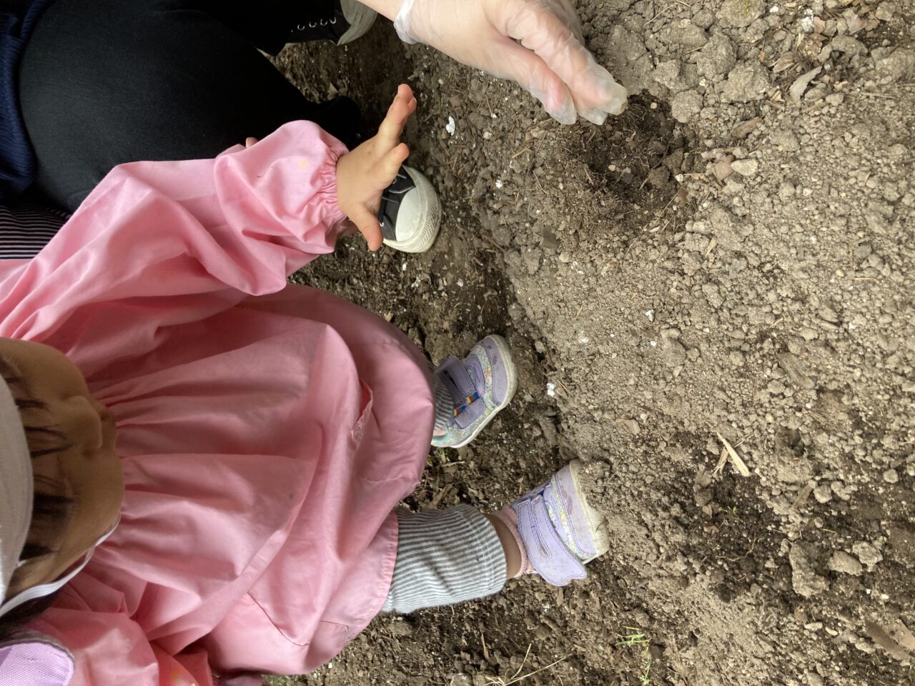 みんなの小さなおててで種を穴の中に置いてもらいます?