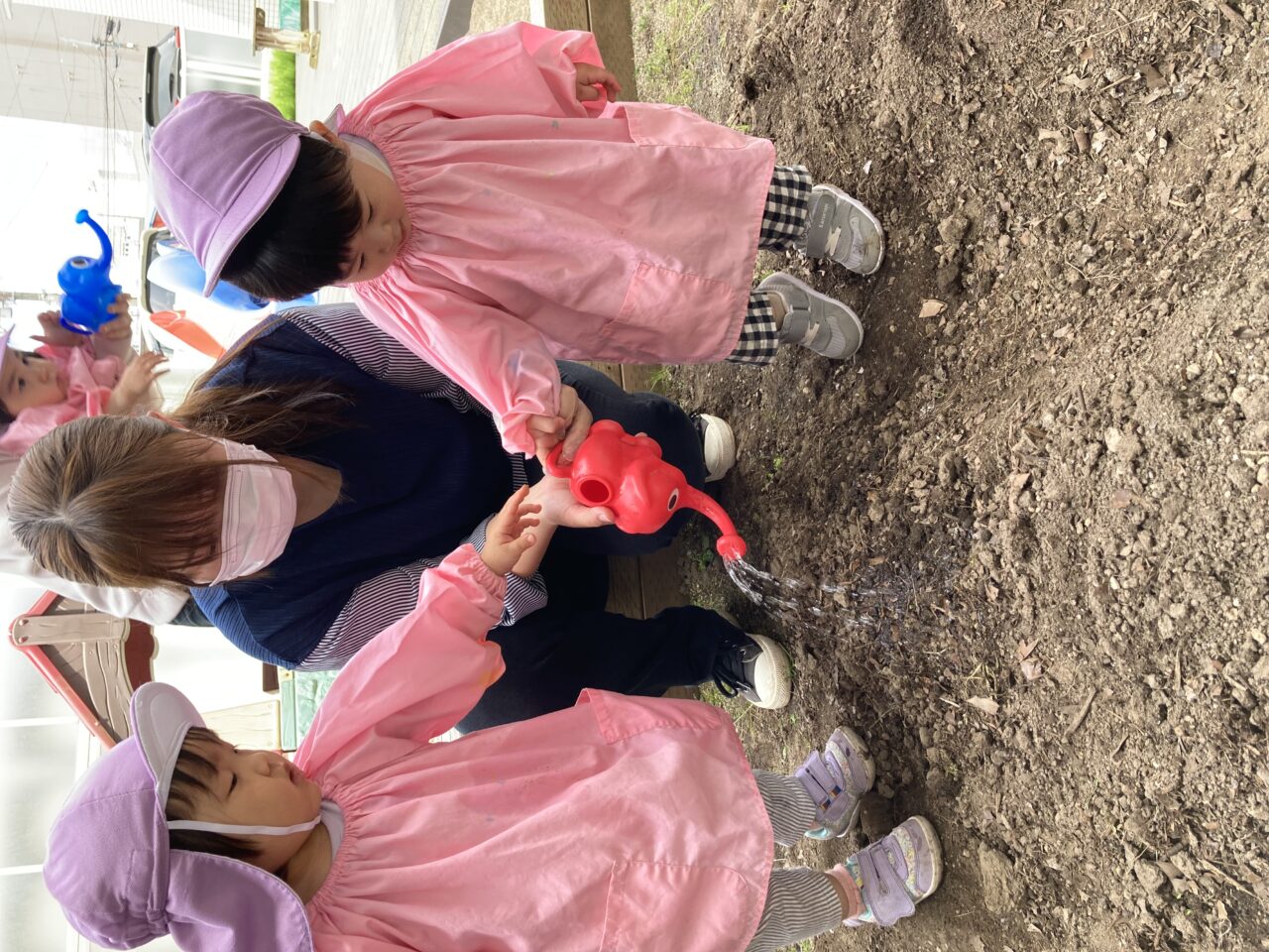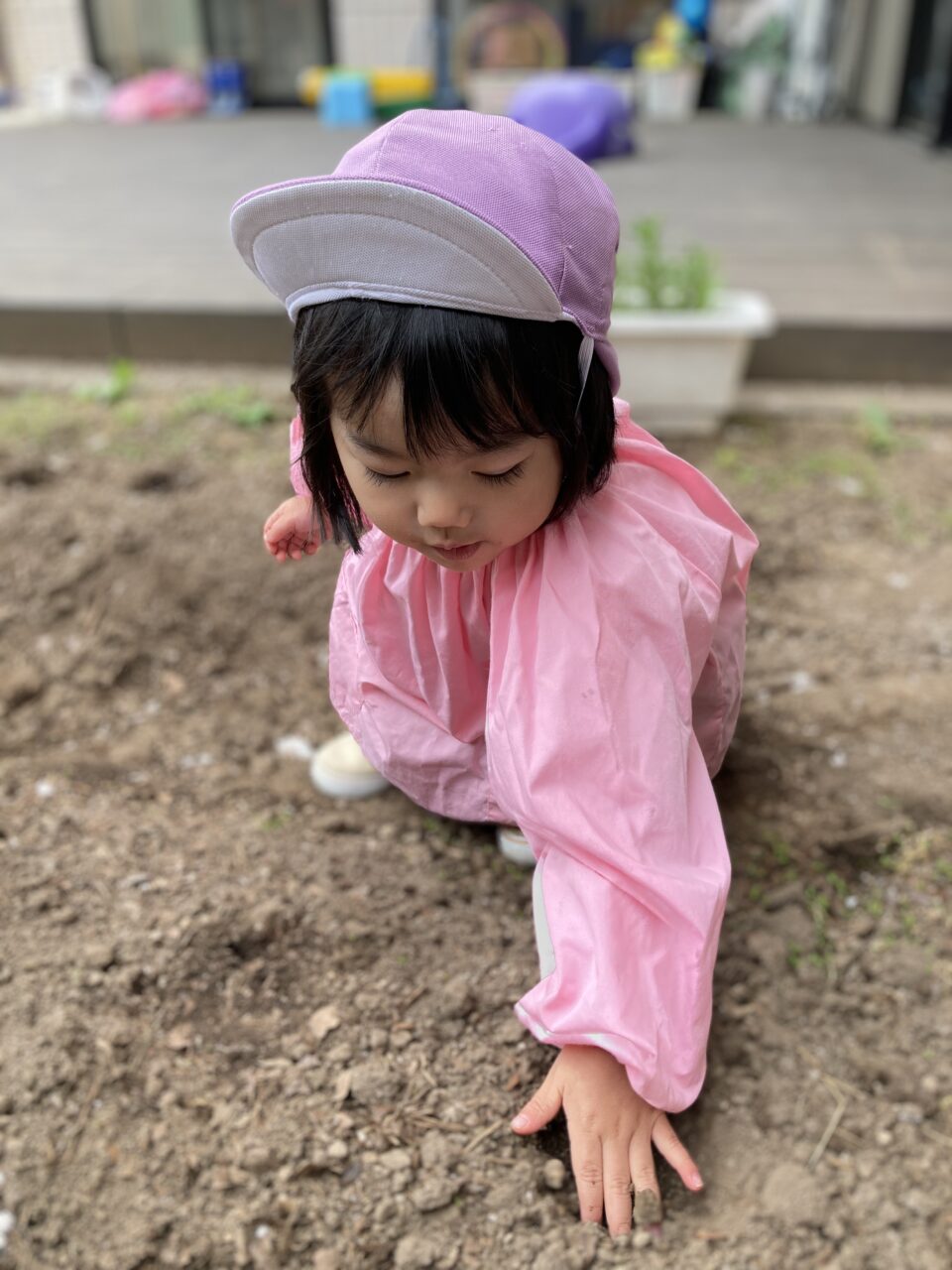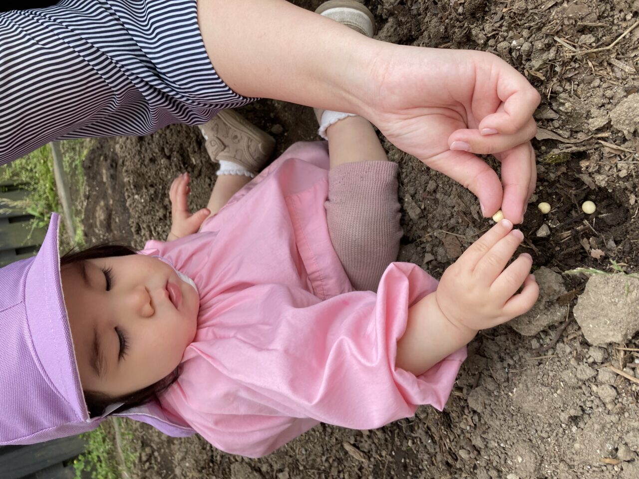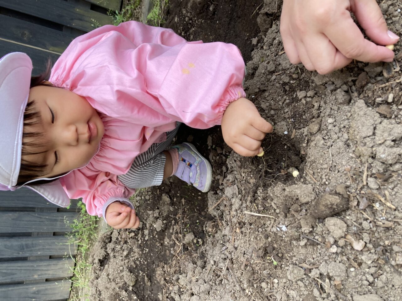みんなの小さなおててで種を穴の中に置いてもらいます?