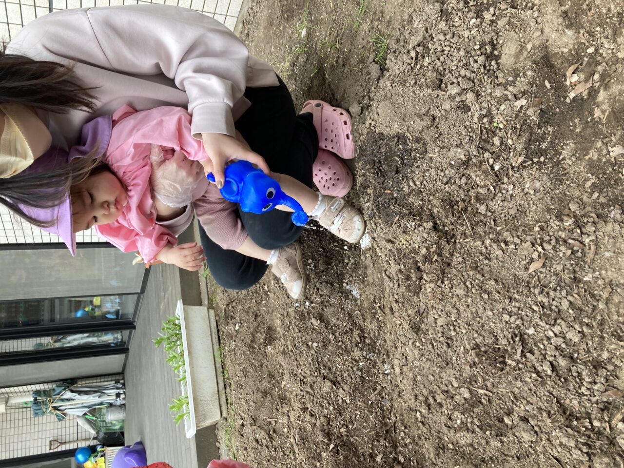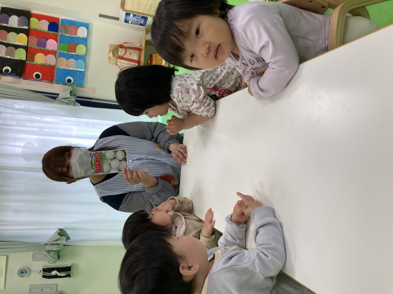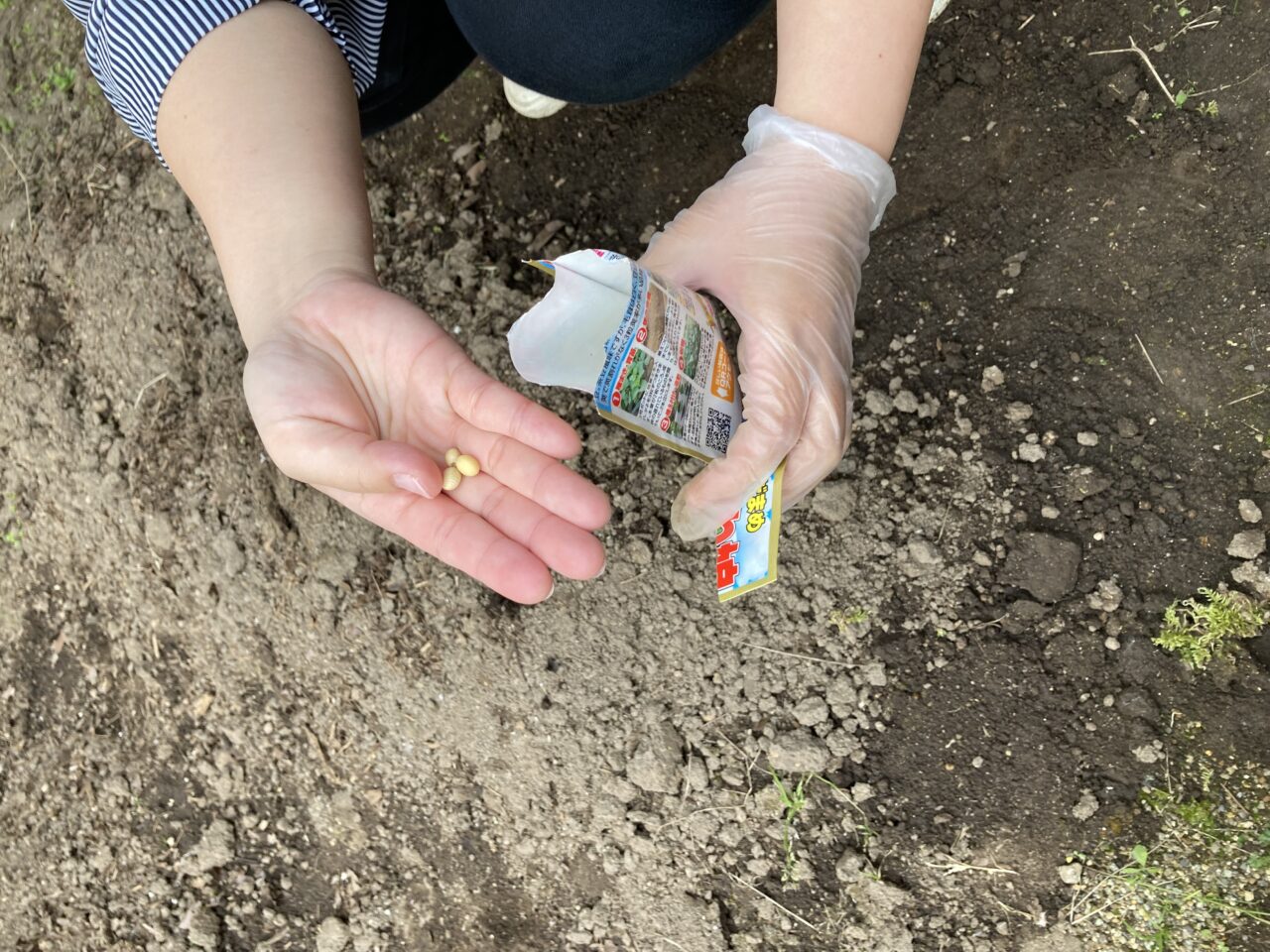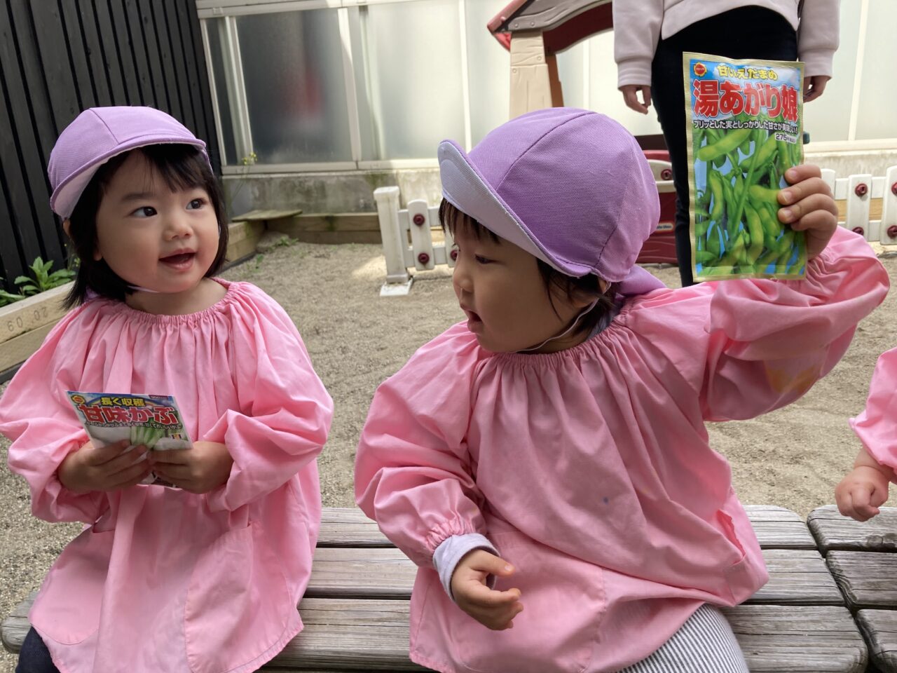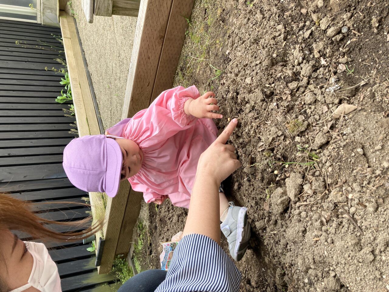 みんなの小さなおててで種を穴の中に置いてもらいます?