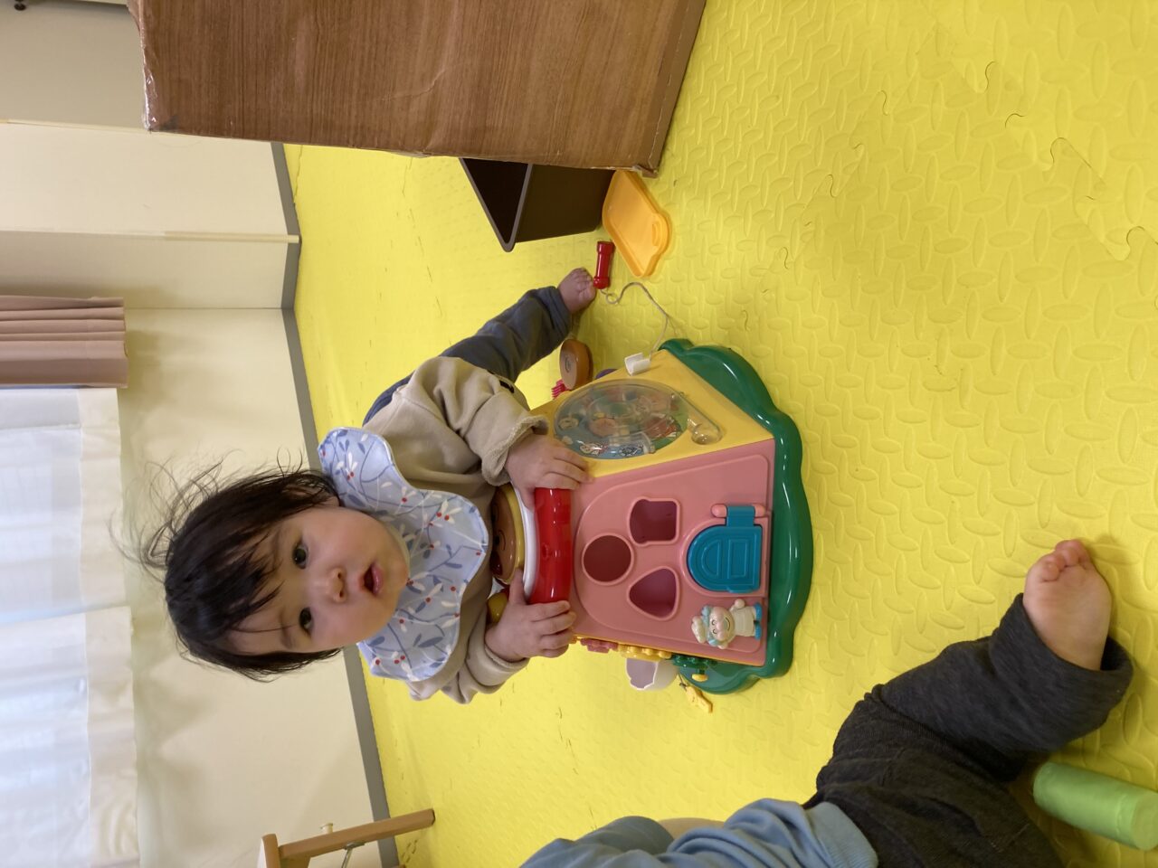 少しずつ保育園の雰囲気に慣れてくれて、好きな玩具を見つけてはハイハイやずり這いで探索をして楽しんでいます???