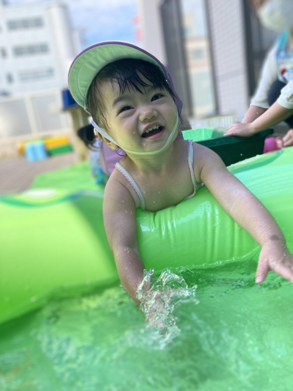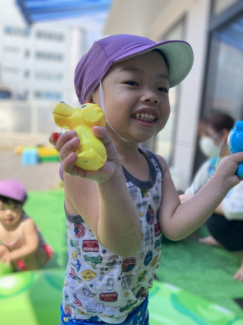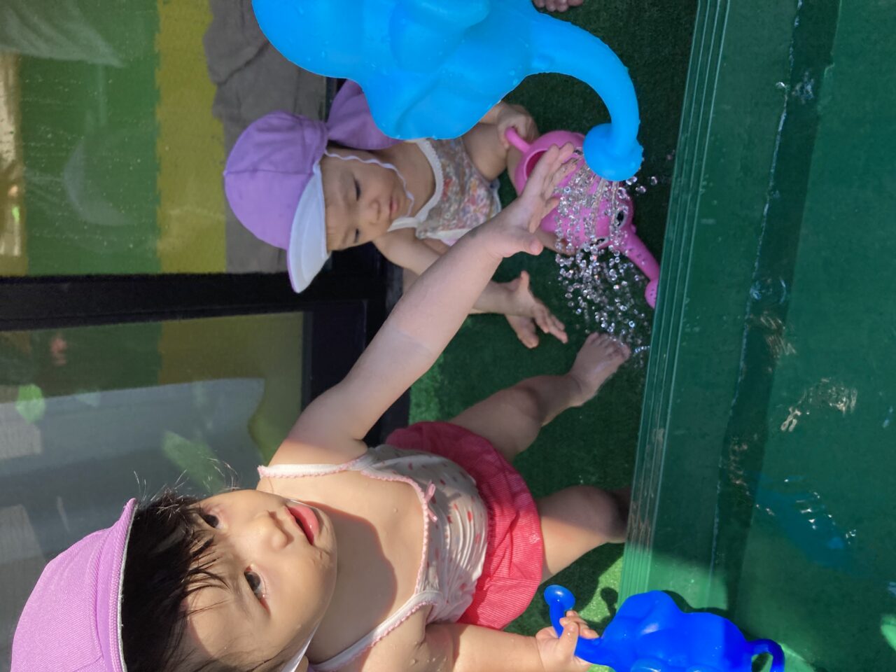 ママと離れること不安かもしれないけど大丈夫。今日の水遊びを見ているとすごくいい表情していて楽しさが伝わってきます。💕😊(Rちゃん、Tちゃんもう✨きらきらスマイル☺ですよ❗)