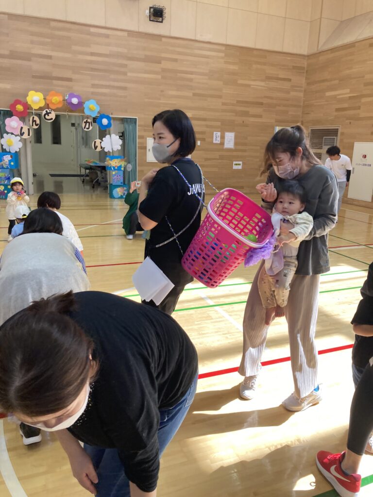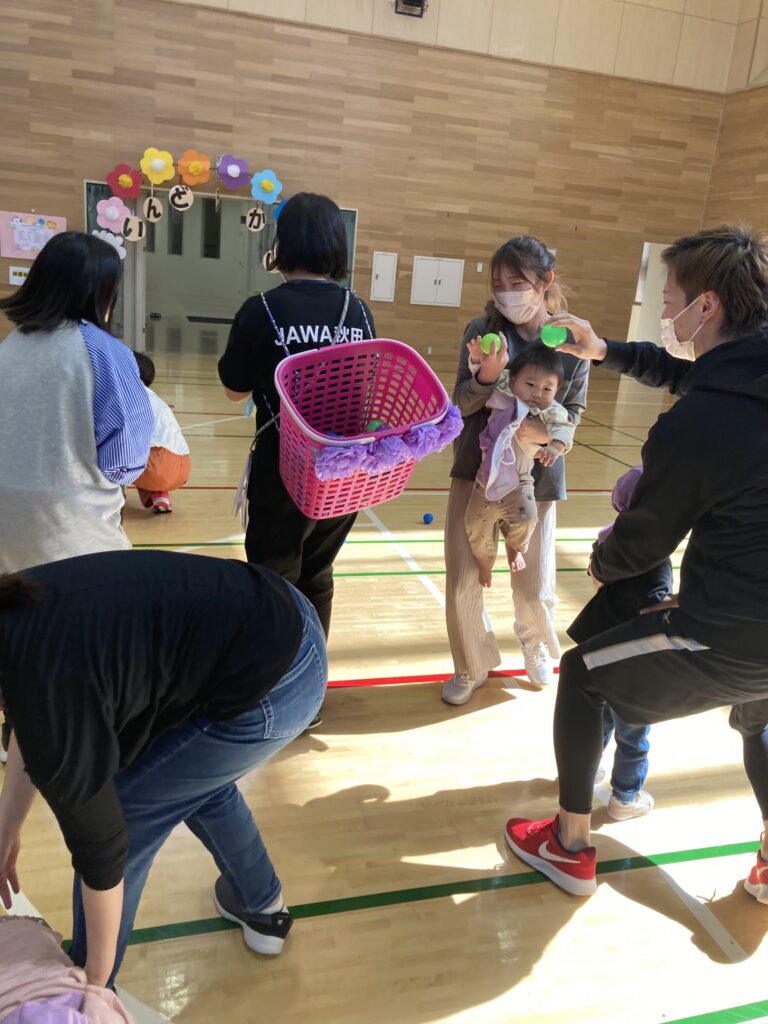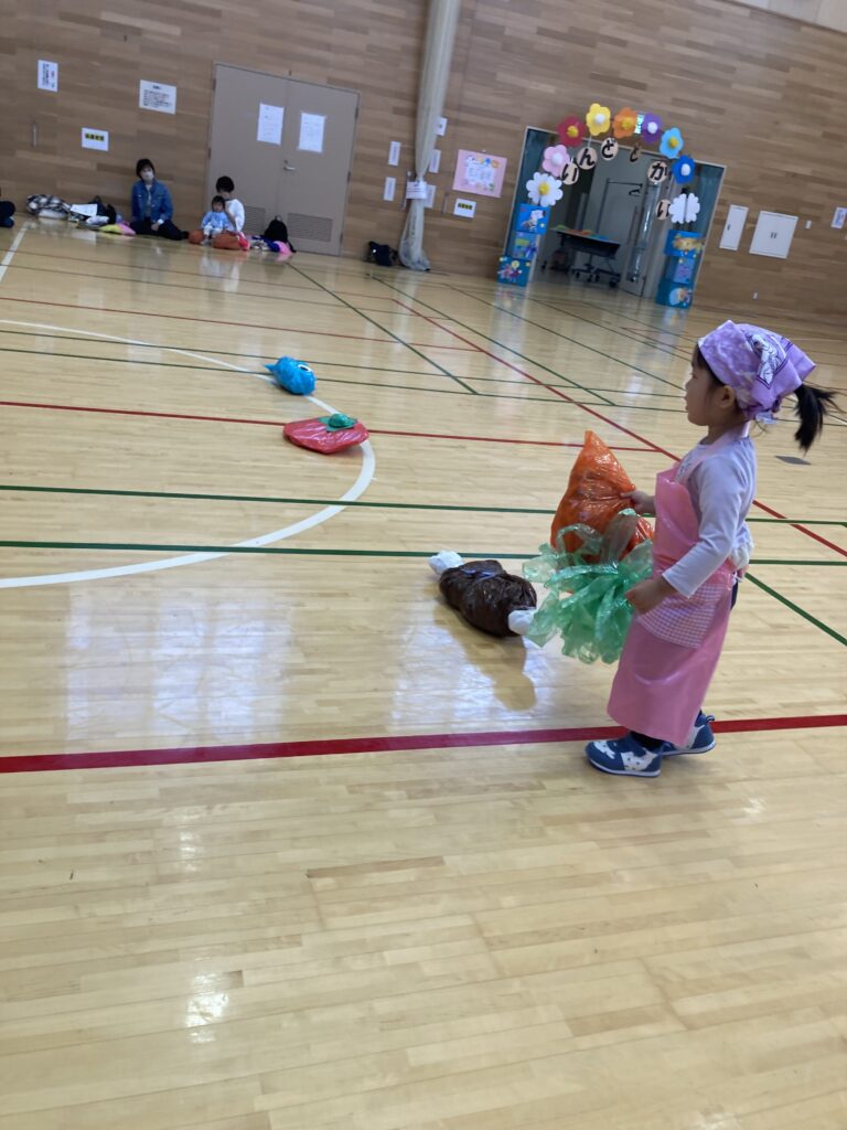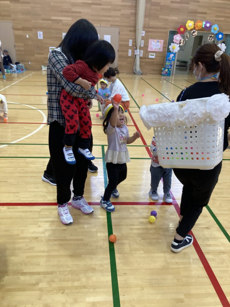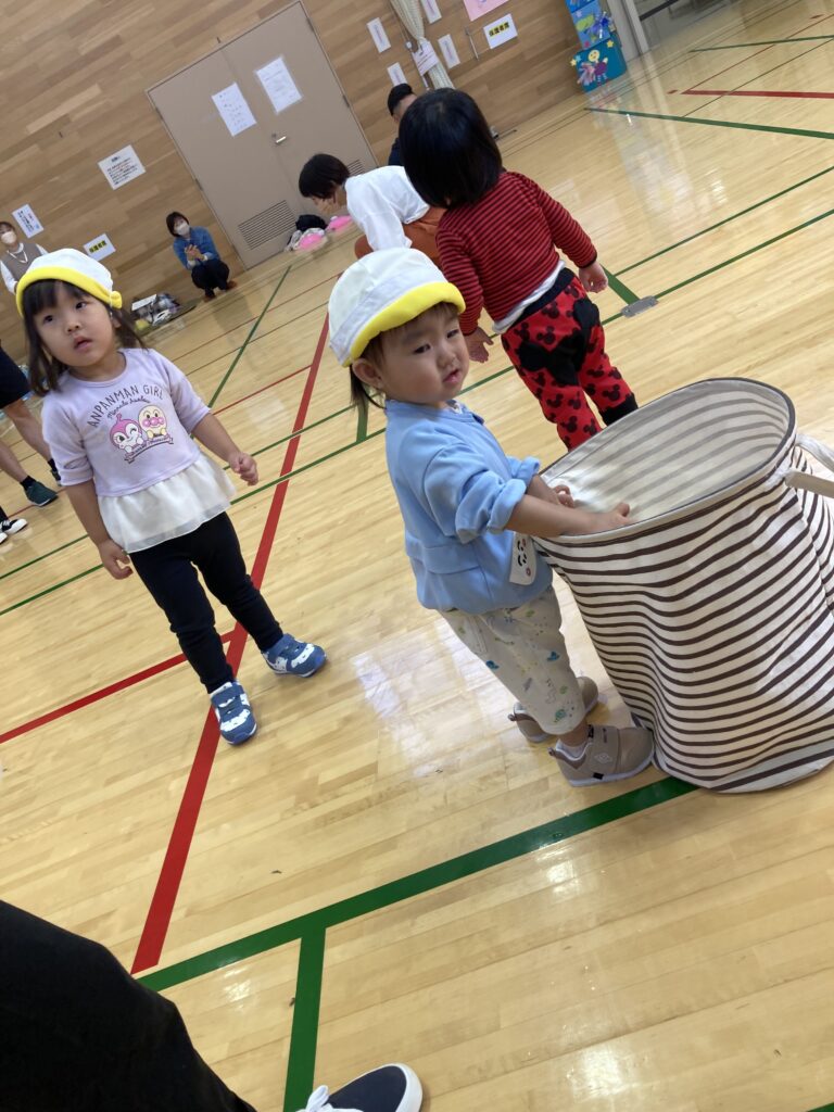 紫チーム?と白チーム⚪️に分かれて保育士の持つカゴに多く入れた方が勝ちです⭐️