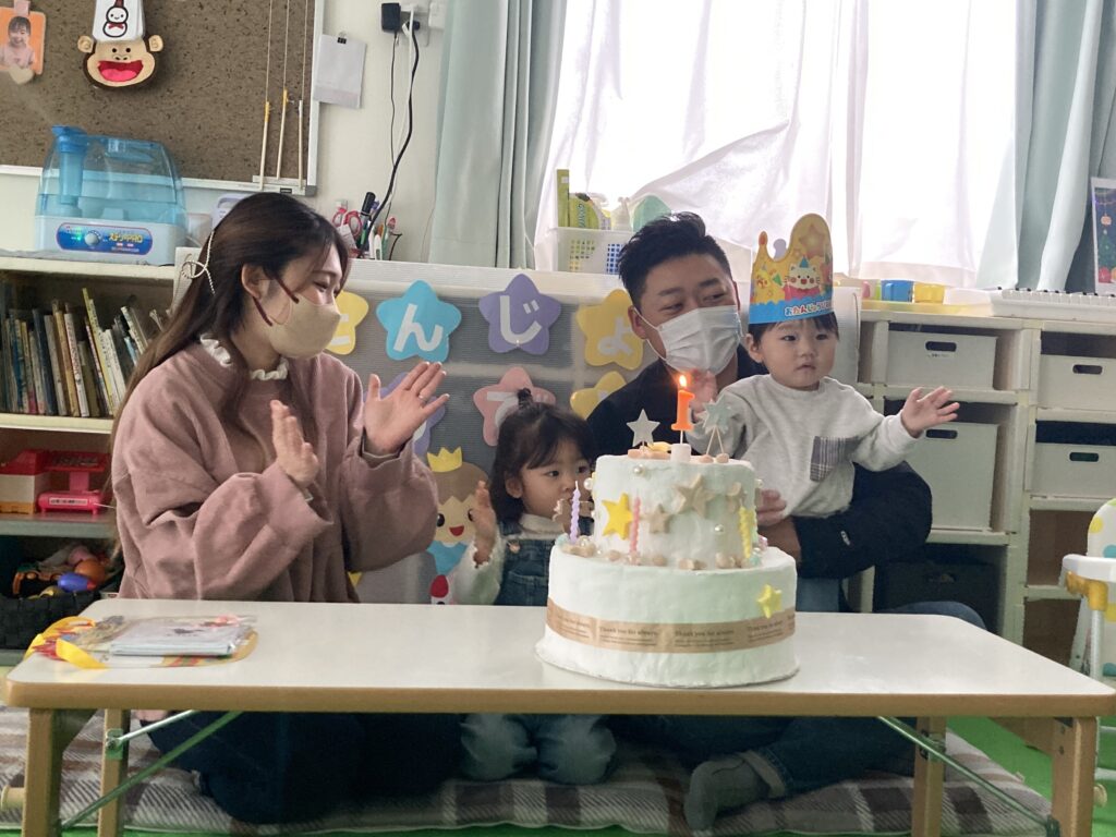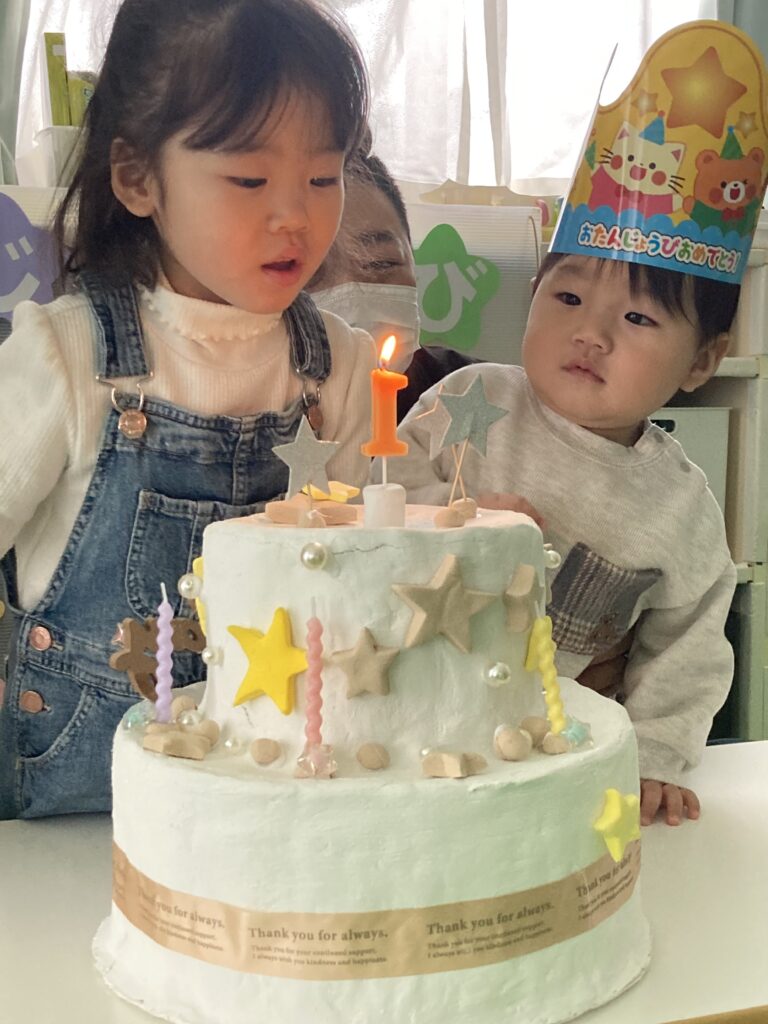 その後はみんなでハッピーバースデーを歌いお祝いです??ロウソク消しはY君の代わりにTちゃんがやってくれましたよ!不思議そうに見つめるY君、、、、?️