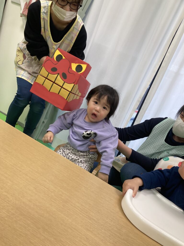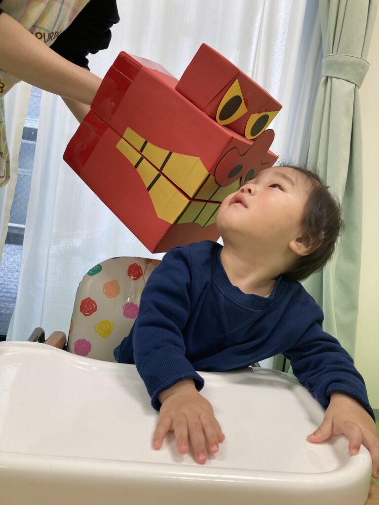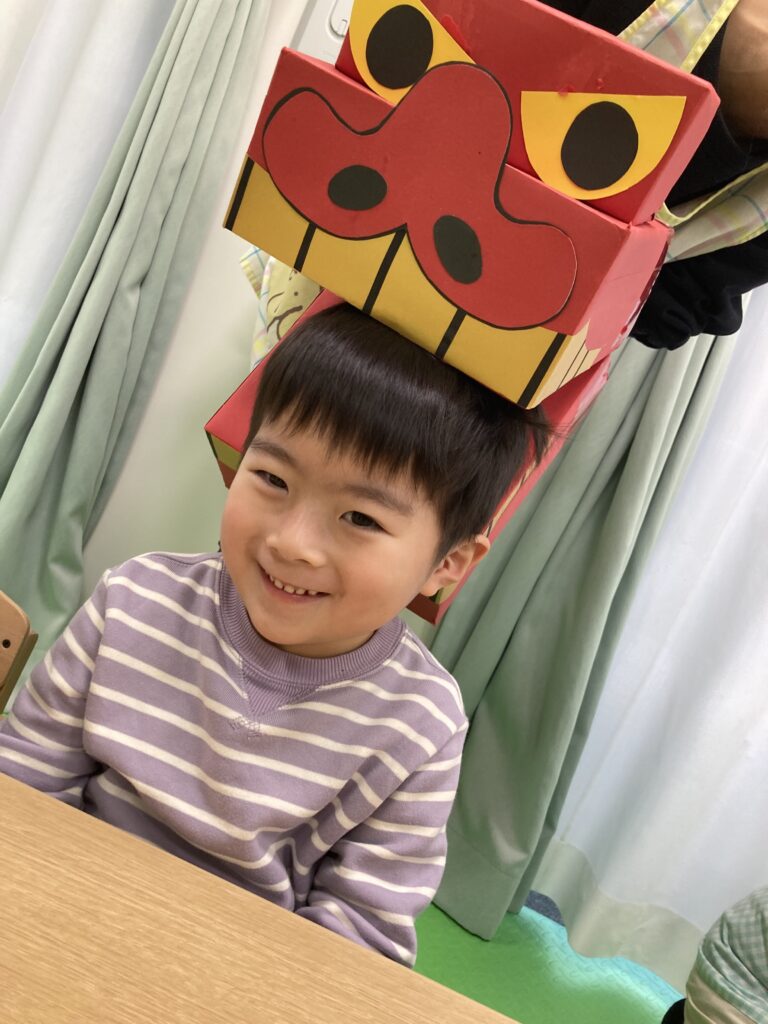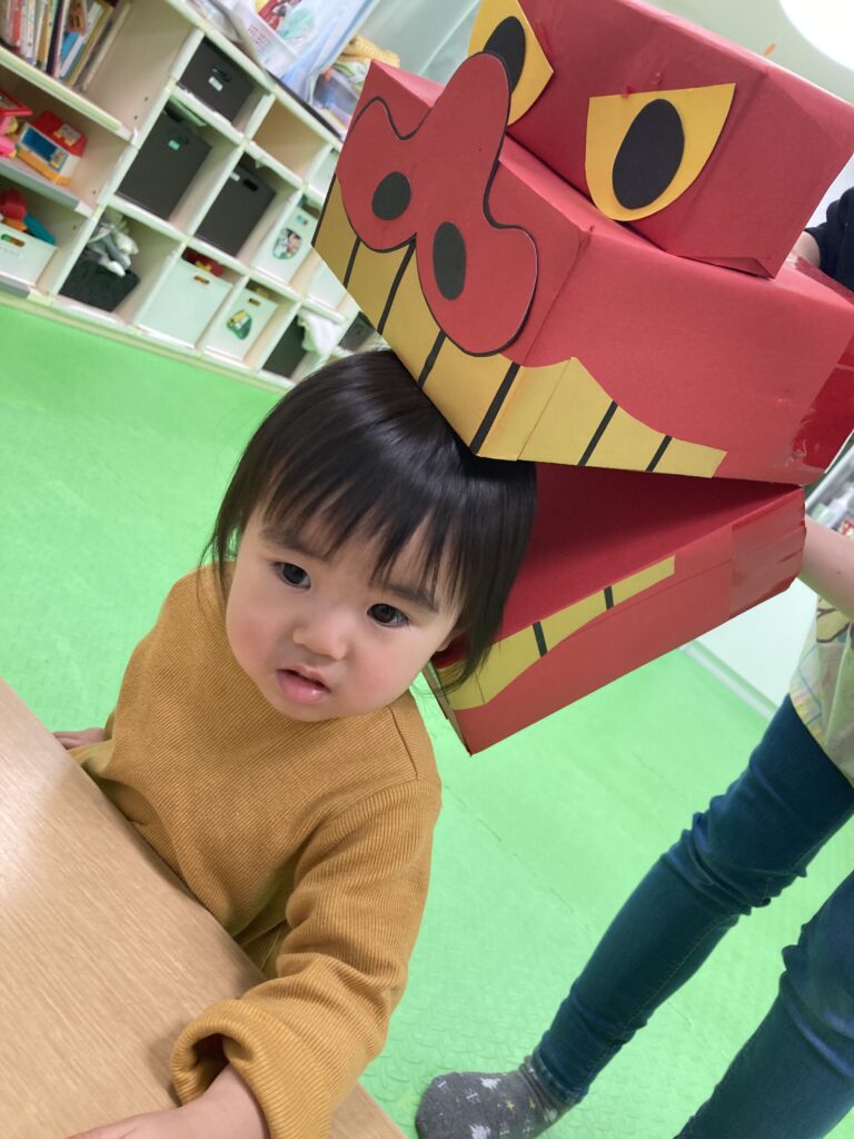 獅子舞に頭をガブっとしてもらい、今年1年も無病息災を願いました?初めは獅子舞に怖がっていたお友達も、この後一緒に遊んだりご飯を食べさせてくれるなどすぐに仲良しに??
