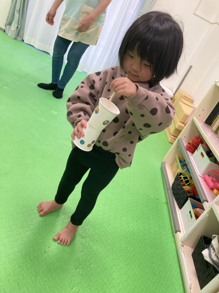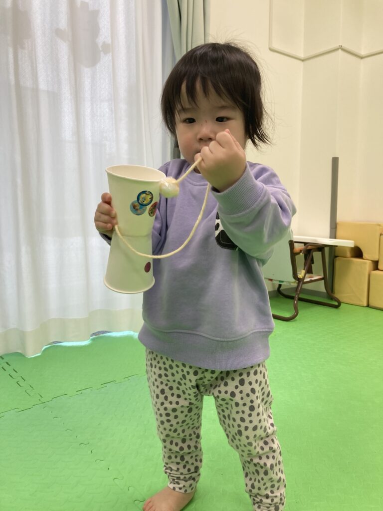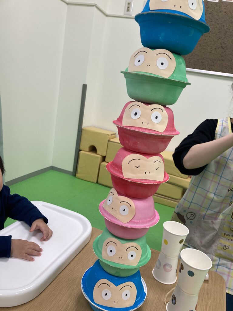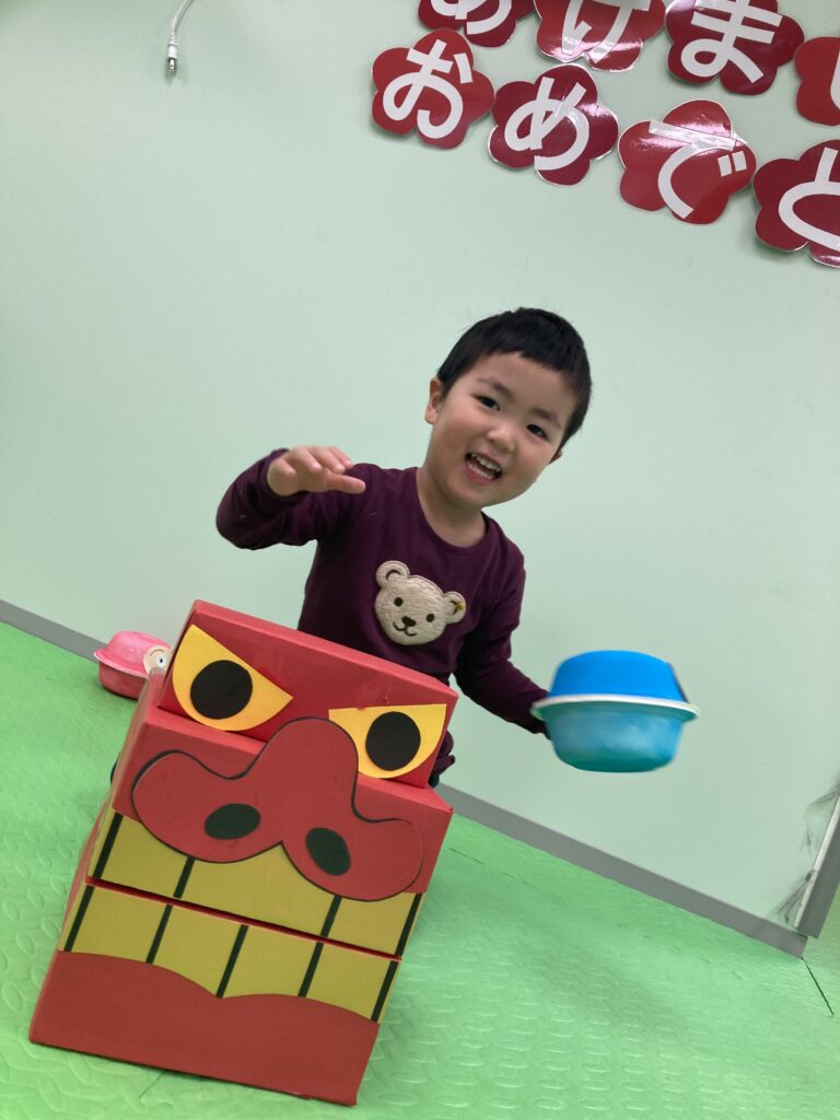 獅子舞に見守ってもらいながら、子どもたちはお正月遊びに挑戦してみました!今回準備したのは、だるまさんと紙コップけん玉と福笑いです?✨