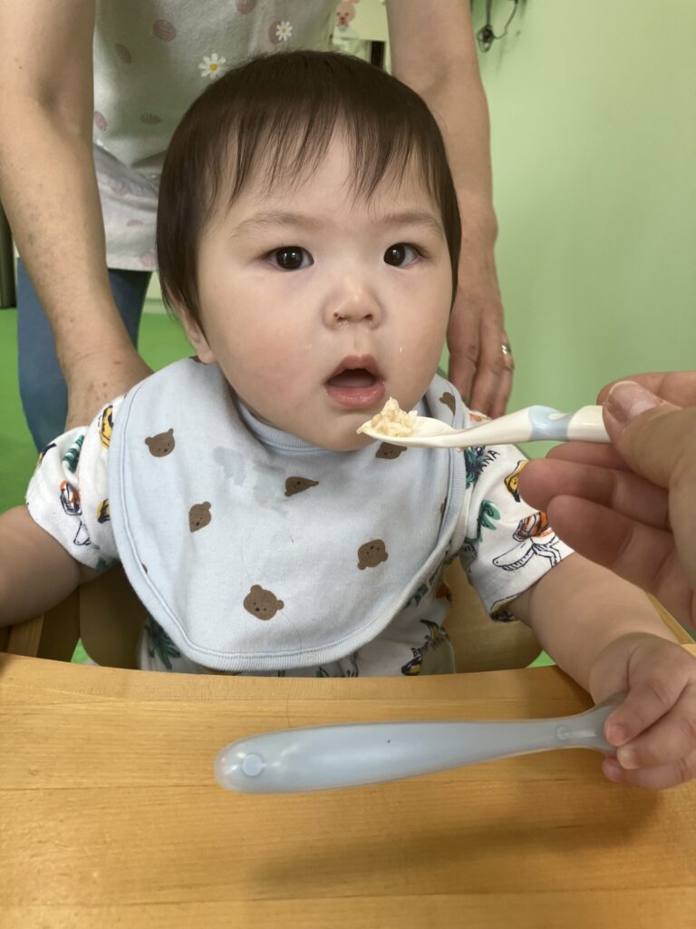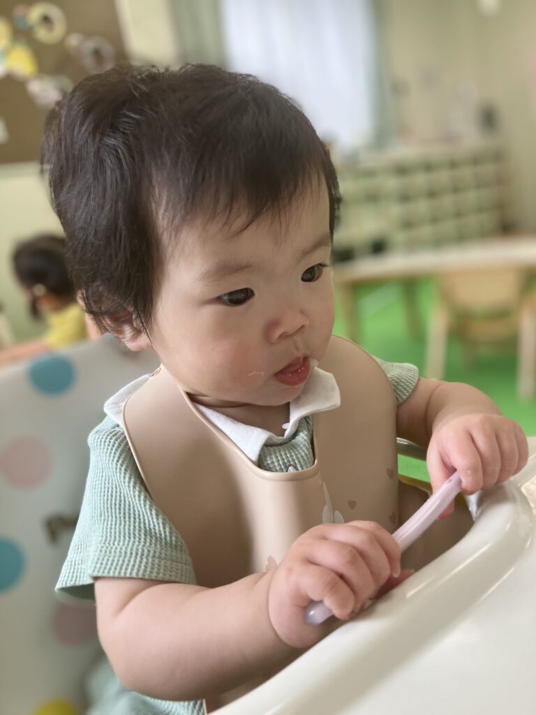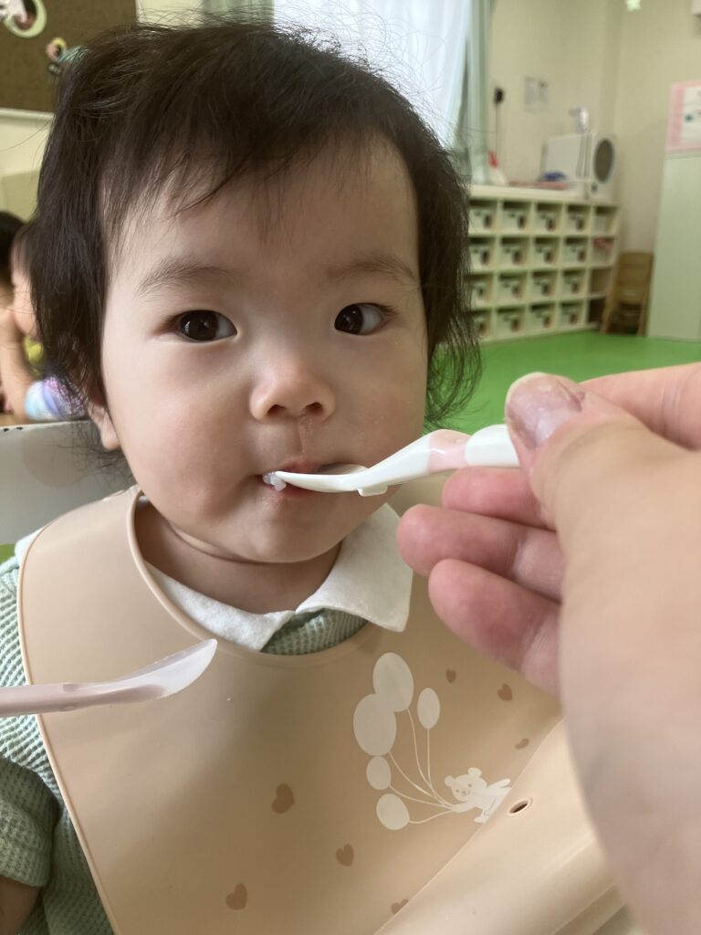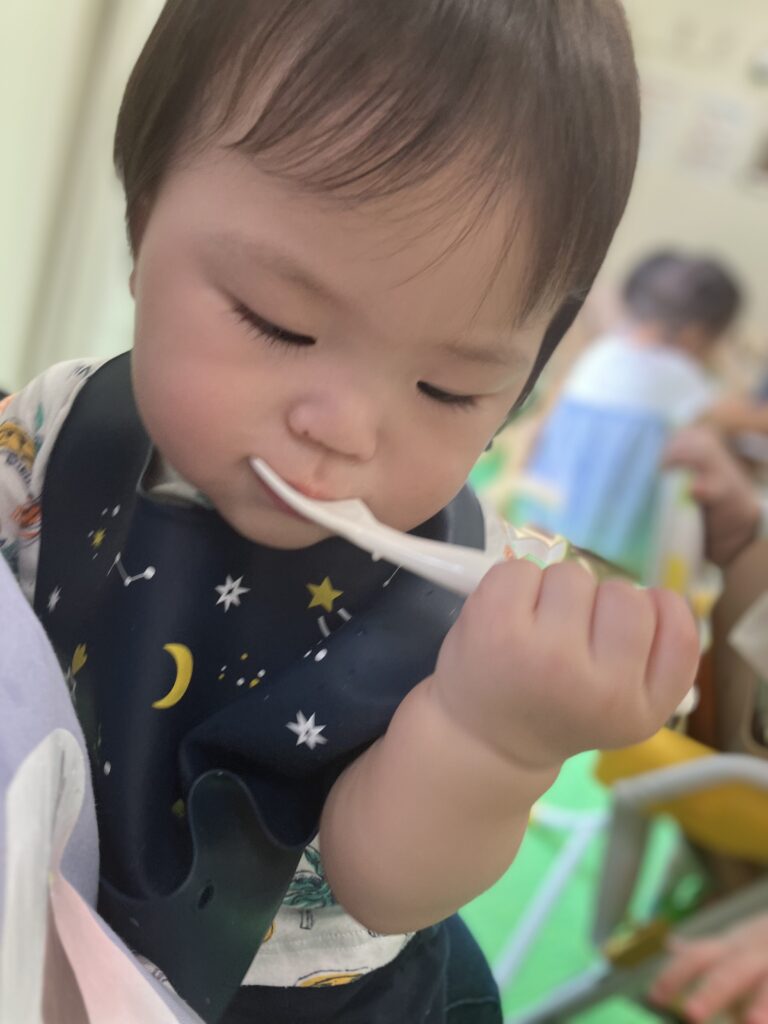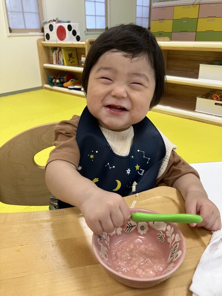 スプーンにも興味を持って、自分で持ったり口に運んだりしてニコニコ☺️
