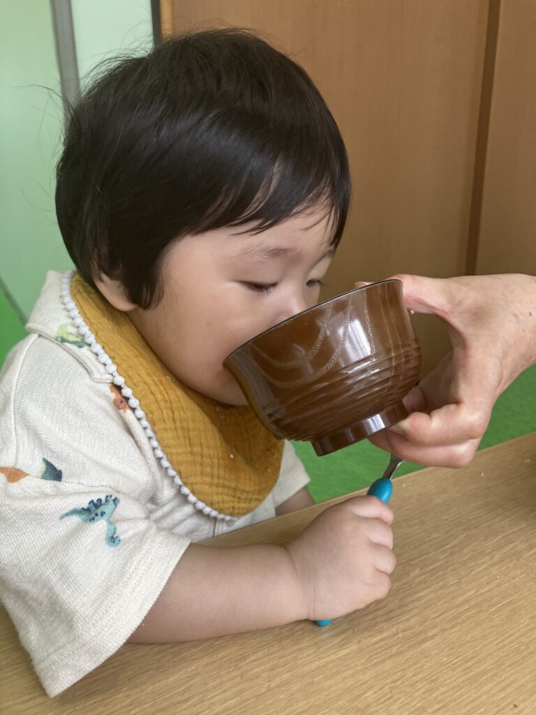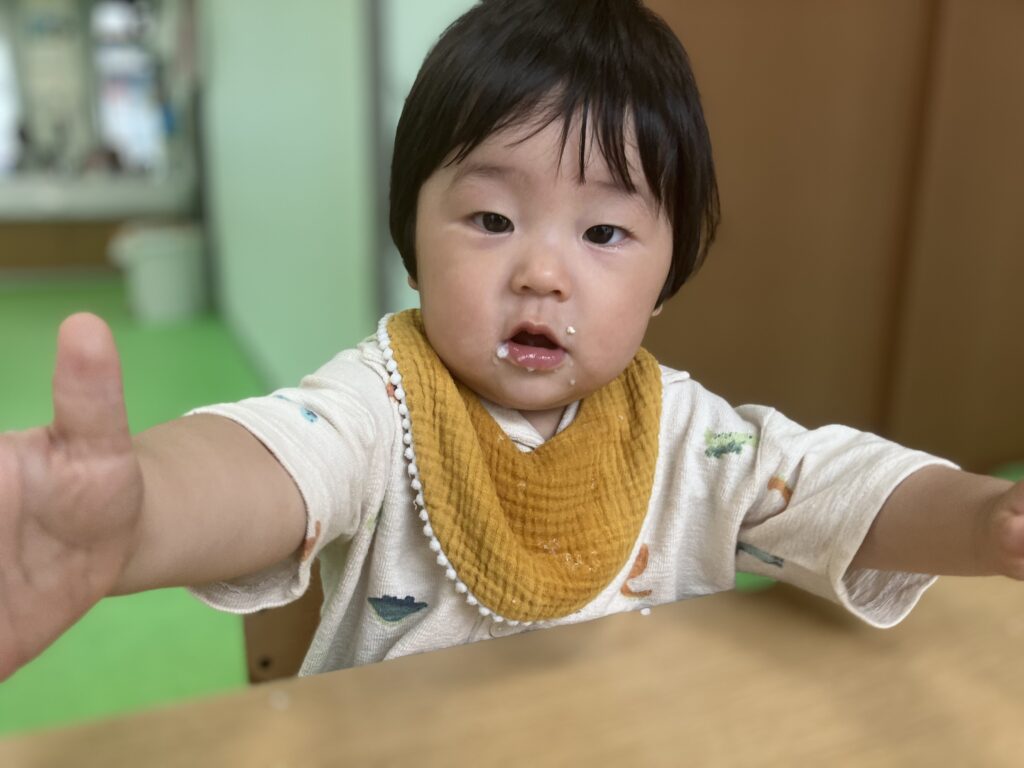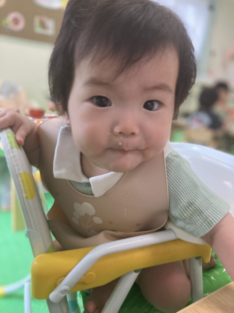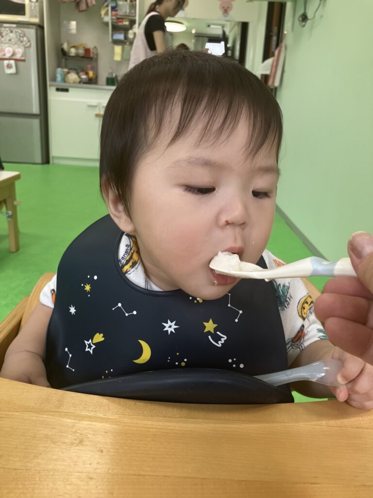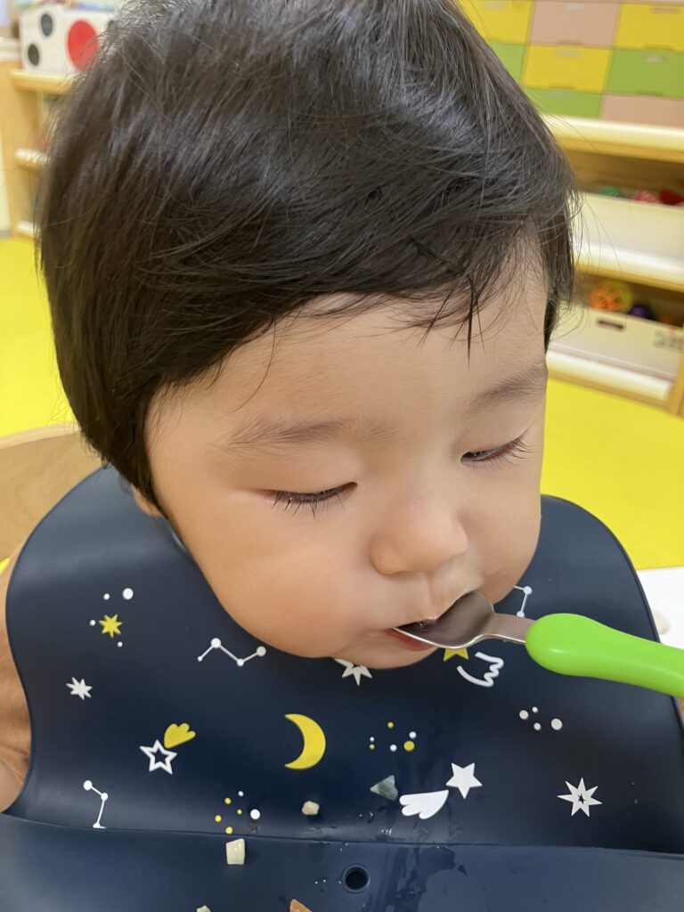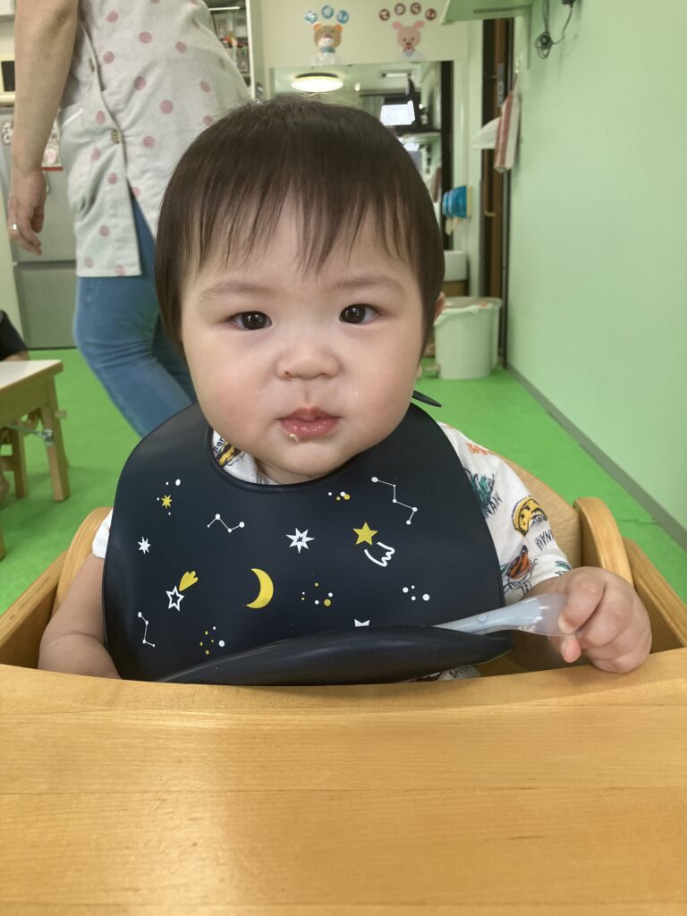 スプーンにも興味を持って、自分で持ったり口に運んだりしてニコニコ☺️
