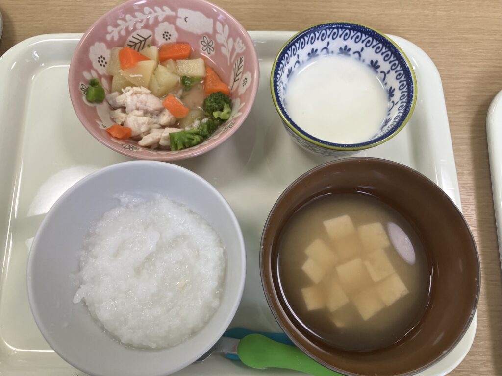 今日のメニューは、おかゆ/鶏肉と野菜の煮物/味噌汁/ヨーグルトです🍴