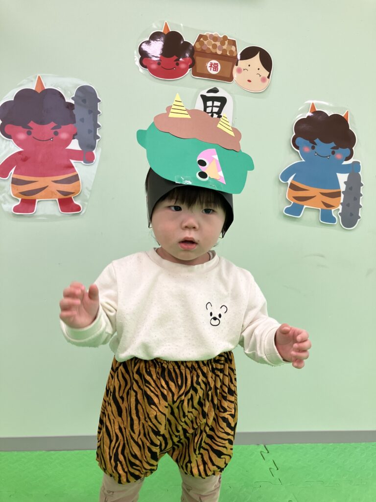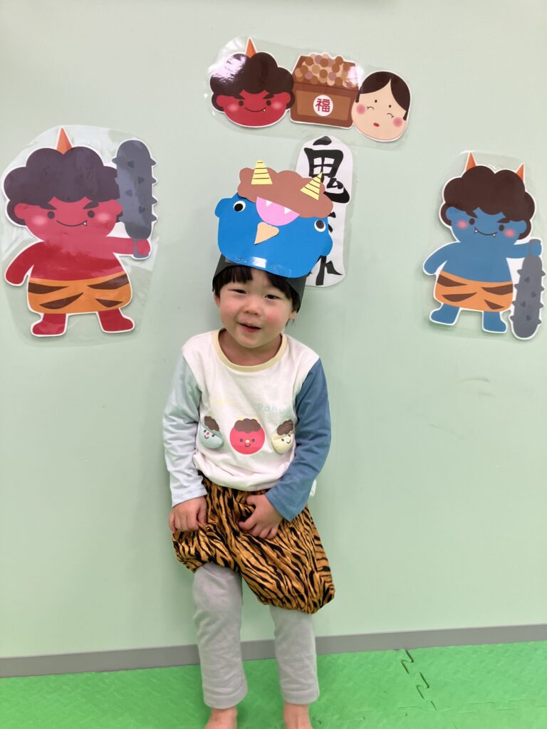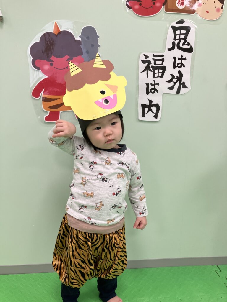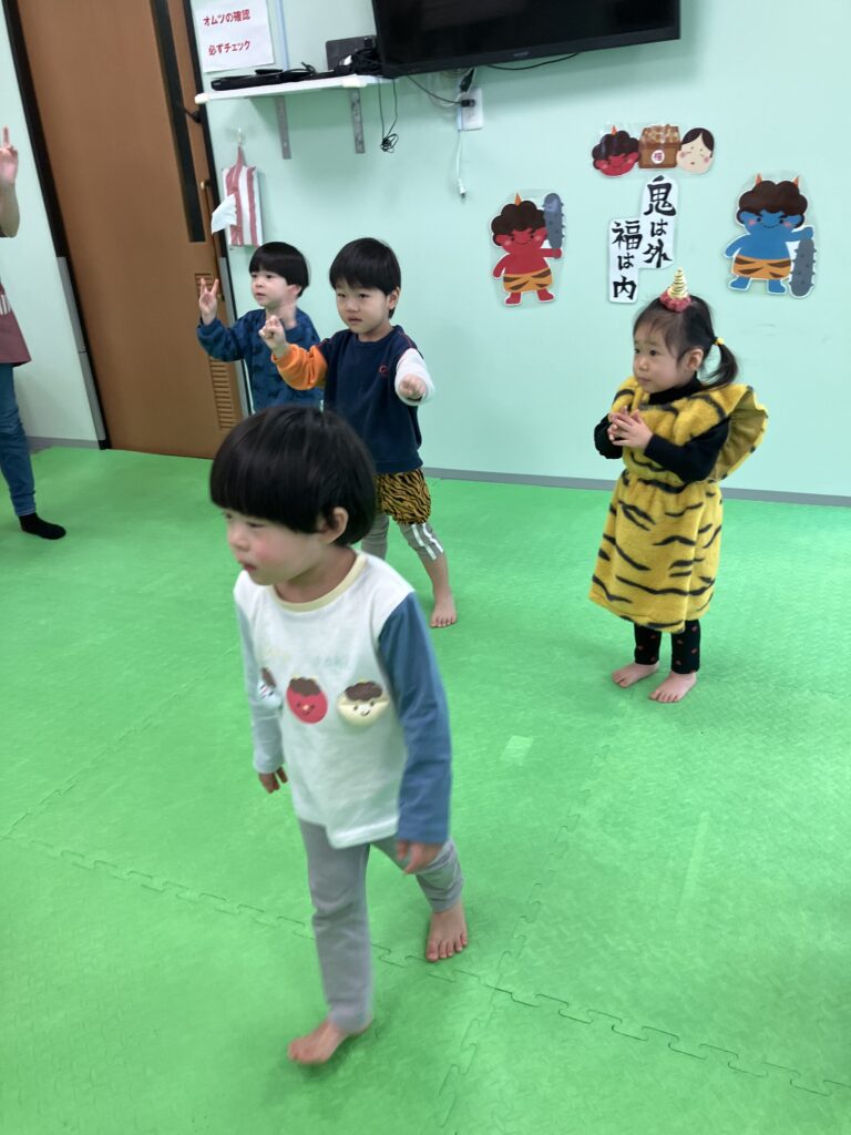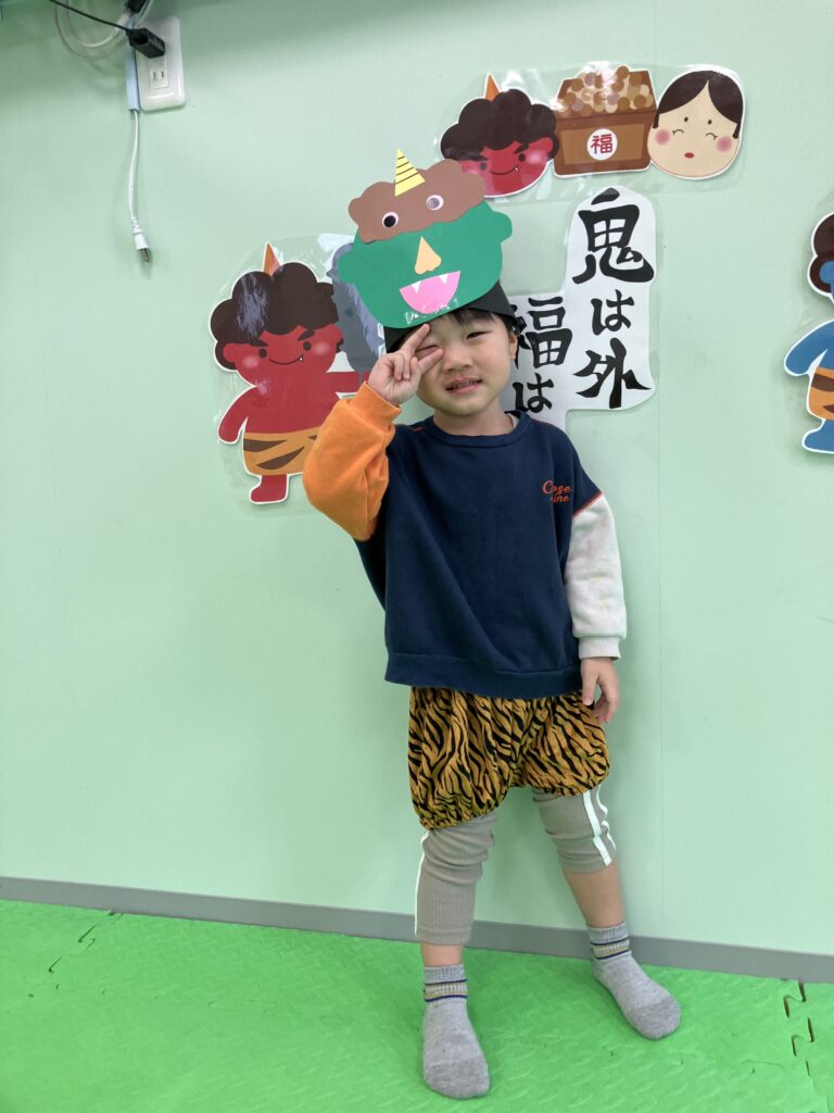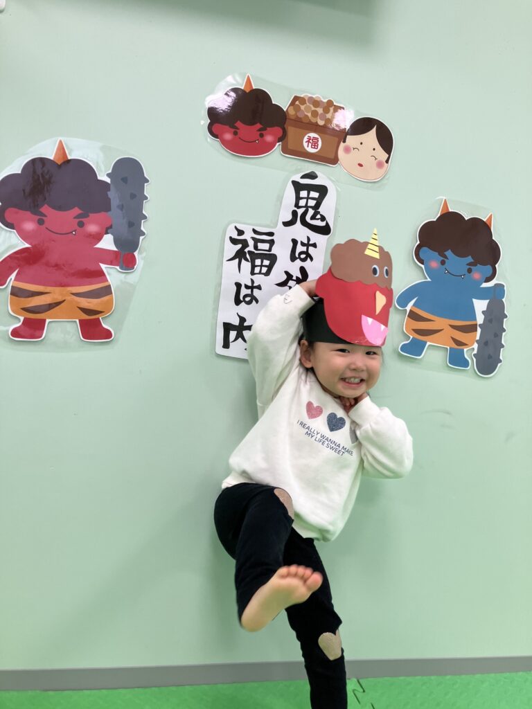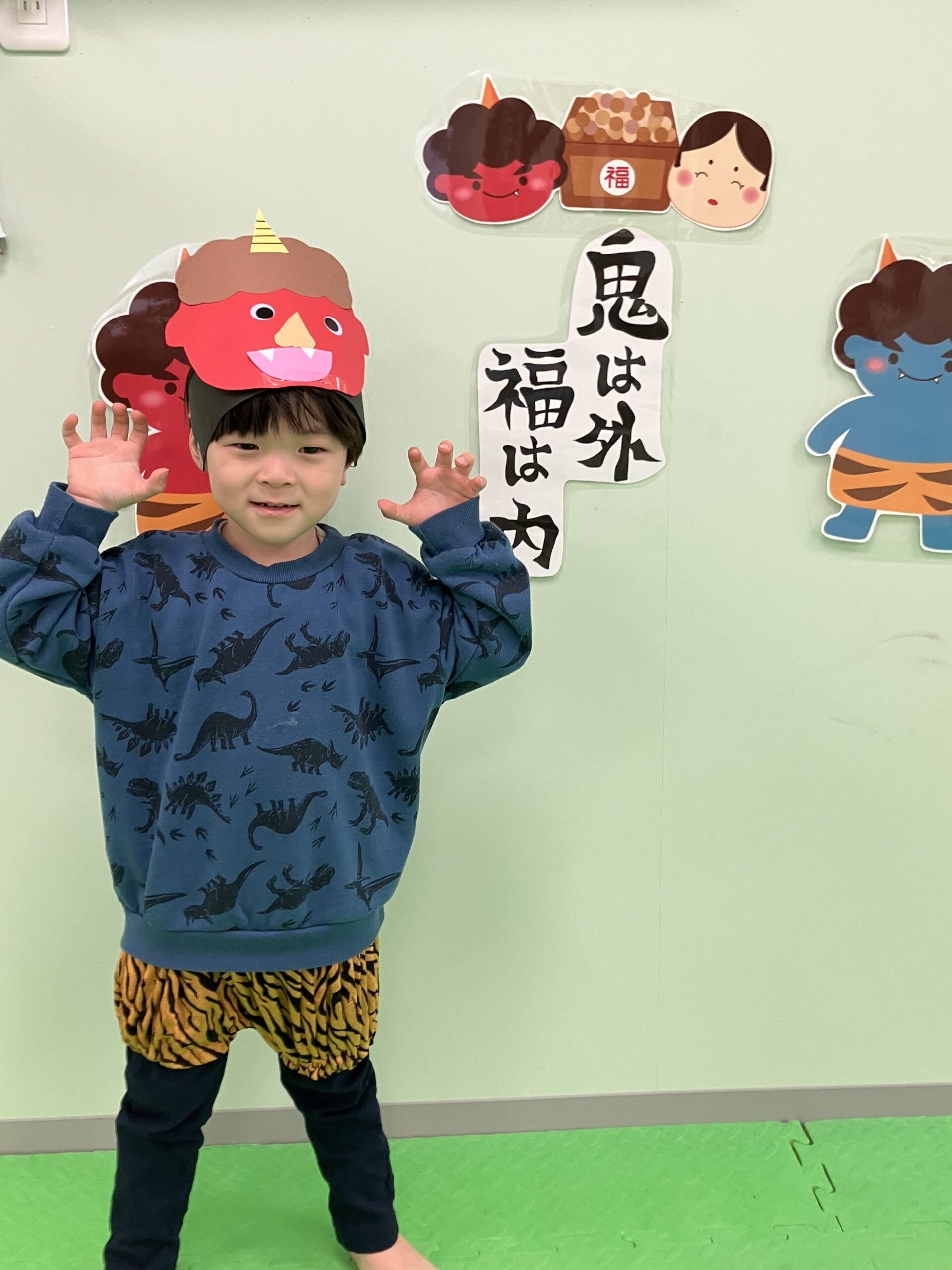 昨日は豆まきごっこをして、「夜は早く寝てパワーをためてきてね💪」「うん!」と、