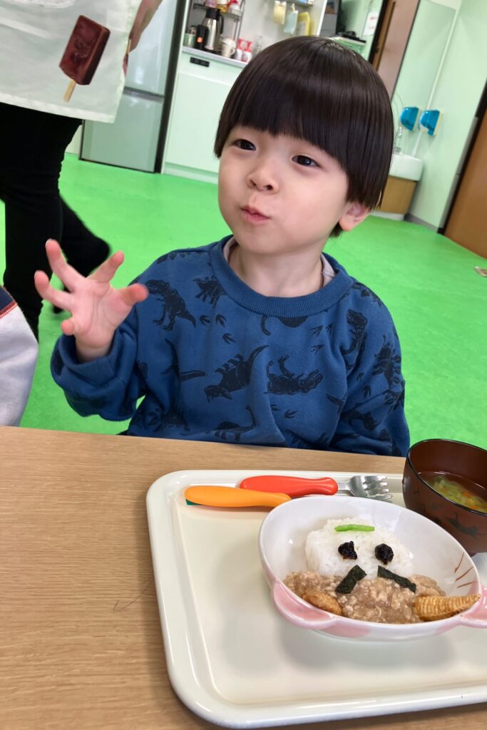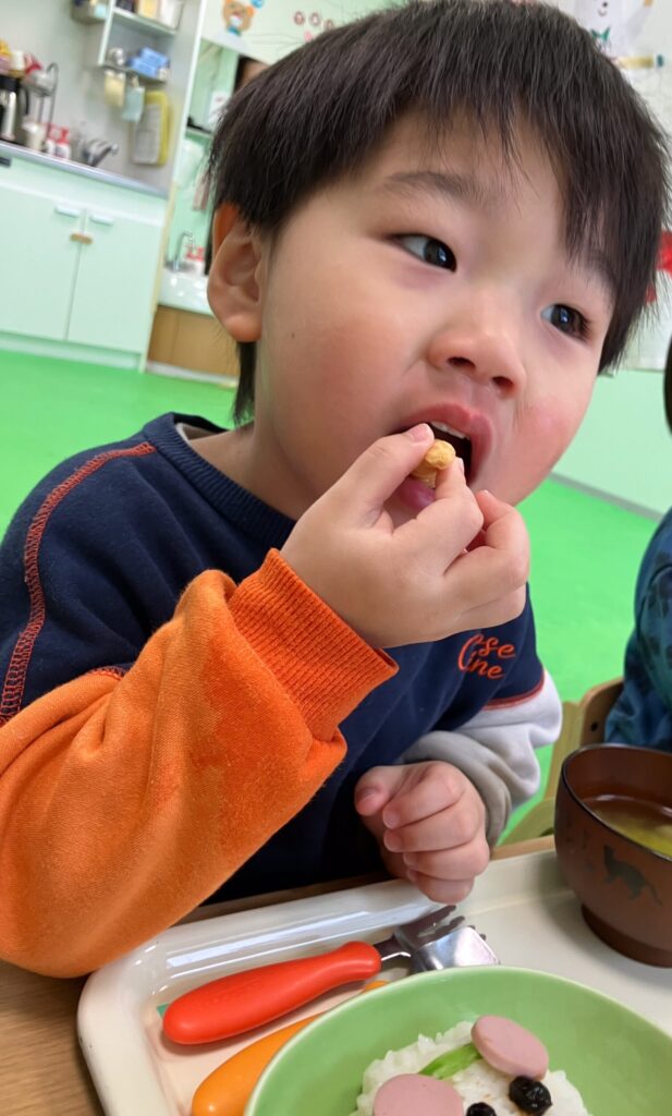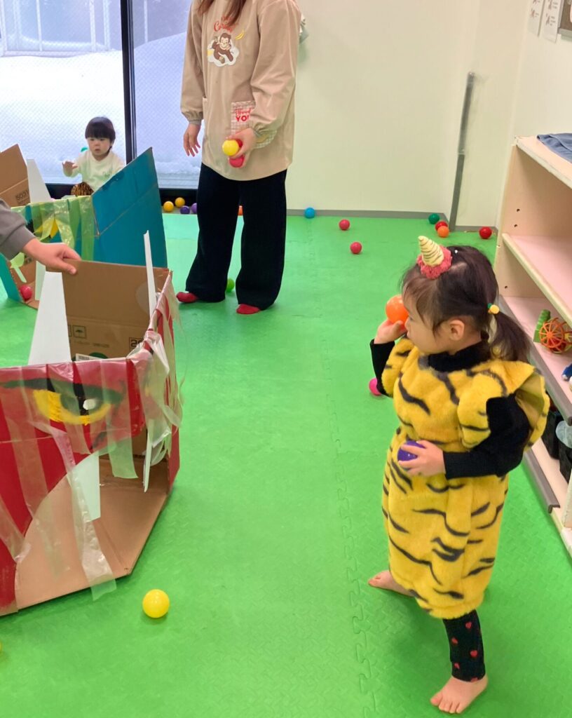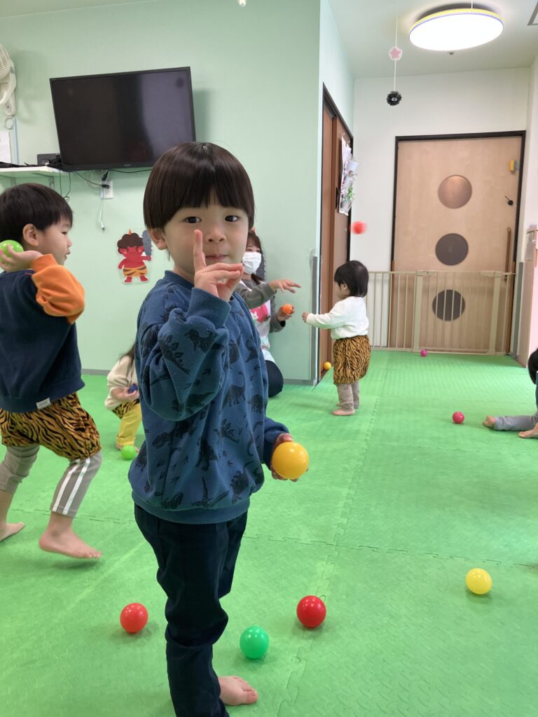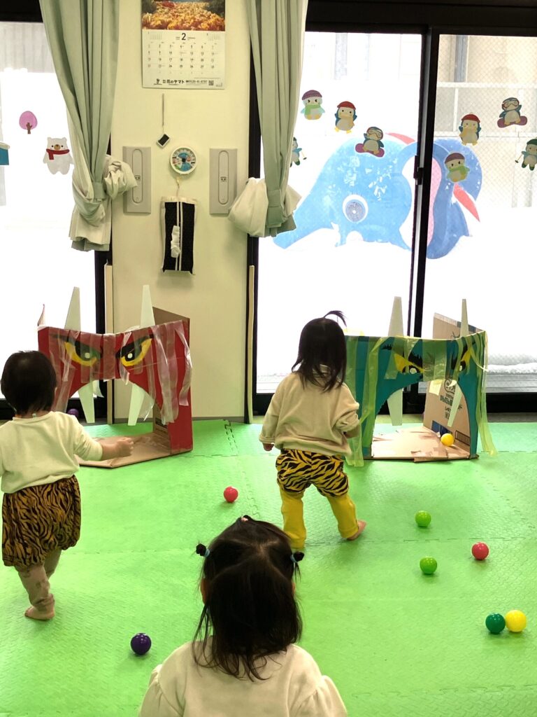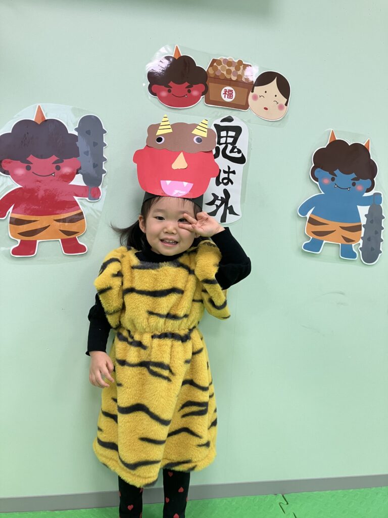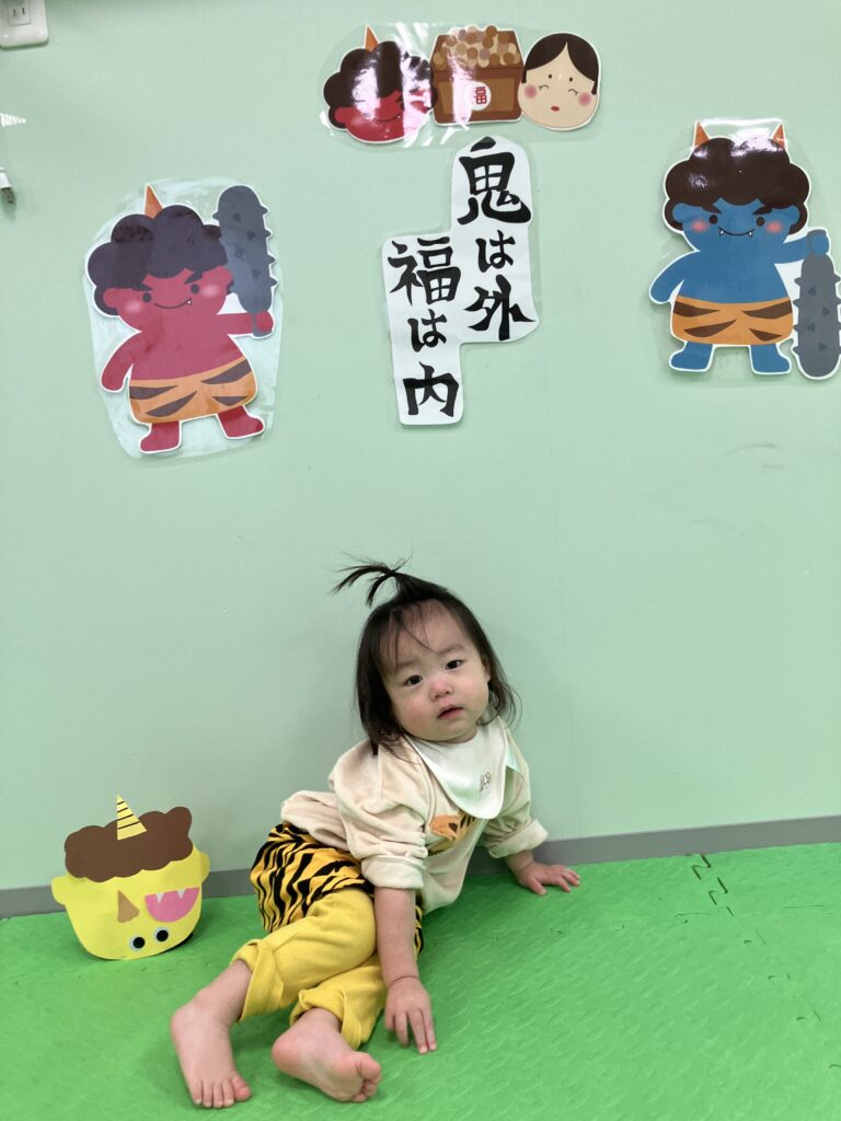 昨日は豆まきごっこをして、「夜は早く寝てパワーをためてきてね💪」「うん!」と、