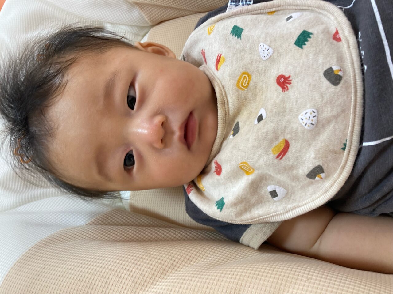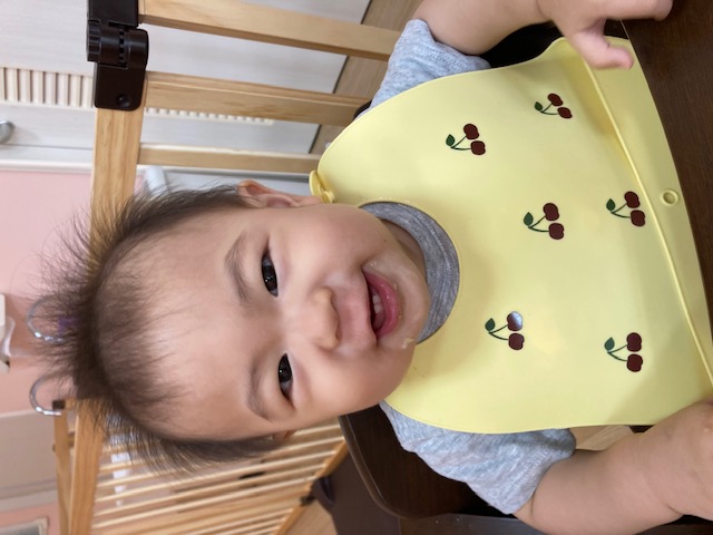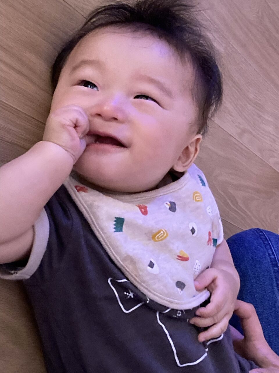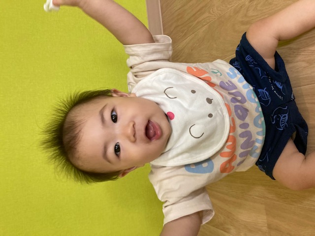 腹ばいになると、自分の力で長い時間、顔を上げたり、近くにあるおもちゃを手に取ったりして少しずつ探索を楽しんでいます?