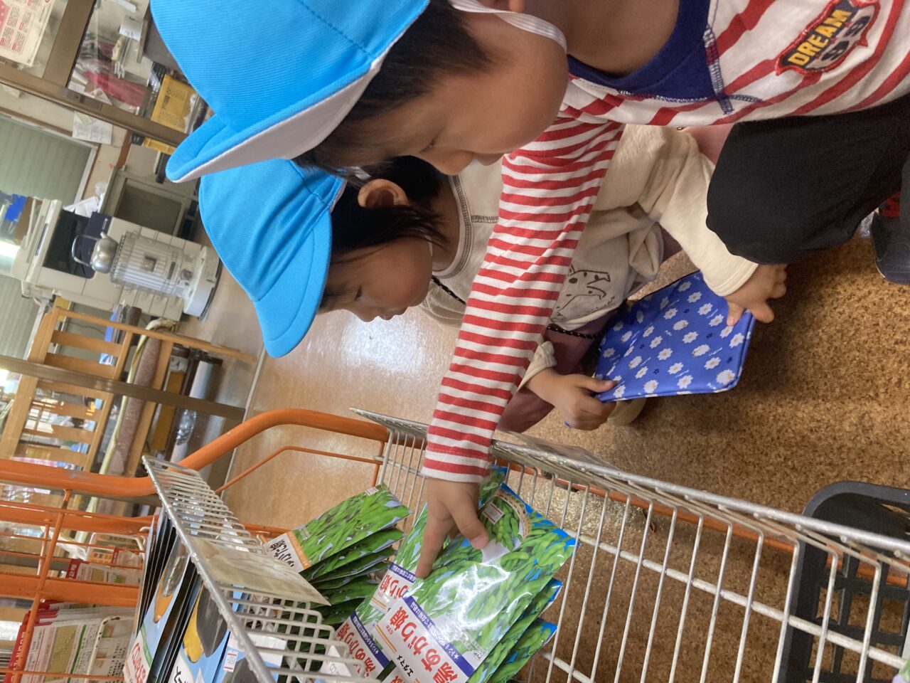 苗屋さんにはいろんなお野菜の苗が並んでいて、どれにしようかなあ〜と興味津々でした✨買い物カゴに苗を入れたり、お金を払ったり、子どもたちの連携もバッチリでした?戻って早速種まき&苗植えスタートです??