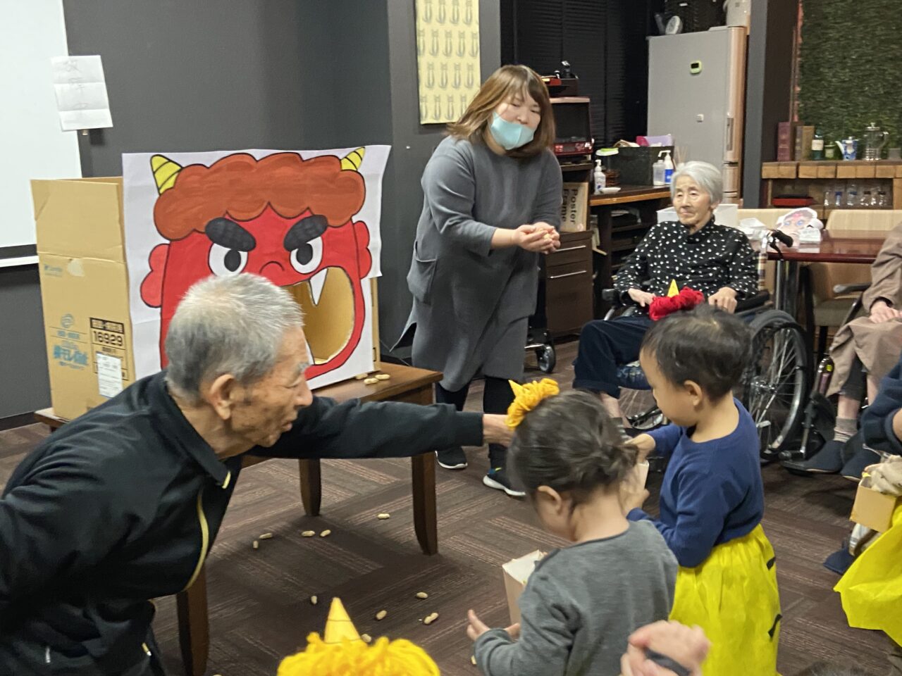 中には、鬼の口に一粒ずつ豆を入れてあげているお友達も・・・?