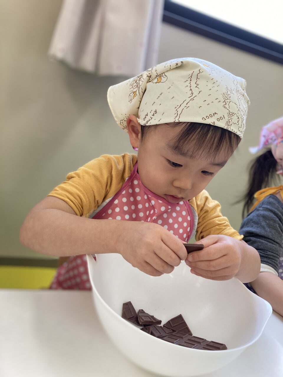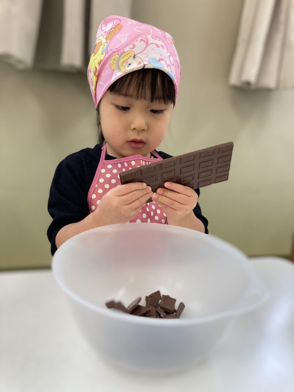 最初は、チョコレートを割る係とバターを入れる係に分かれて作業していきます?