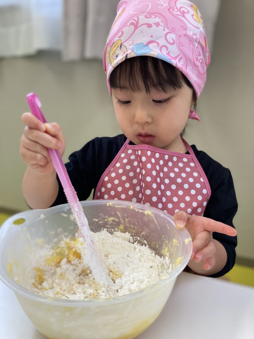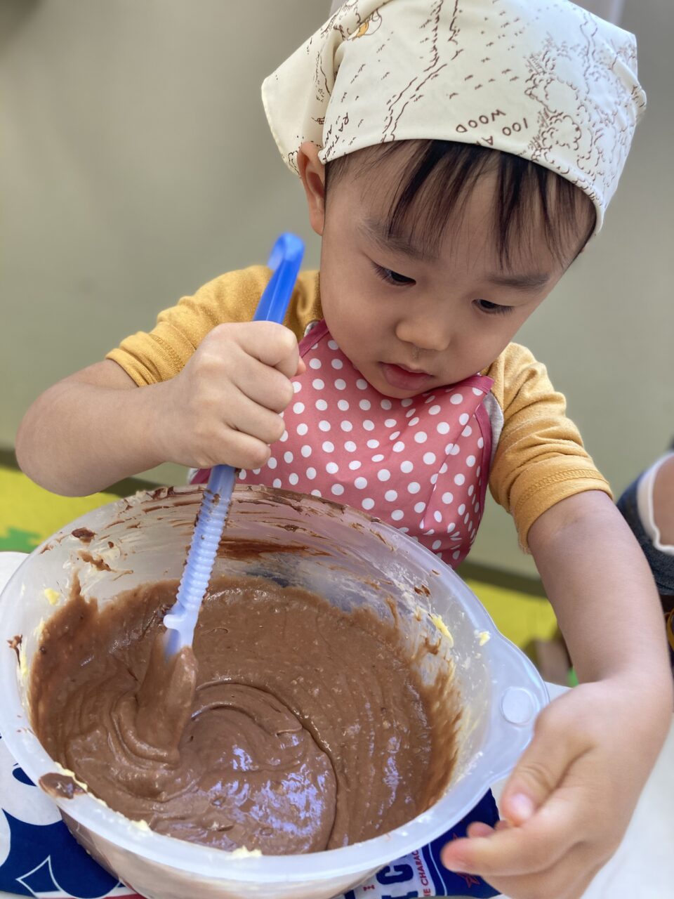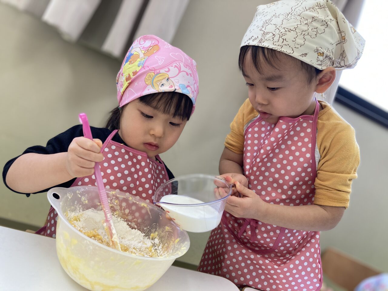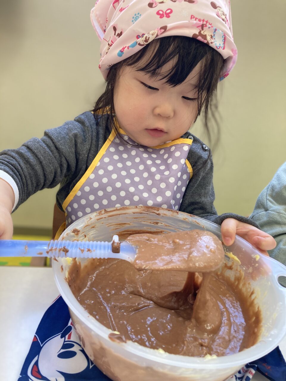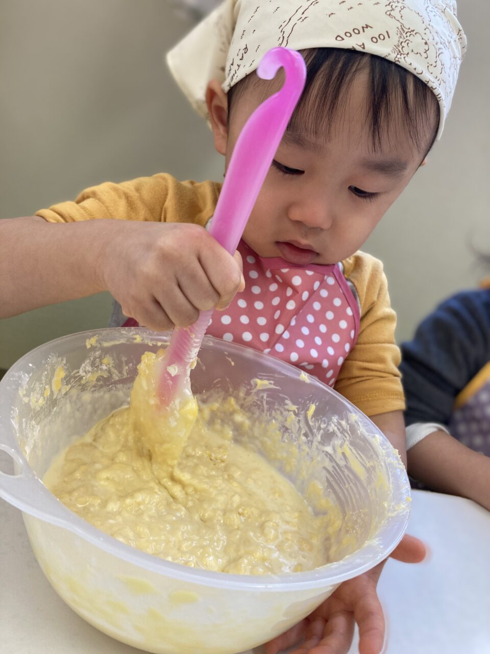 次は、ホットケーキミックスや牛乳、卵などを入れて混ぜます??
