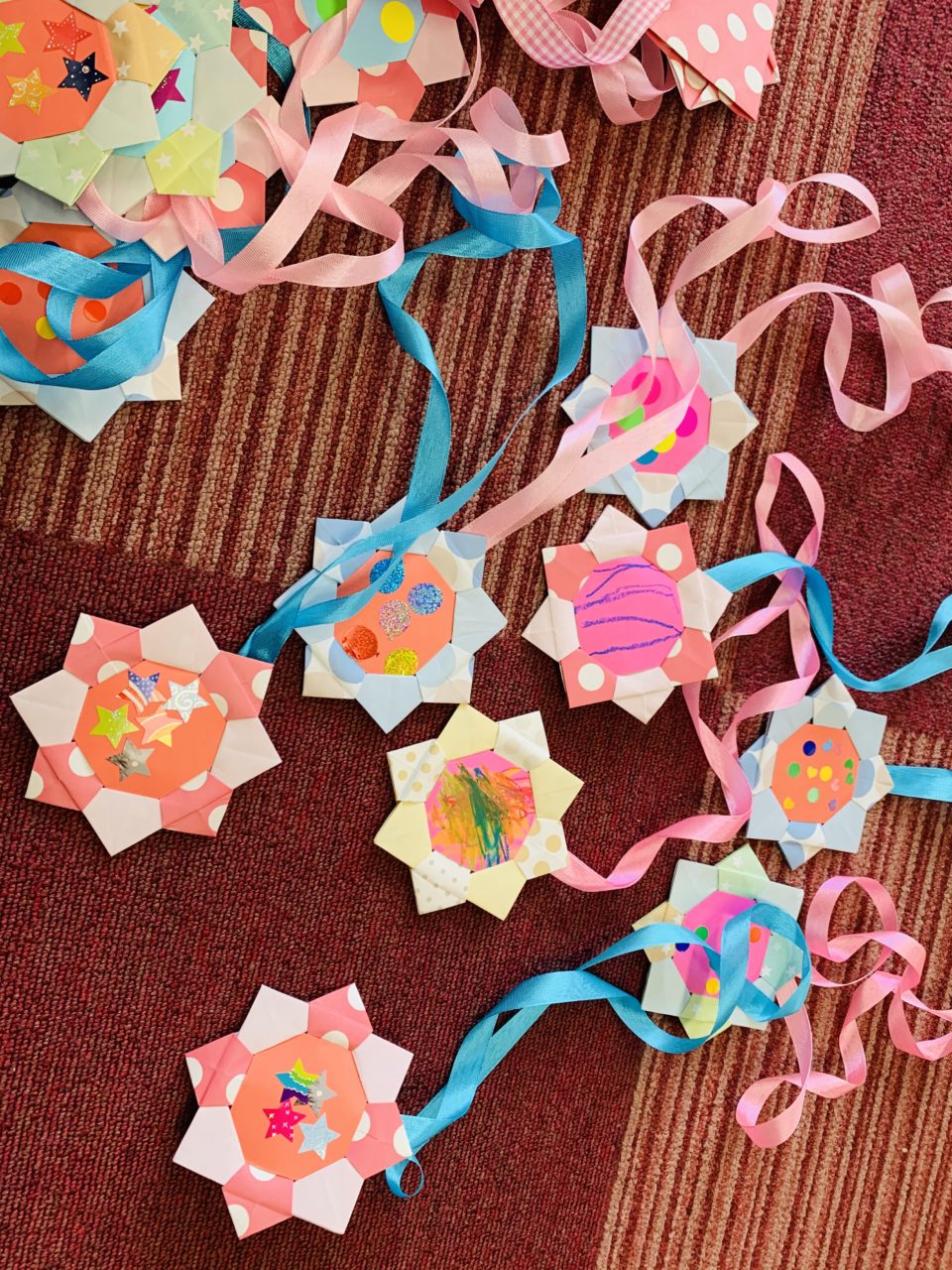 保育士が折った折り紙の真ん中に、子ども達がシールを貼ったり、お絵描きをして仕上げてくれました?