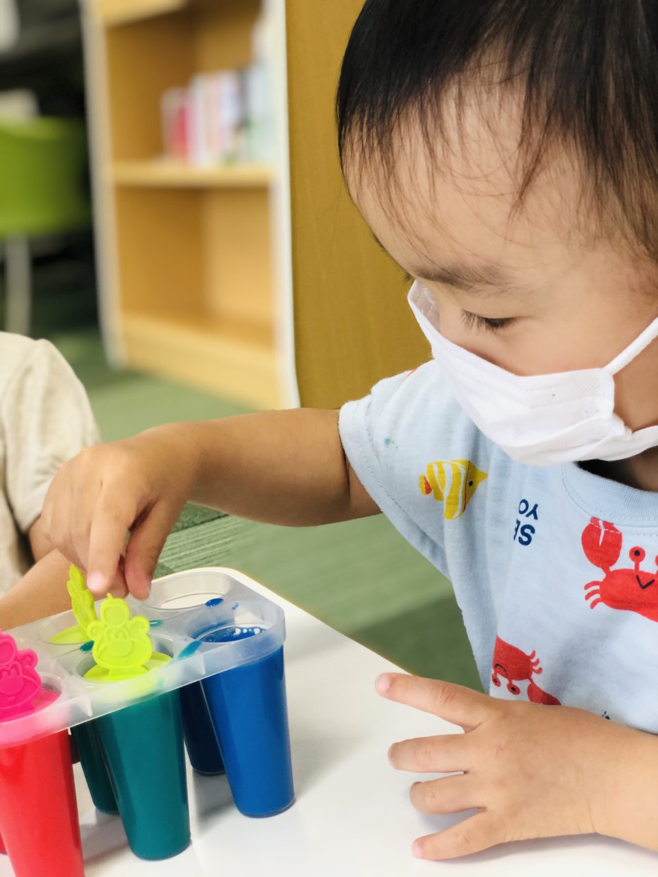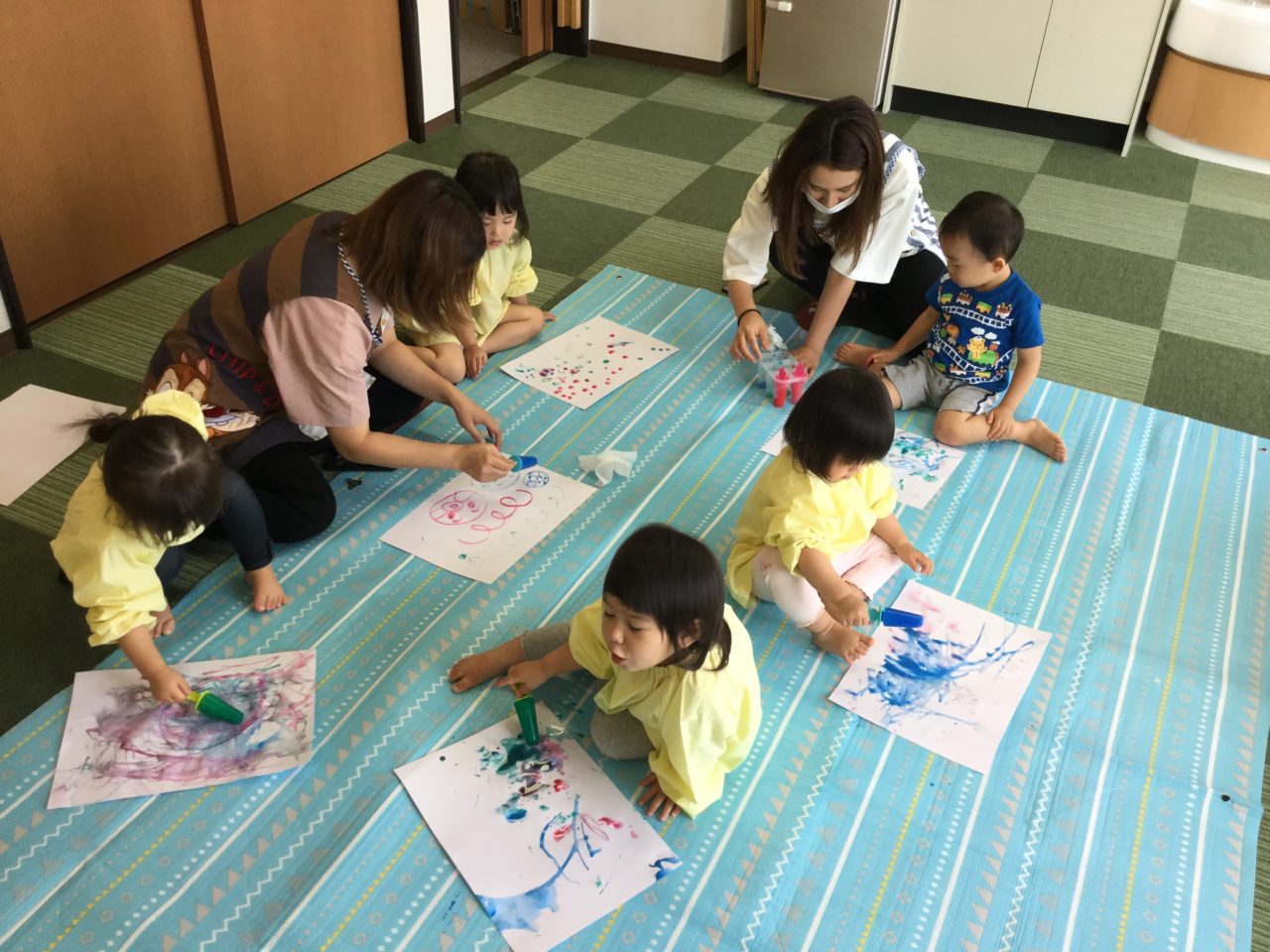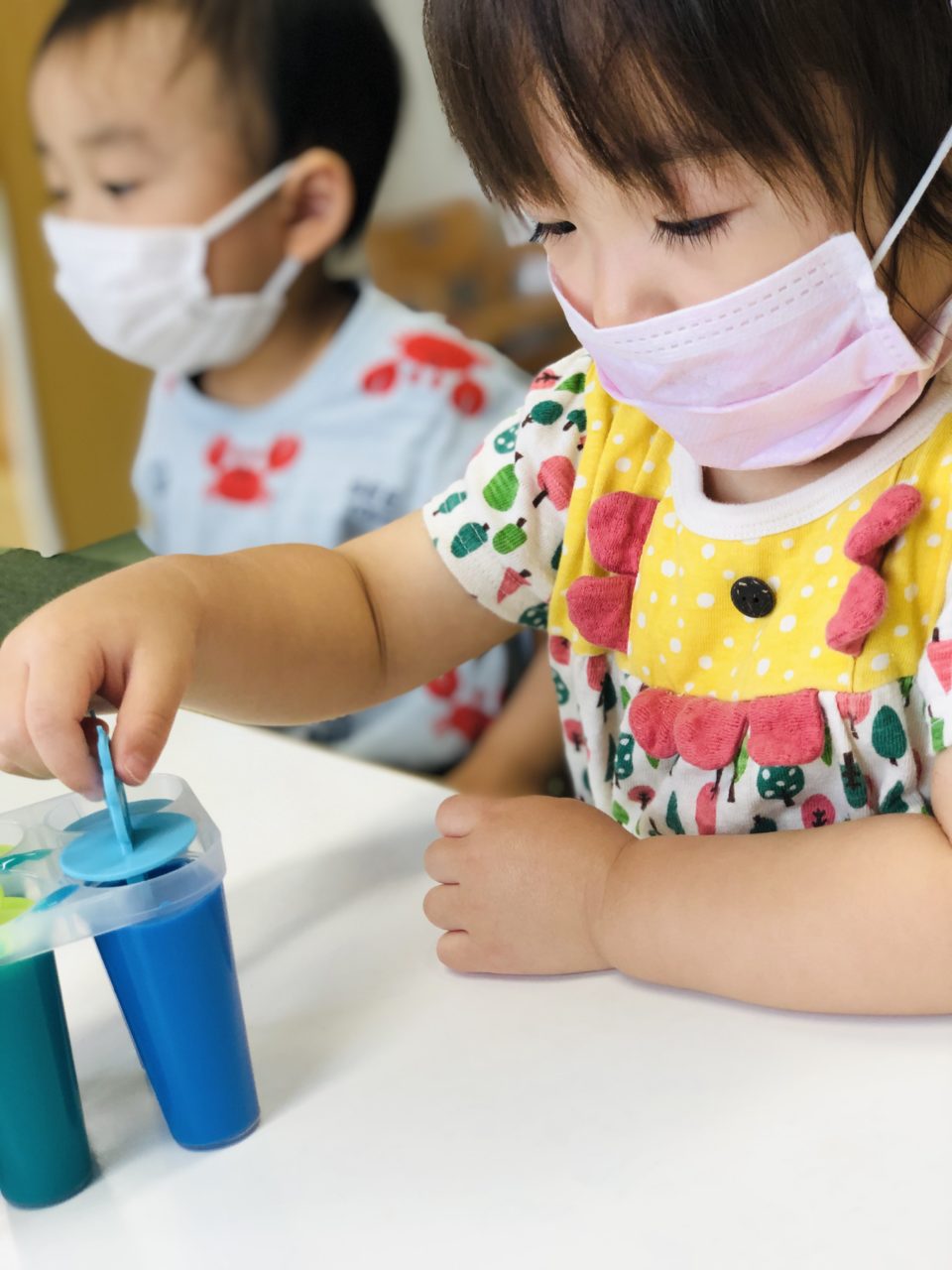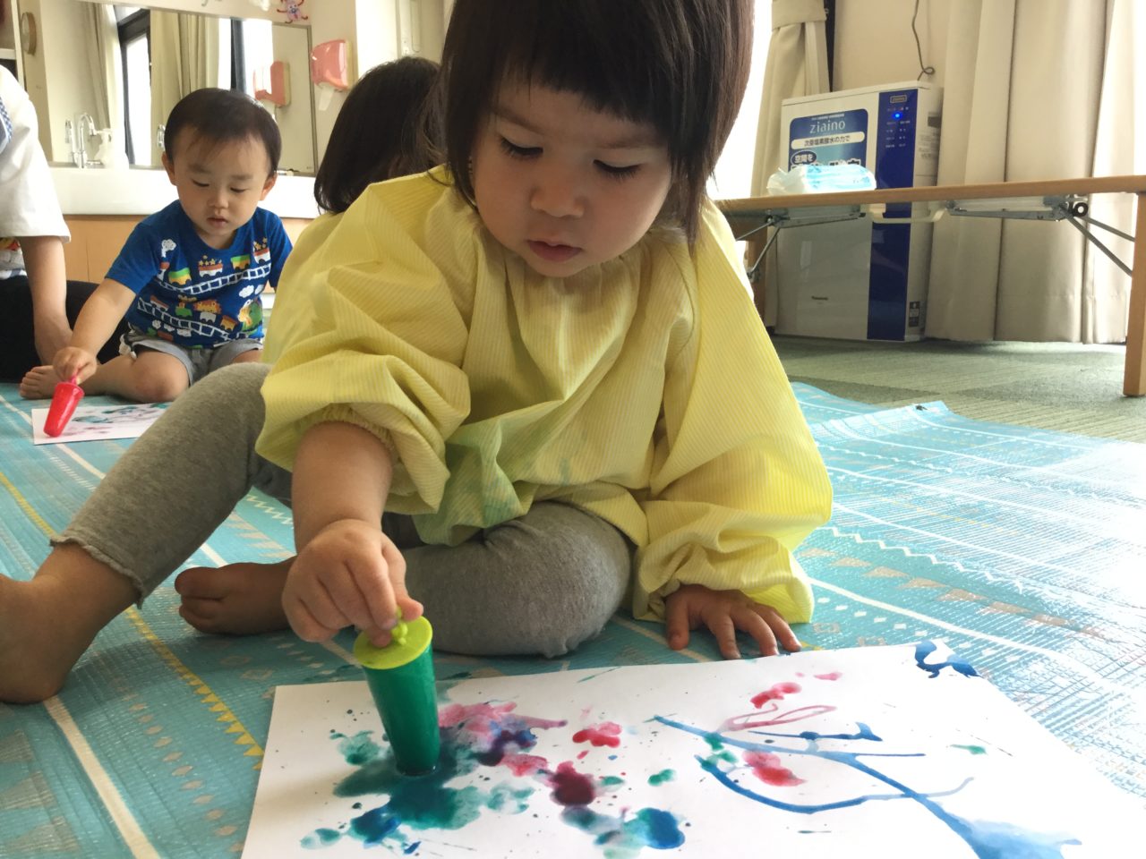 色がつく氷に不思議そうにしている子どもたちでしたが、氷を筆の代わりにして夢中で取り組んでいました!!