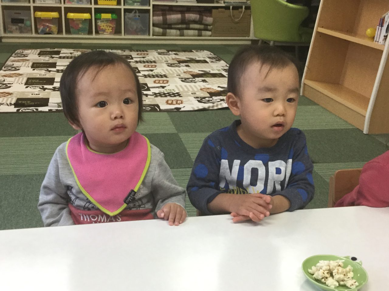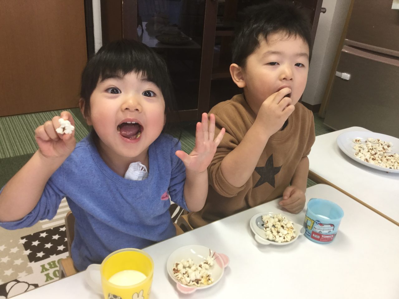みんなでおやつの歌を歌ってから、出来たてのポップコーンをおいしくいただきました!?