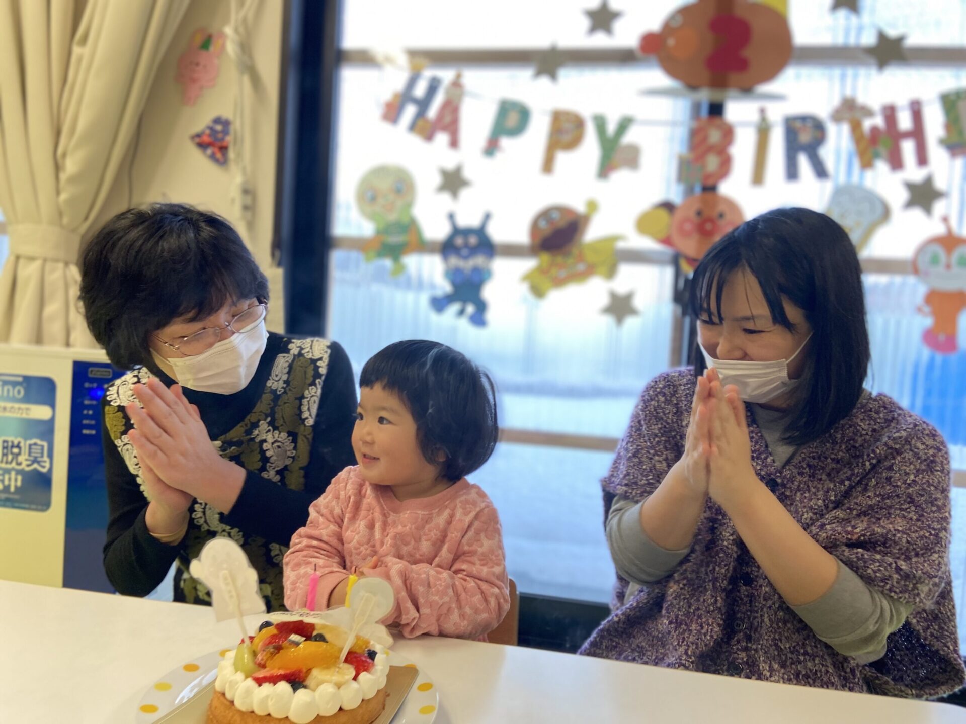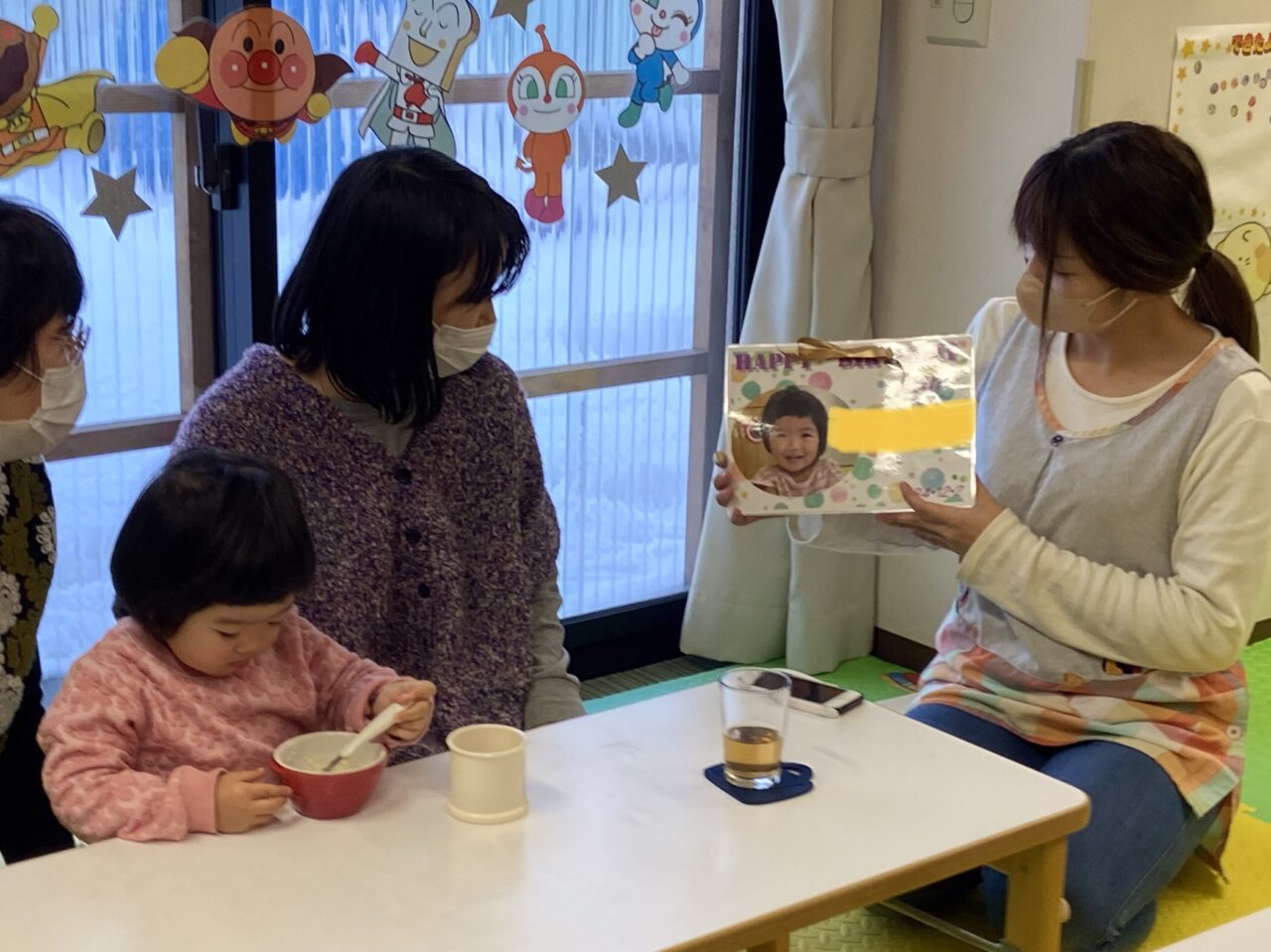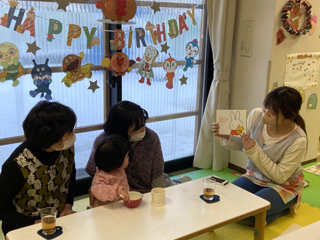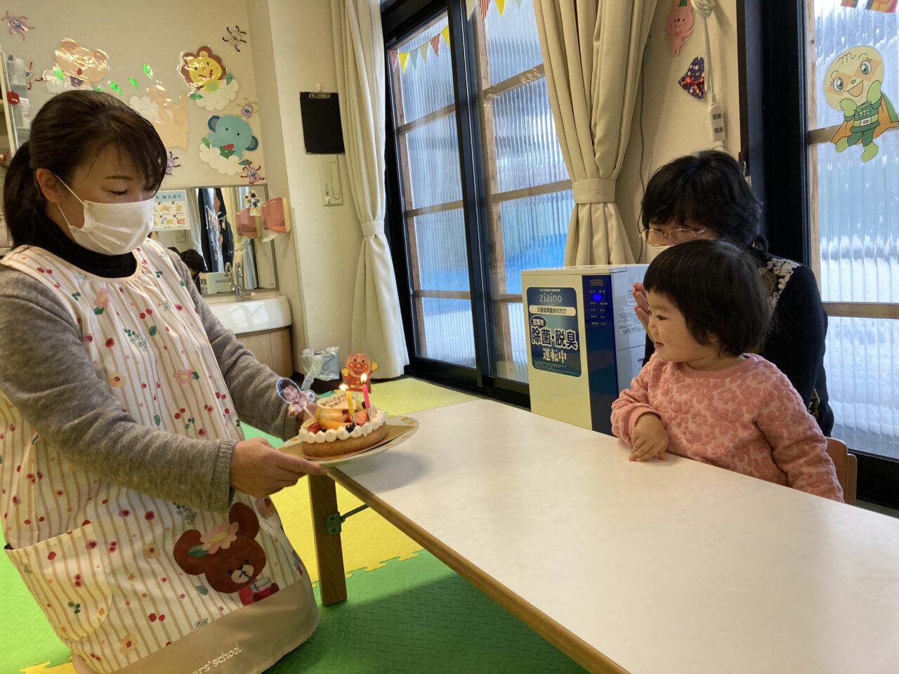 保育士とお友達からお誕生日の歌のプレゼントが終わると