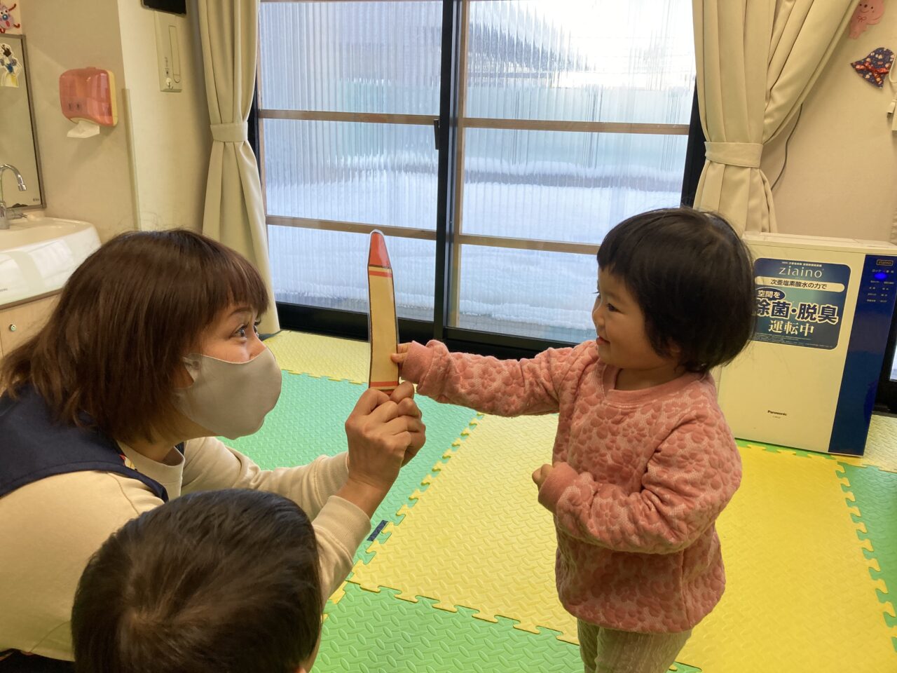 Yちゃんは『どんな色が好き?』の歌が大好きなので保育者が言った色を探し、持ってきてもらうゲームをしました‼︎?