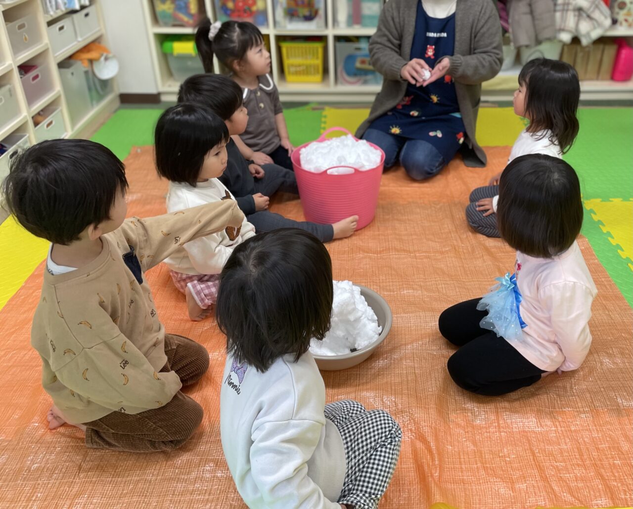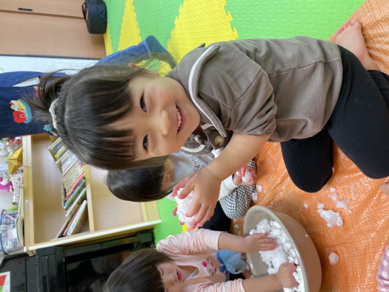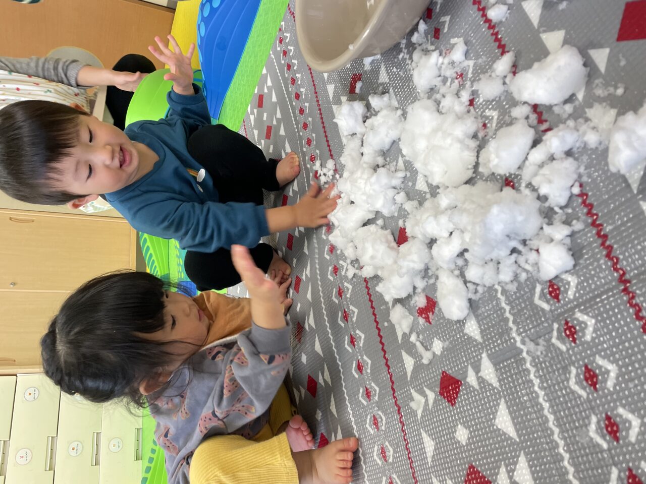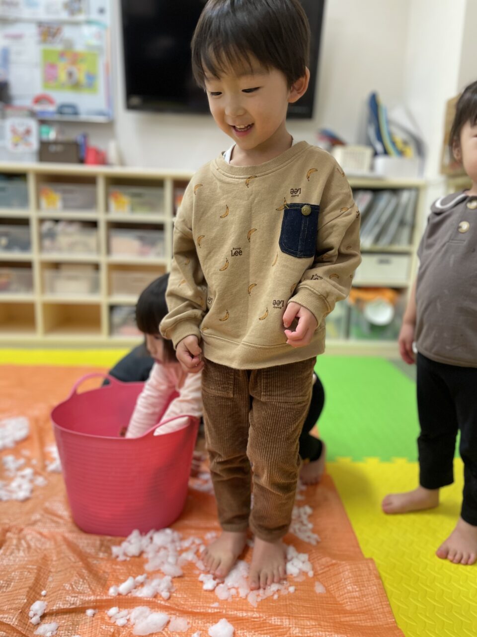 “お外に行かなくても雪に触れないかなぁ?“と考え、保育園の中に雪を持ってきて遊んでみました☃️?