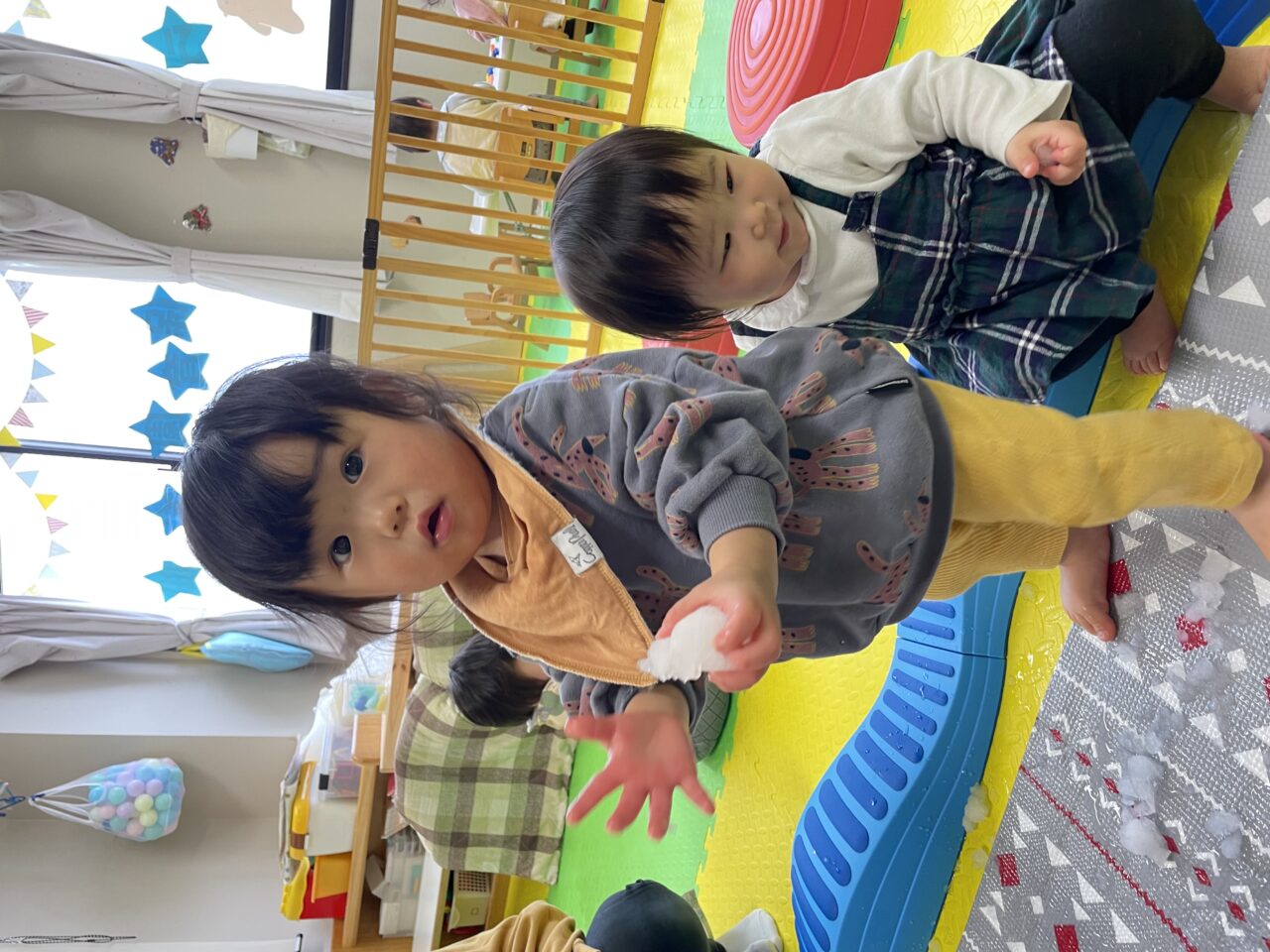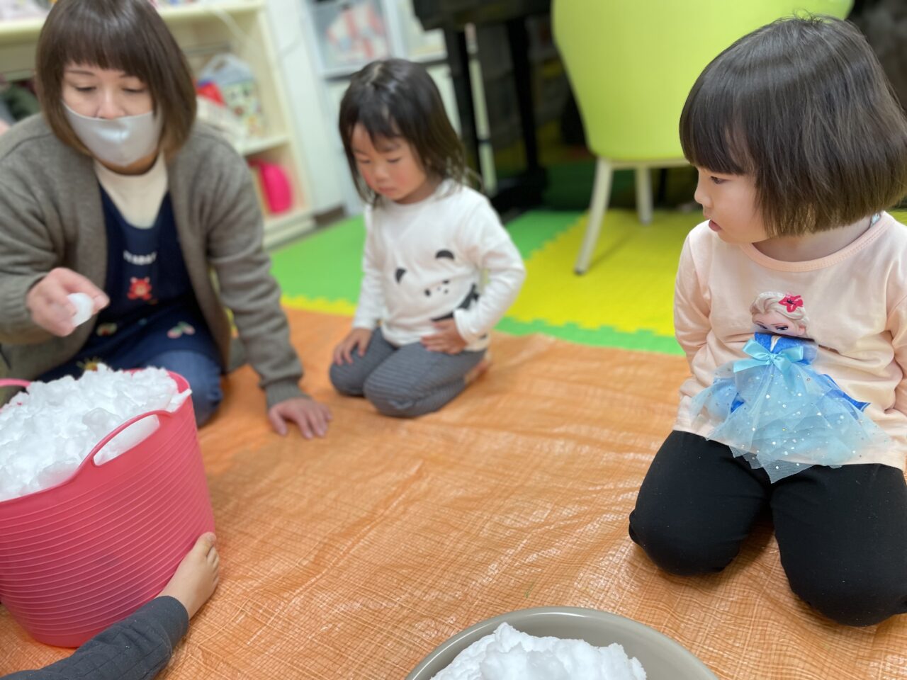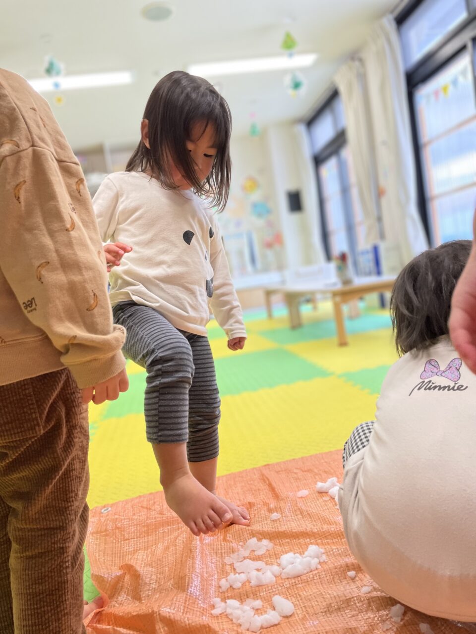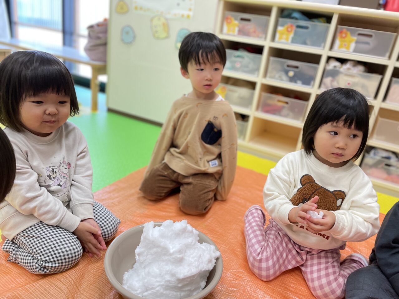 “お外に行かなくても雪に触れないかなぁ?“と考え、保育園の中に雪を持ってきて遊んでみました☃️?