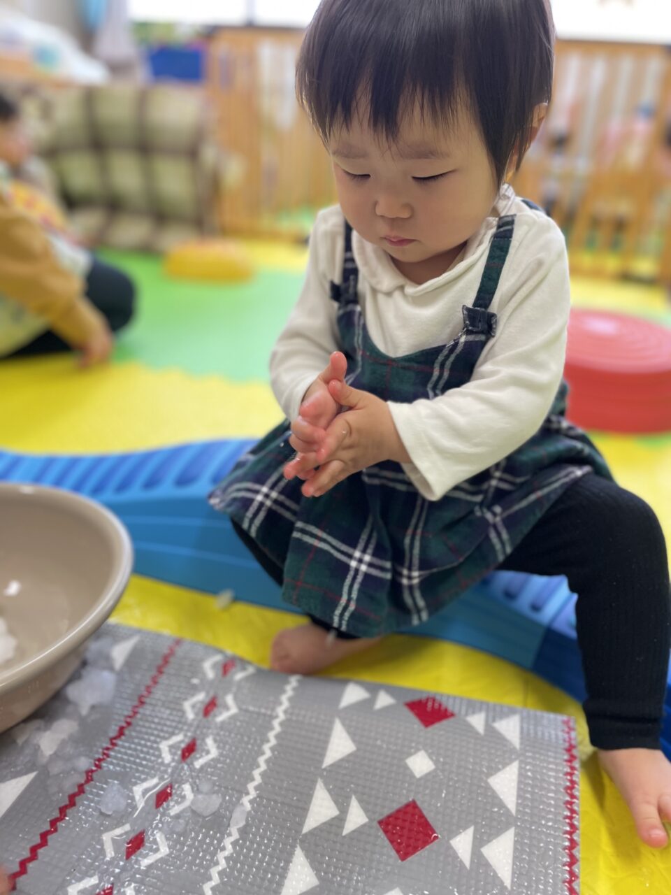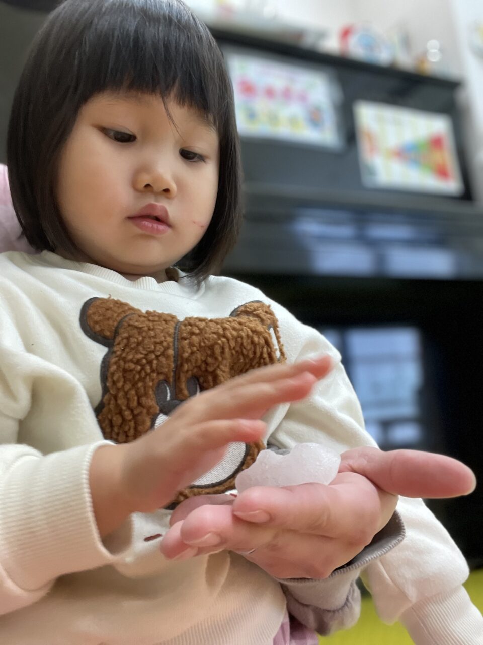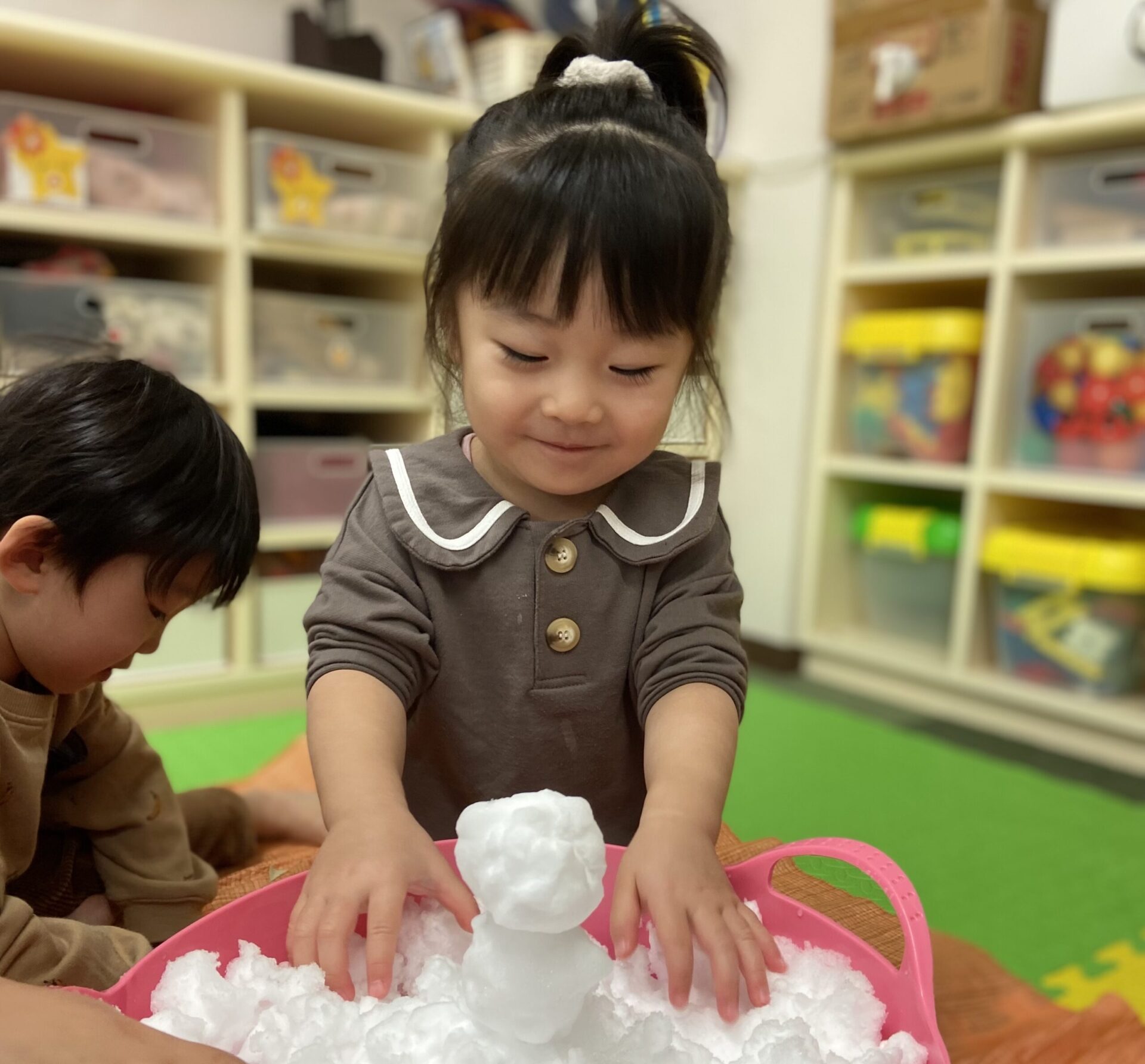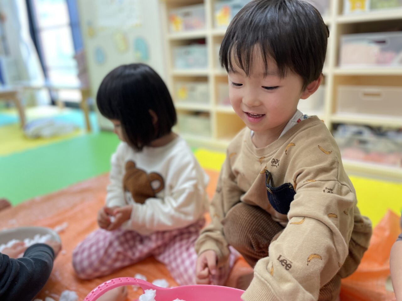 “お外に行かなくても雪に触れないかなぁ?“と考え、保育園の中に雪を持ってきて遊んでみました☃️?