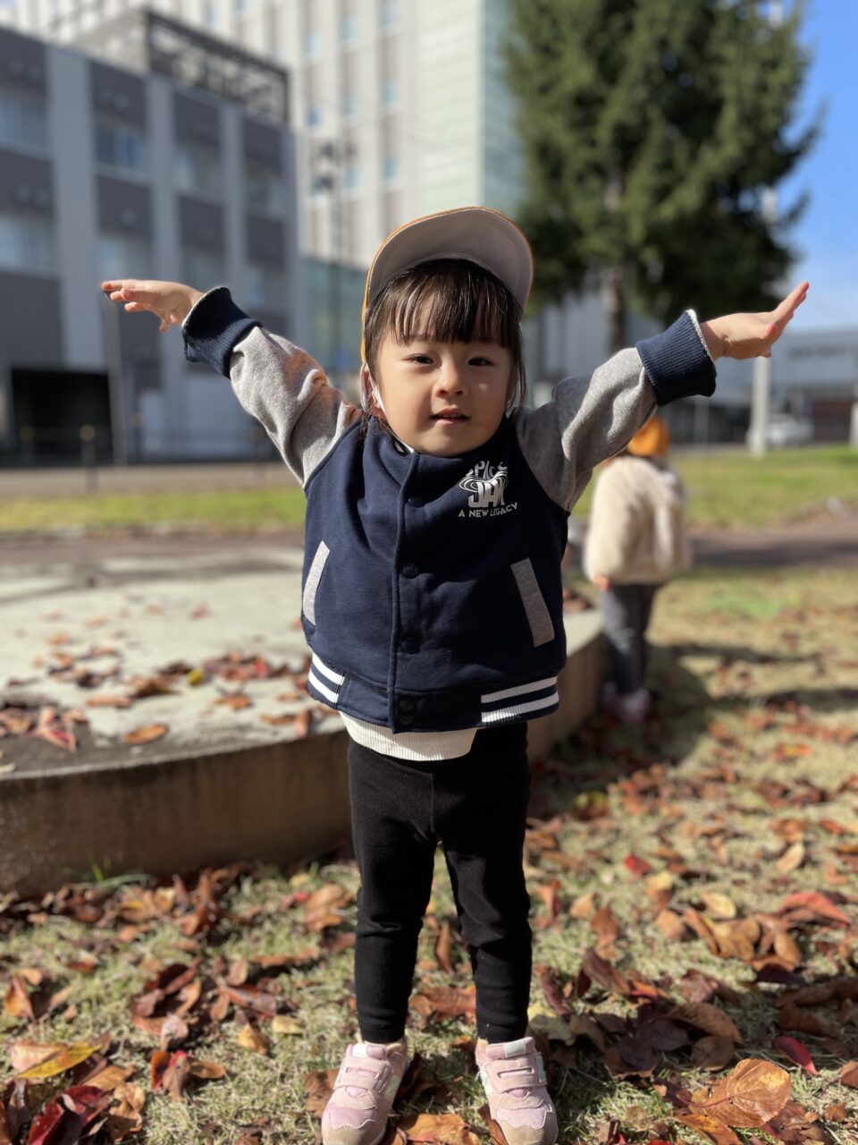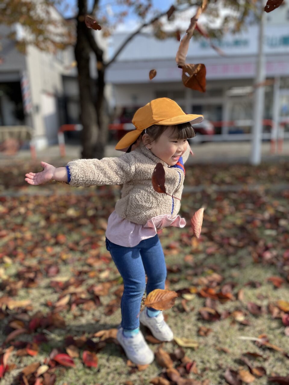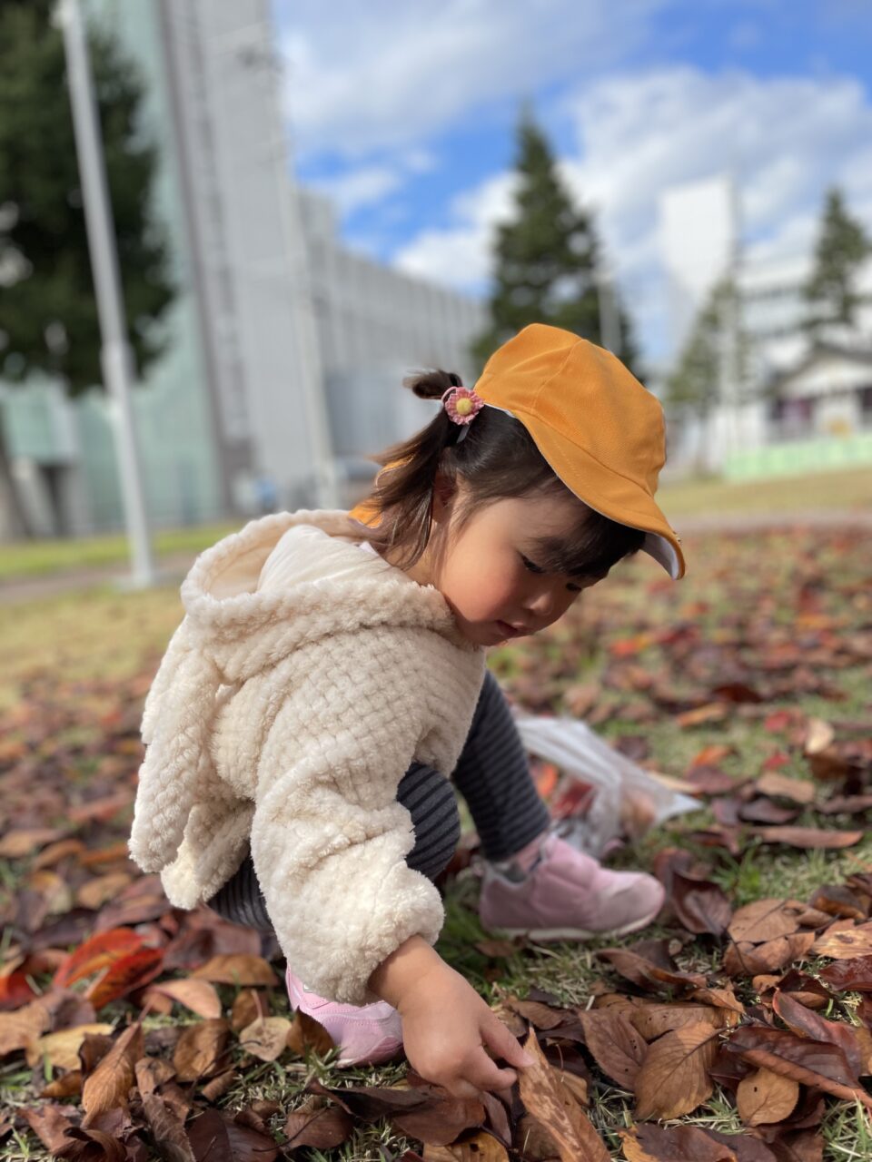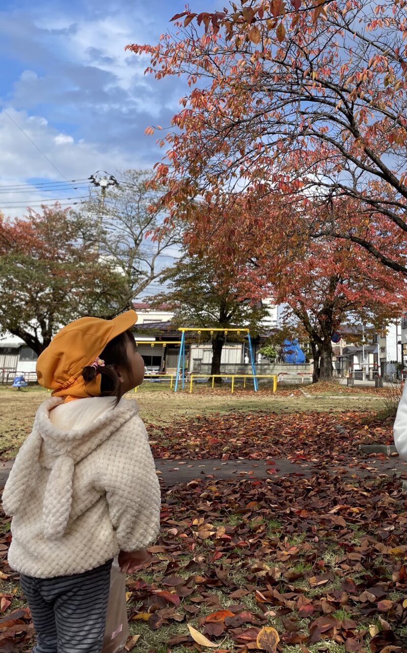 公園に着くと、赤色や茶色くなった木を見たり落ちてくる枯れ葉を見上げる子どもたち…?