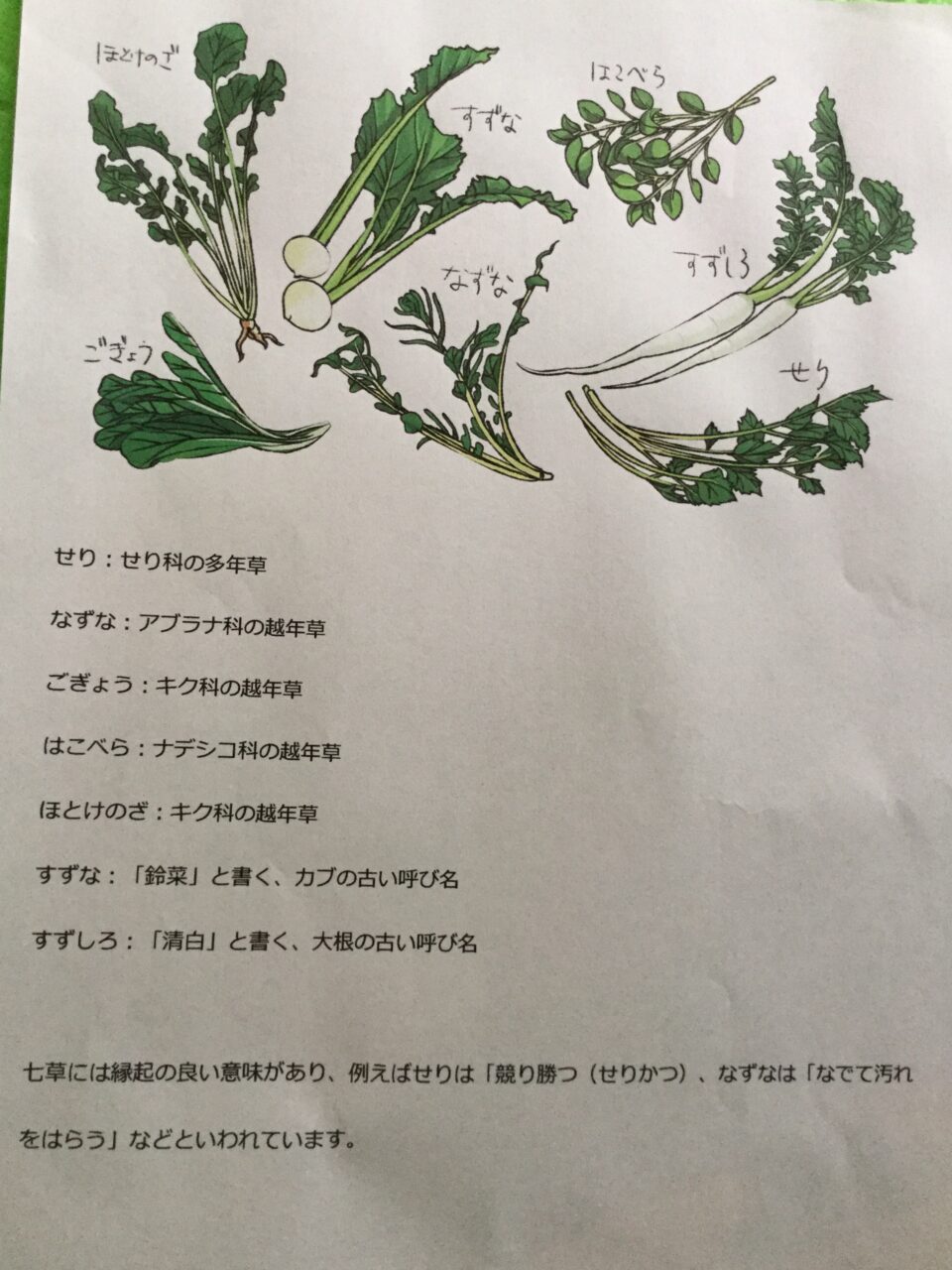 七草には体に溜まった老廃物を外に出すための栄養素が含まれていることから、お正月で疲れた胃を休め、不足しがちな栄養を補うとも言われています??