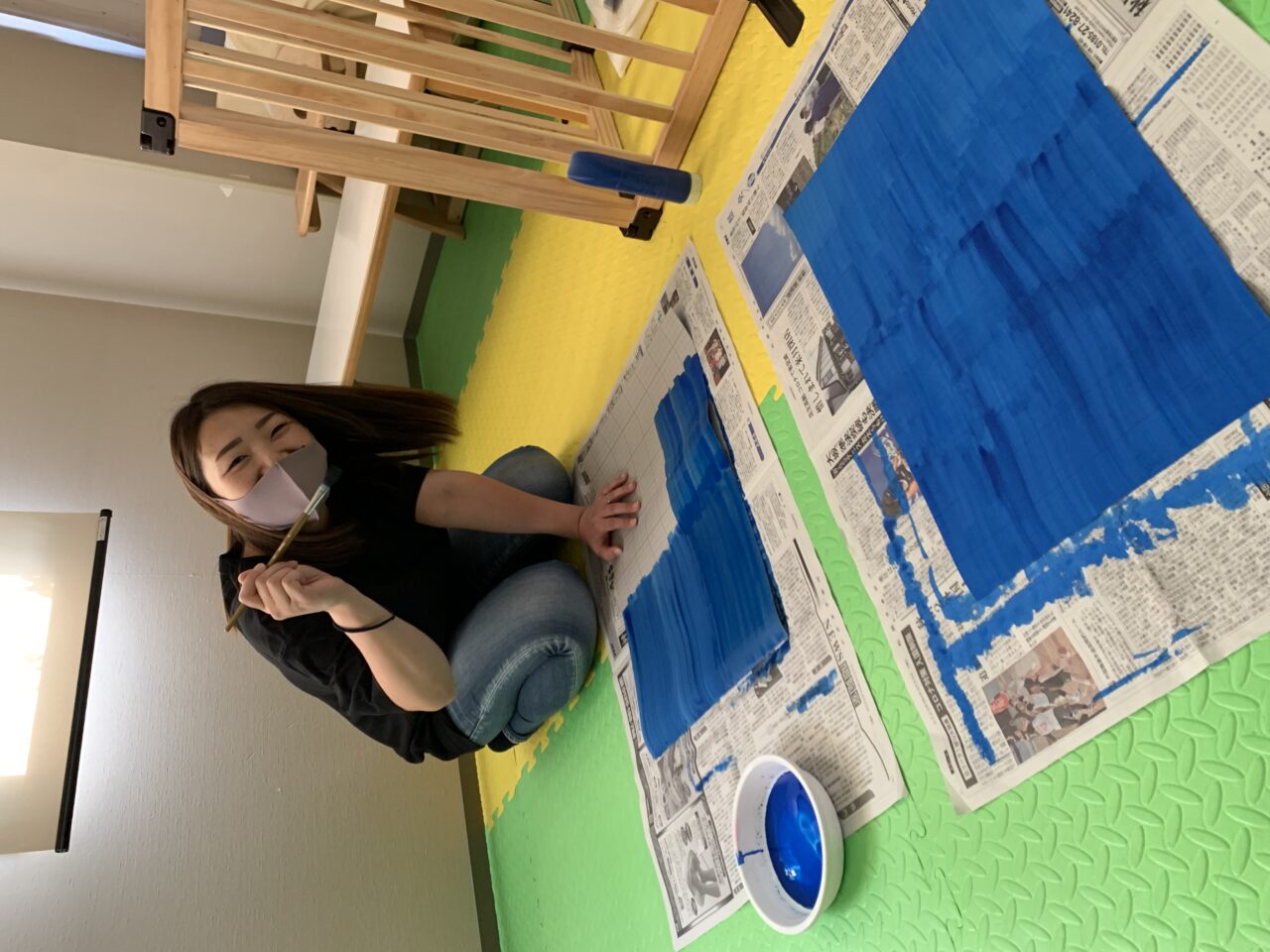 青い絵の具ぬりぬり? 輪っかを繋げています?