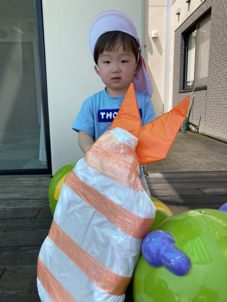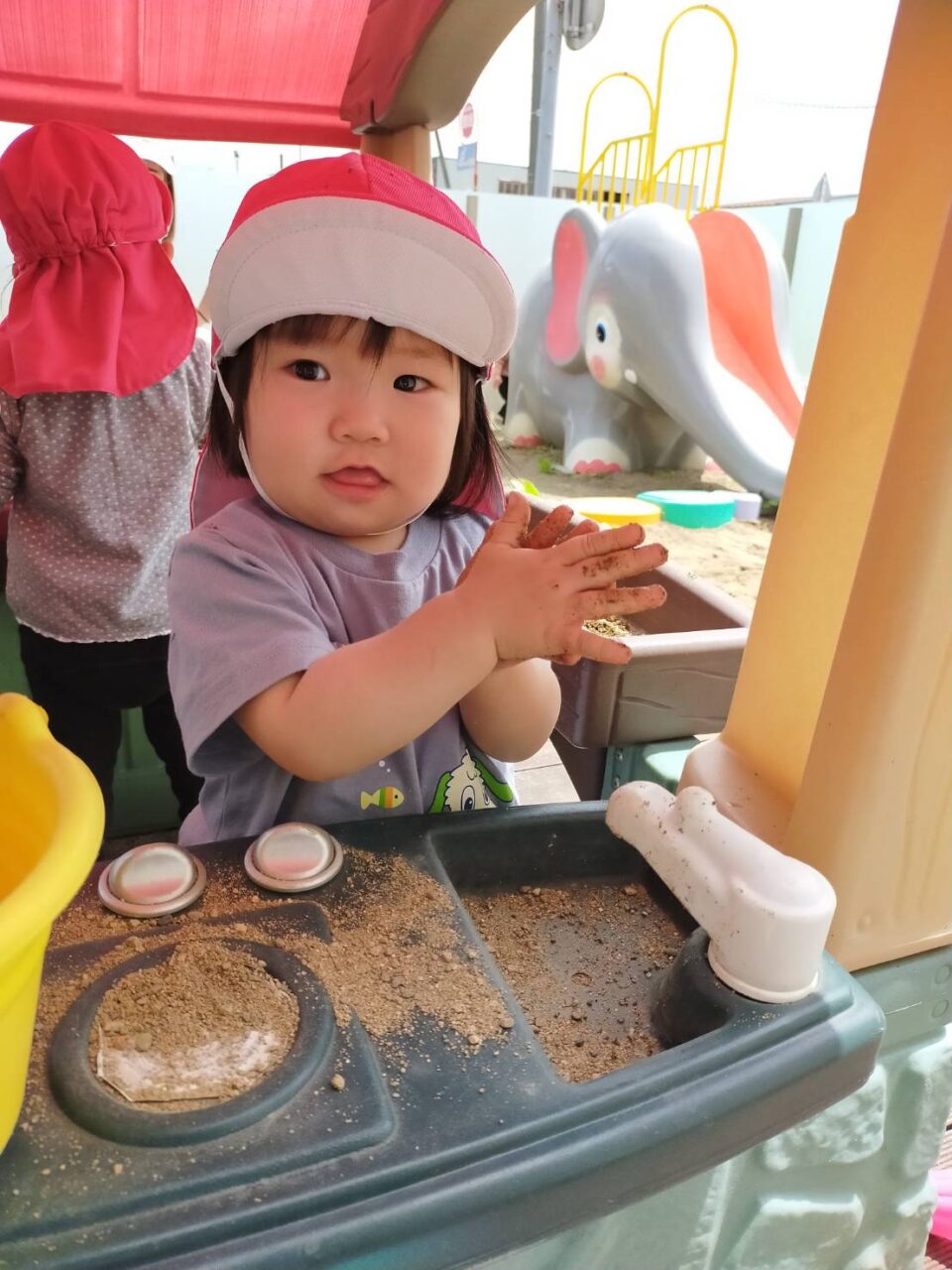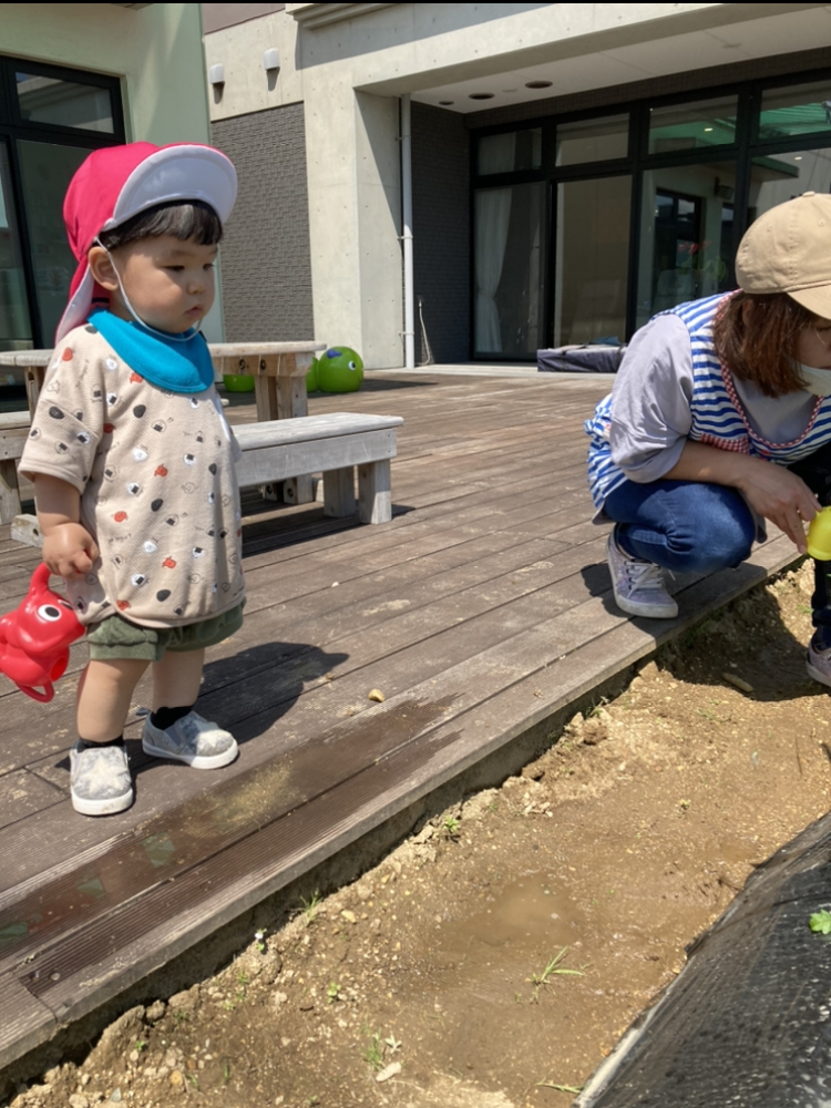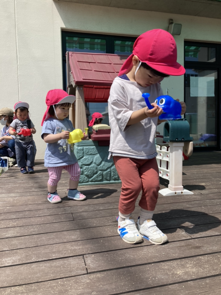 お水をあげた後は、砂遊びや前日に行われた運動会で使ったお寿司のネタやシャリで遊びました?