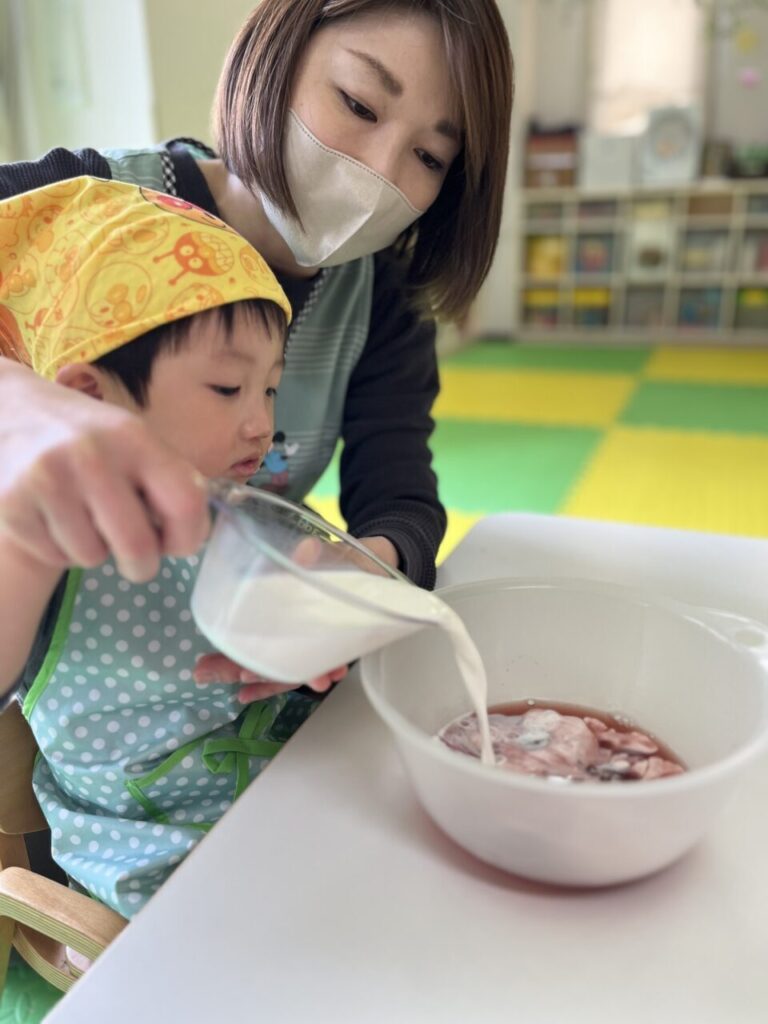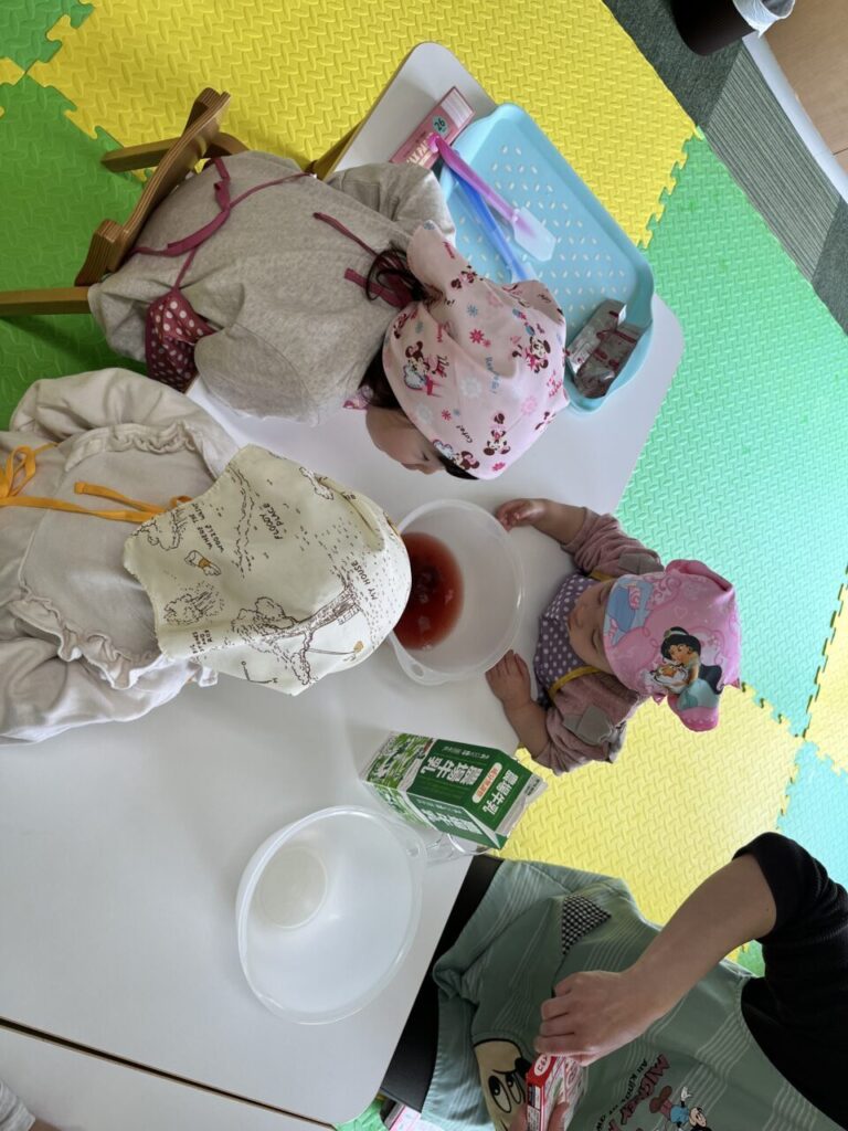 保育士が量った牛乳?を1人ずつ緊張しながら