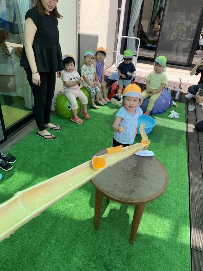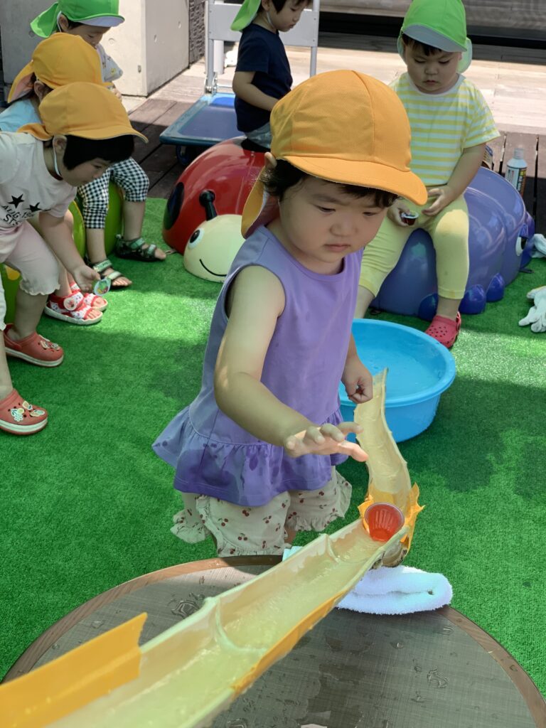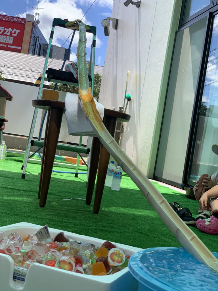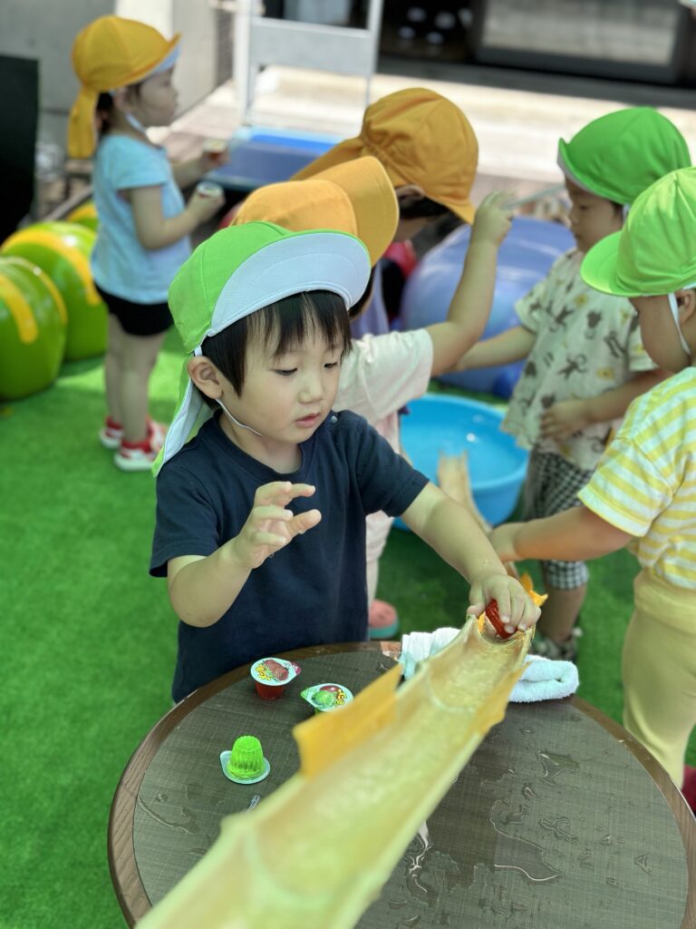 保育士が上からゼリーを流していると、取る側ではなく、流し手をしたいお友達が多く、気付くとみんなでゼリーを流していました?笑