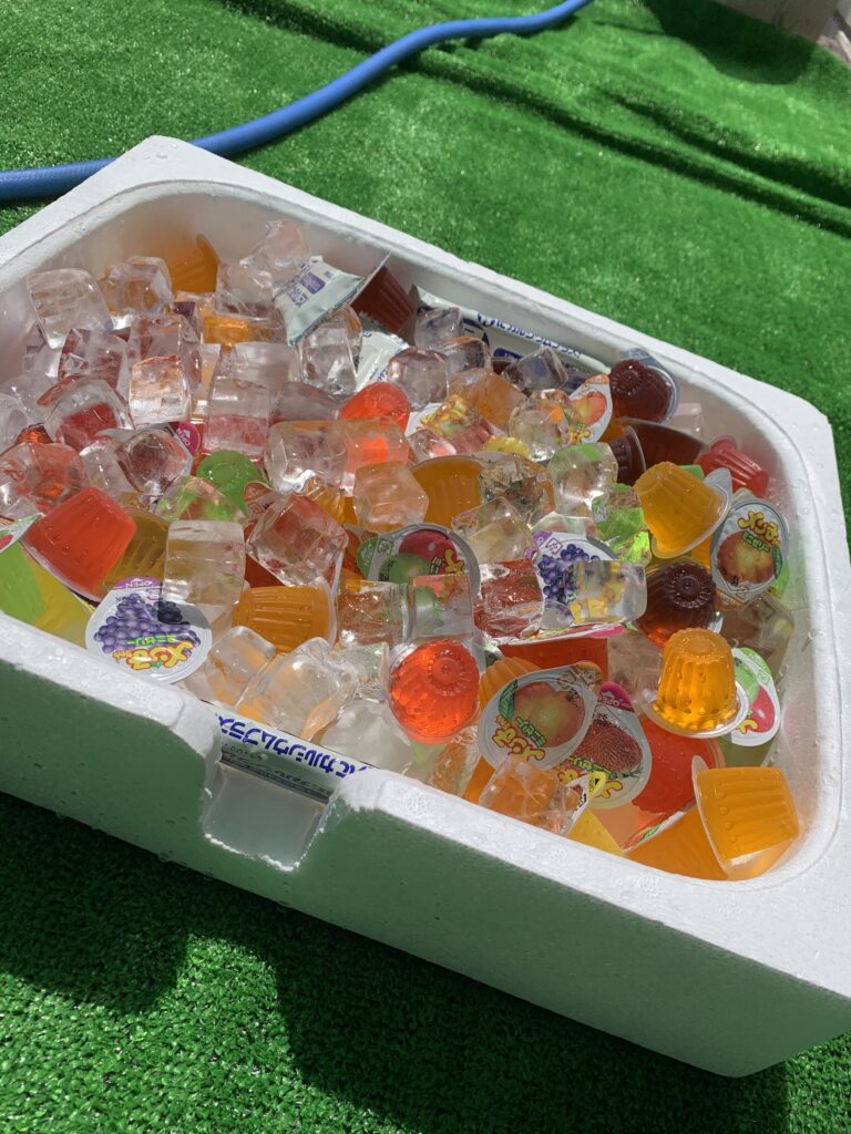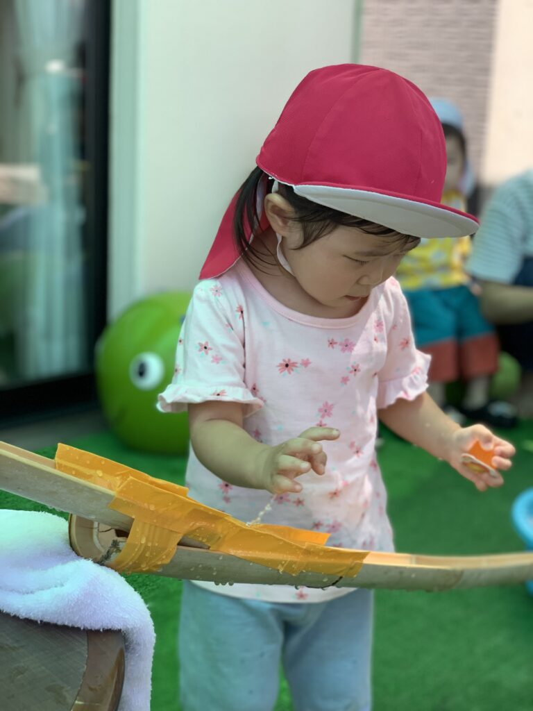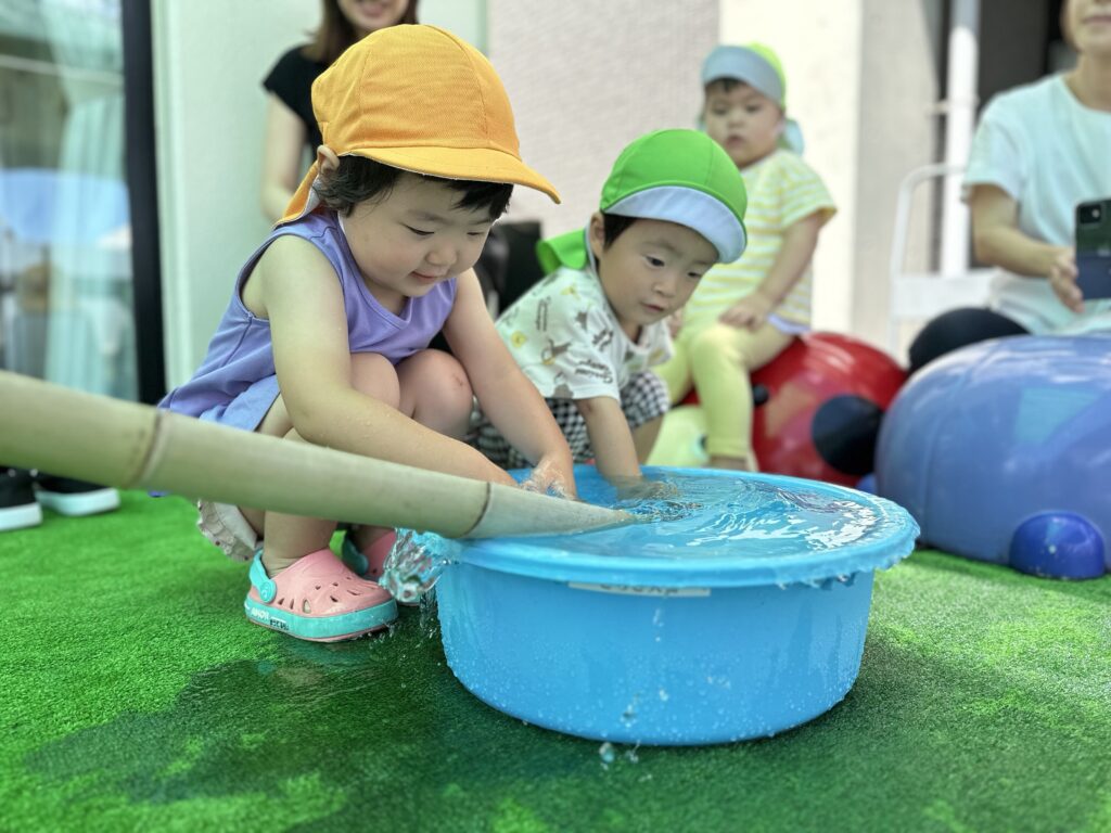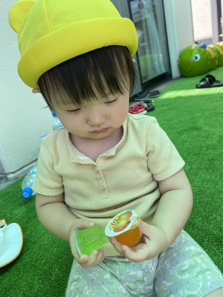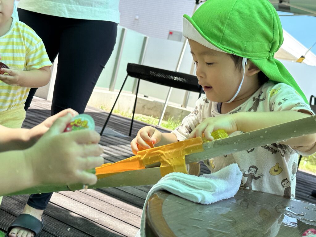 保育士が上からゼリーを流していると、取る側ではなく、流し手をしたいお友達が多く、気付くとみんなでゼリーを流していました?笑