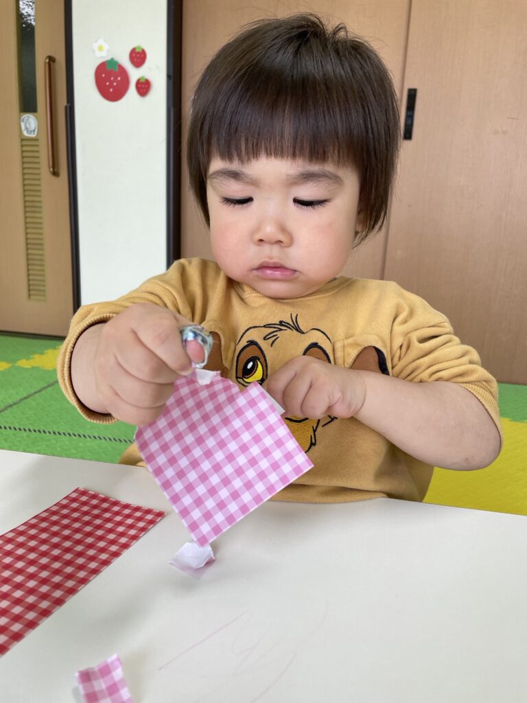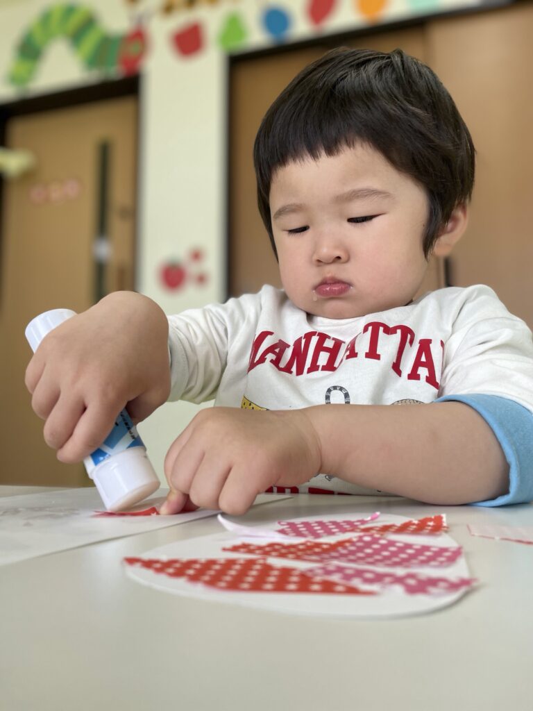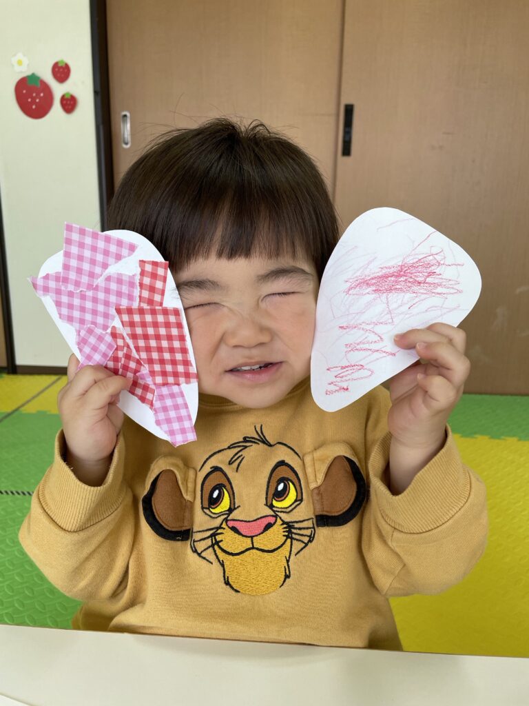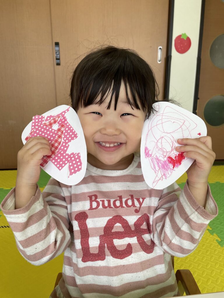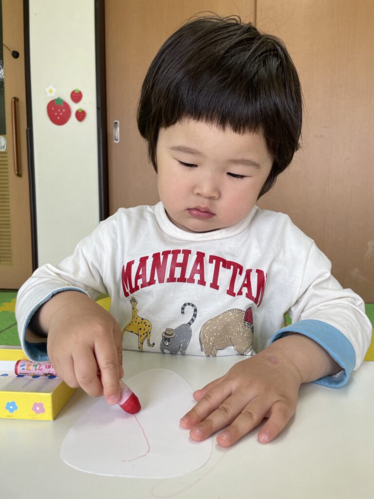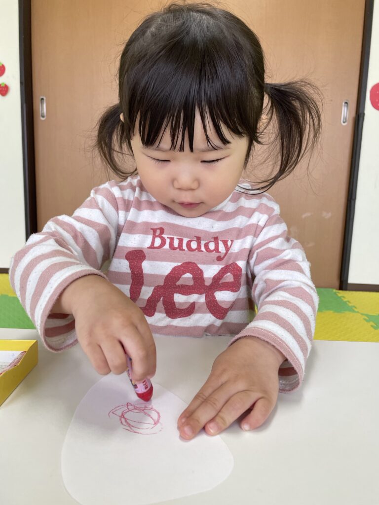 2歳児さんは遠足でいちご狩りに行くのですが、いちご狩りが楽しみすぎて製作も「いちごがいい🍓!」とつき組さん!