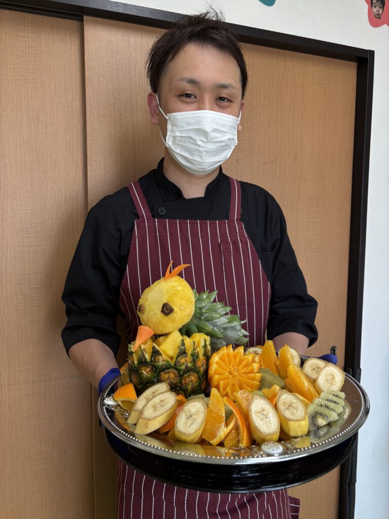 実は厨房の包丁の貴公子、竹沢さんより子どもたちへと飾り切りのフルーツが届き、子ども達も大盛り上がり‼️‼️