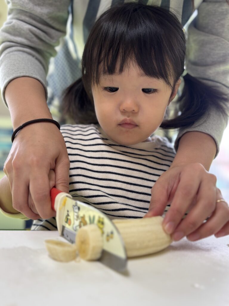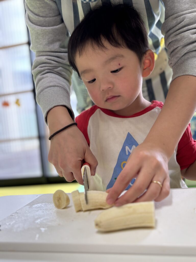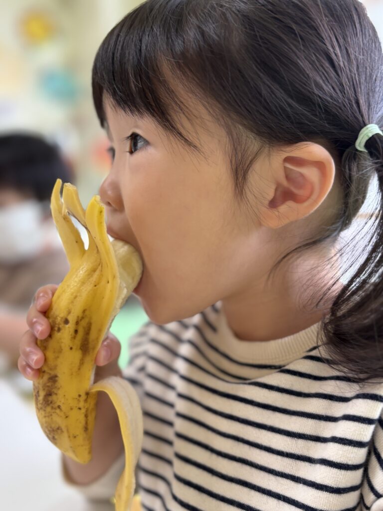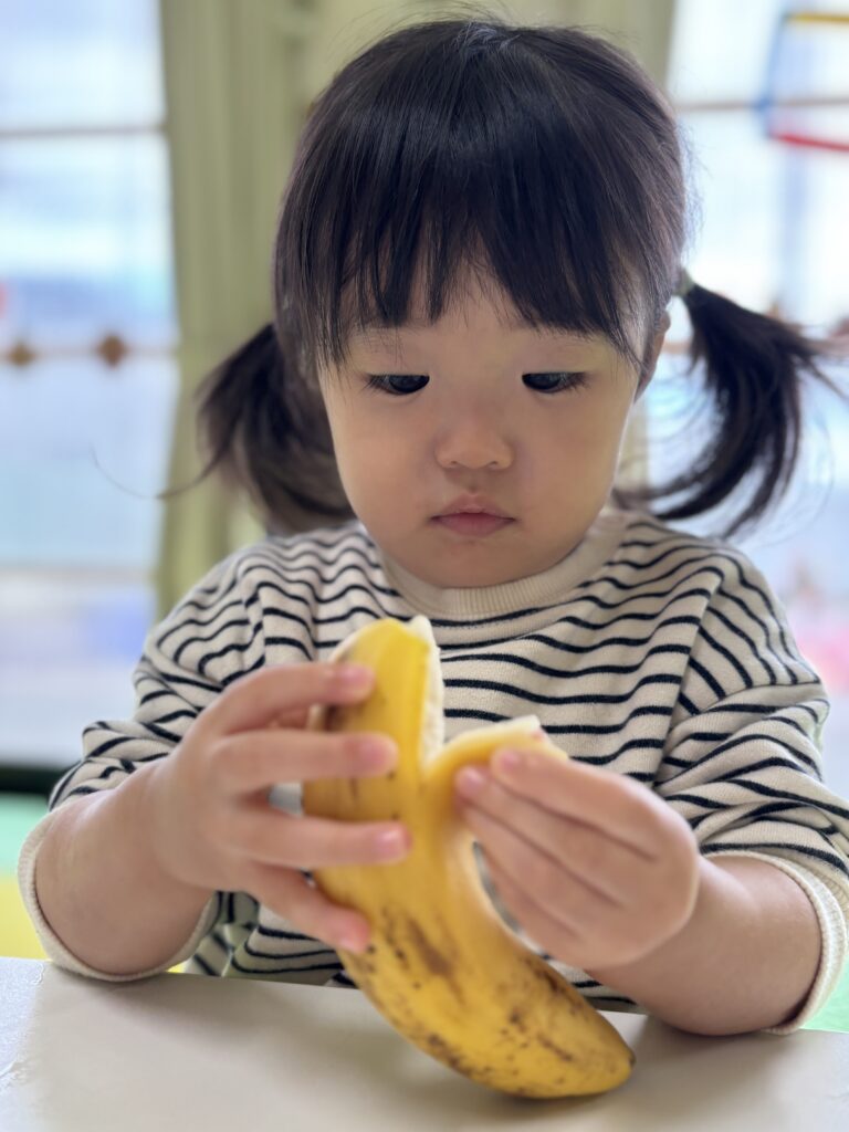 バナナをむいたり切ったり味見したりと