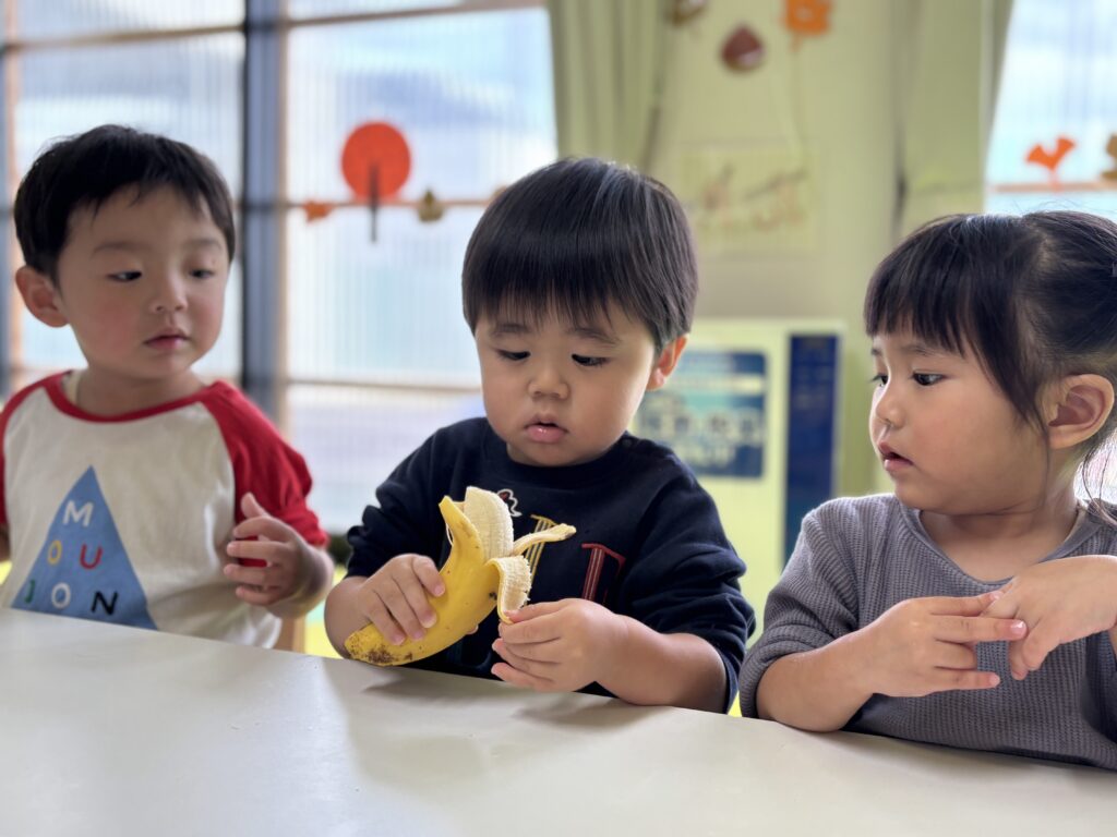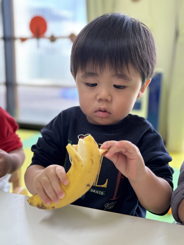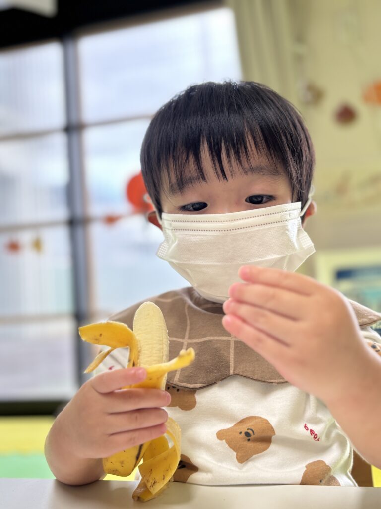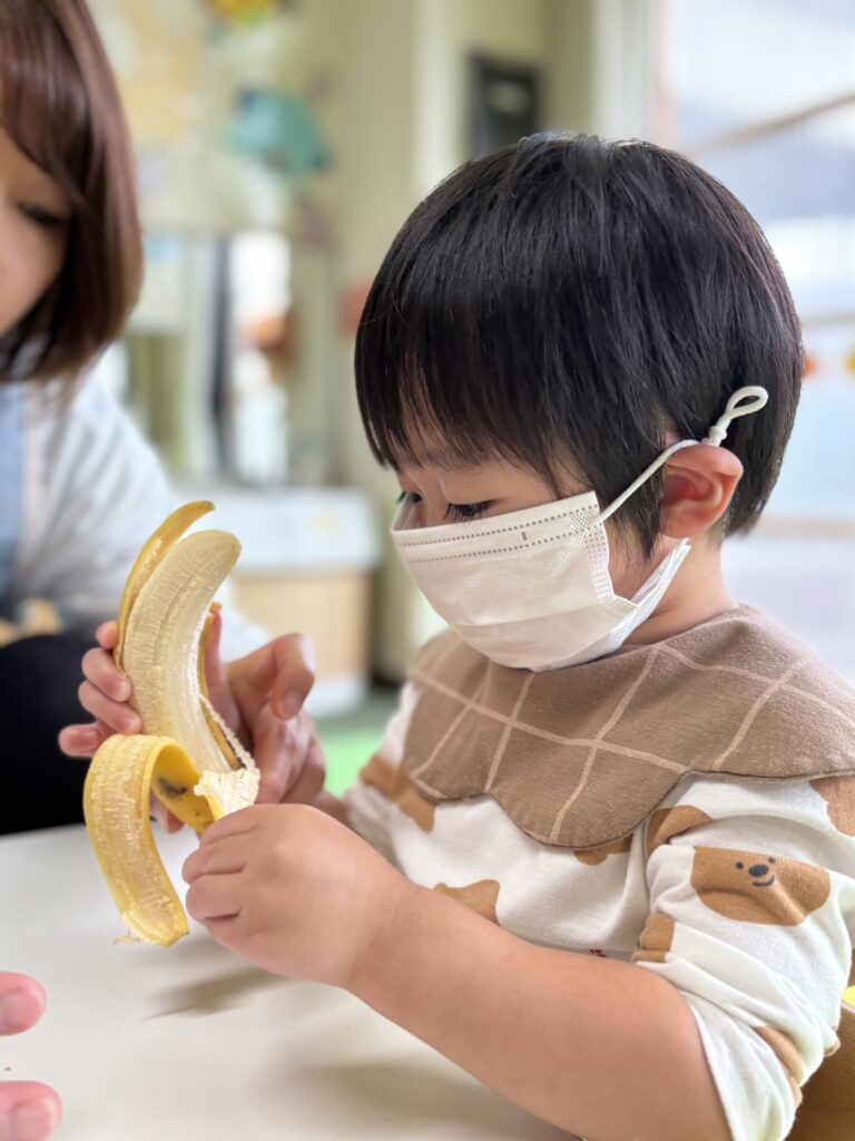 バナナをむいたり切ったり味見したりと