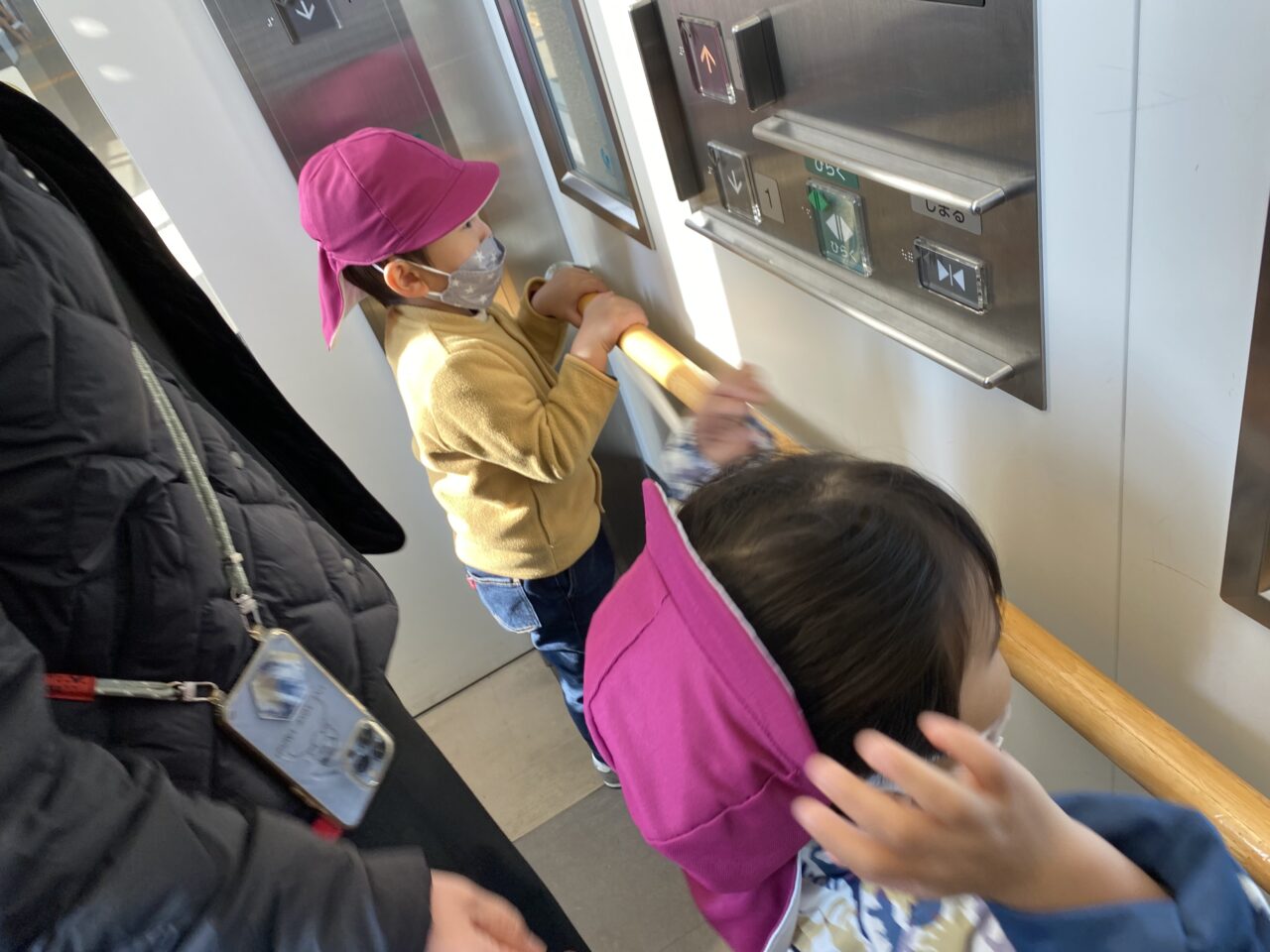 エレベーターの中では手すりにしっかりつかまって安全よーしっっ?