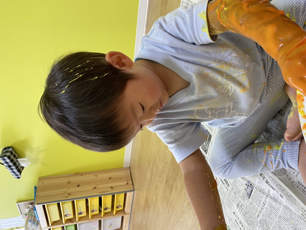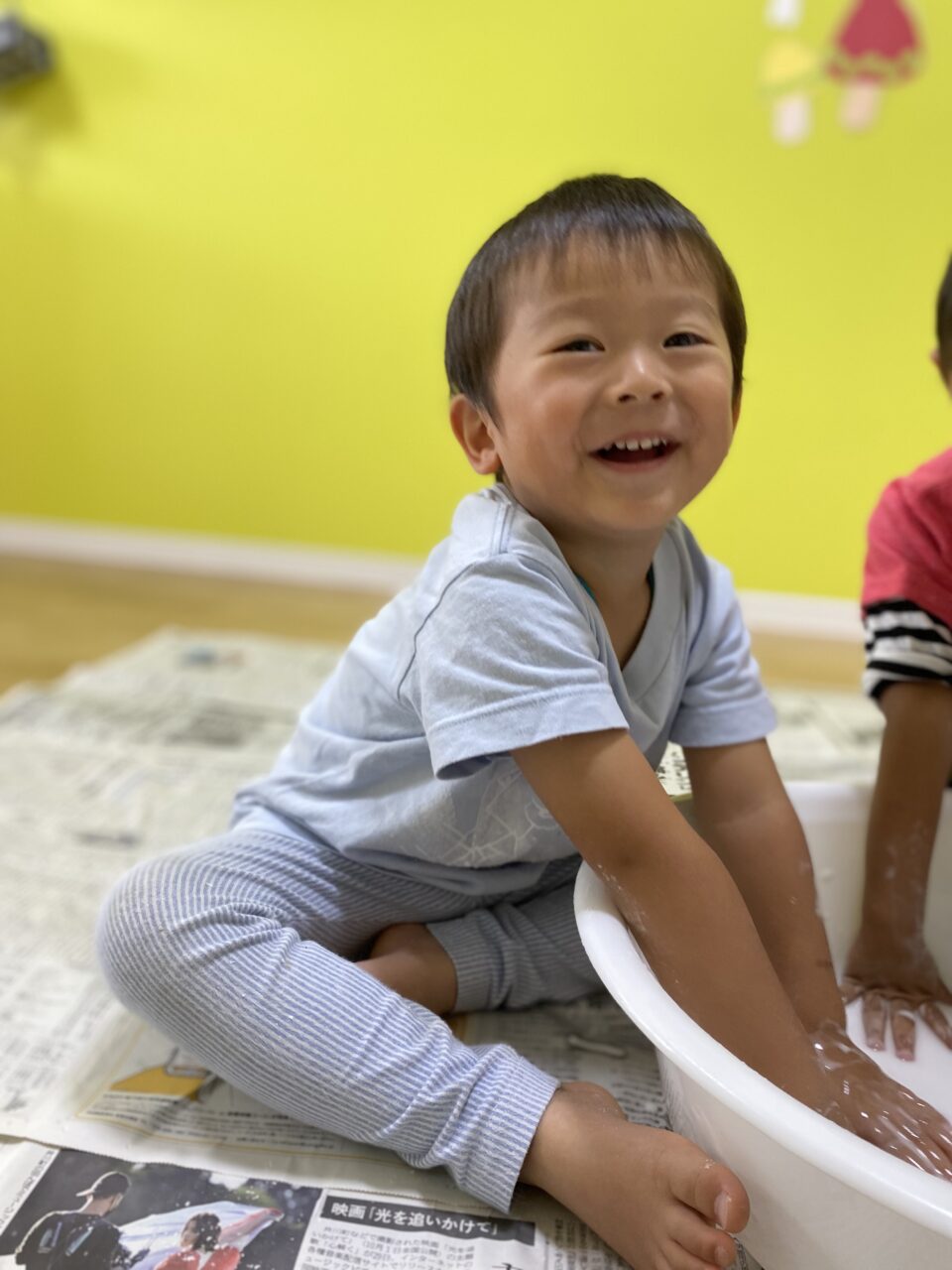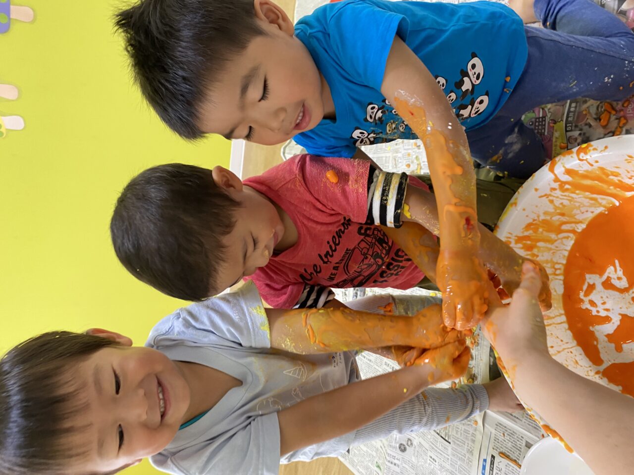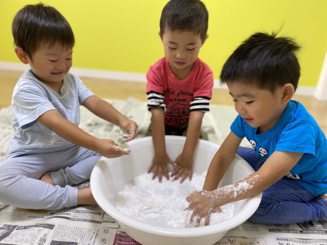 初めての感触遊びに少し苦手な様子だったSくんとIくんでしたが、もうへっちゃら♬全身が片栗粉だらけになるまで感触遊びを楽しんだつき組3名でした?⭐︎
