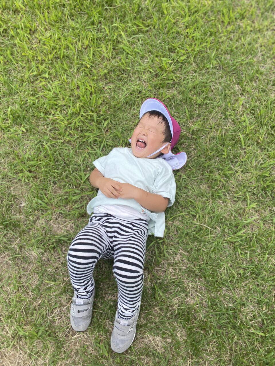 芝生で寝転んだり、葉っぱのお面で遊んだりと