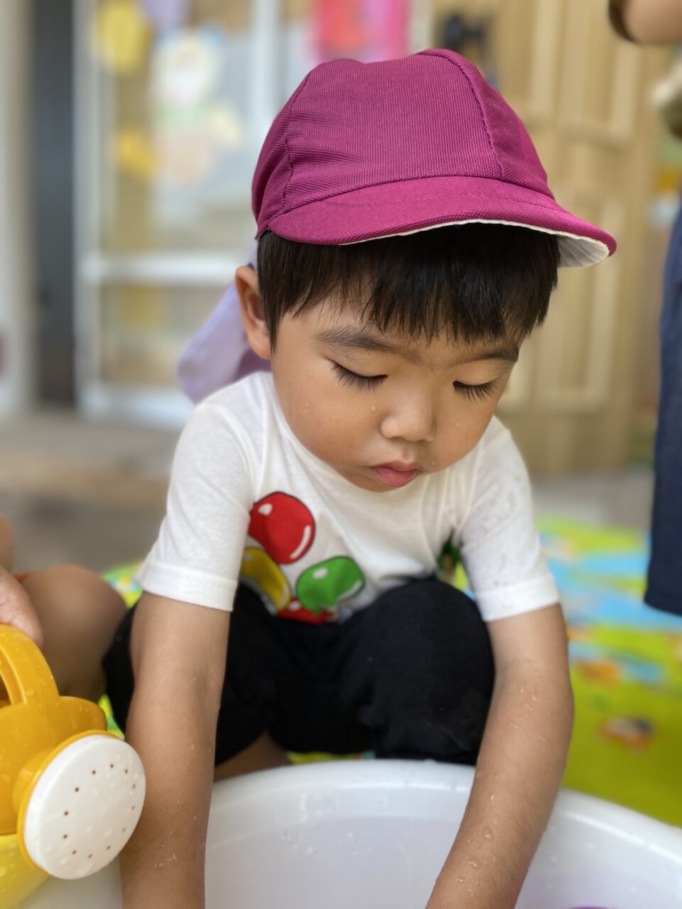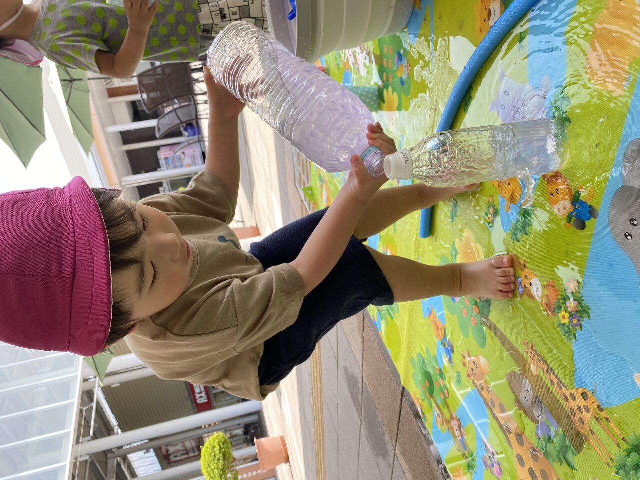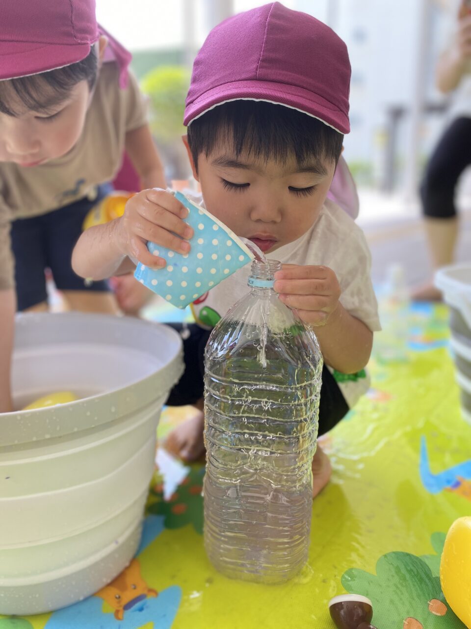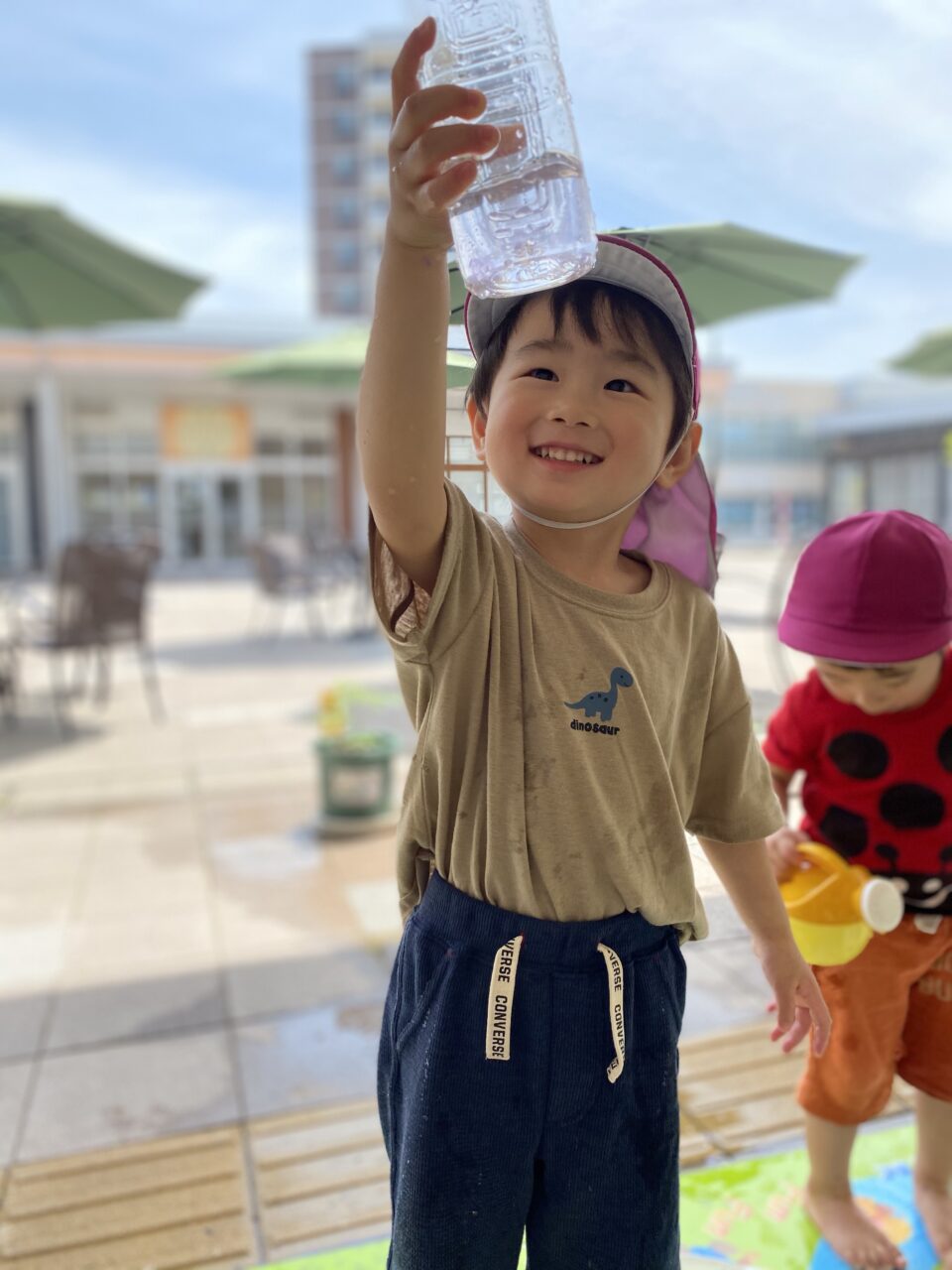 今年初の水遊びに子ども達は少し戸惑い気味のような感じもしましたが、慣れてくると夢中になって遊んでいた