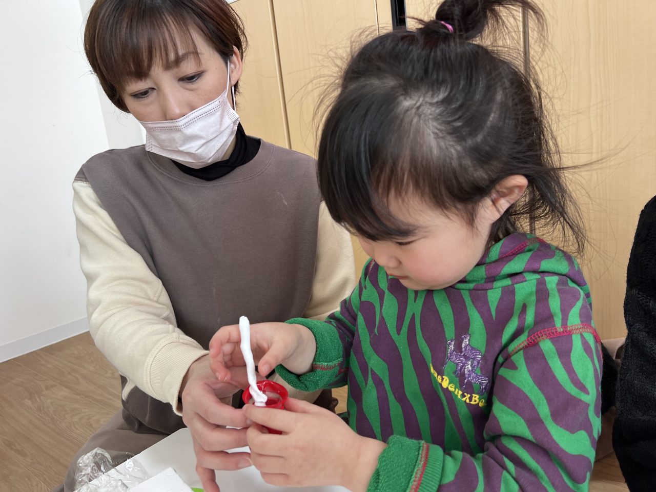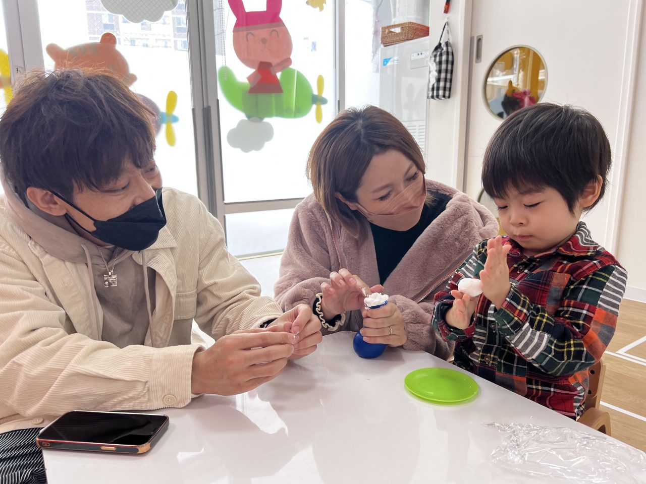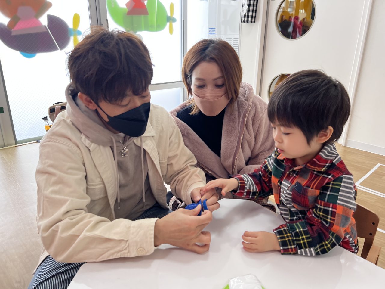 子ども達が粘土をこねて、保護者の方が風船につめる作業をしたり