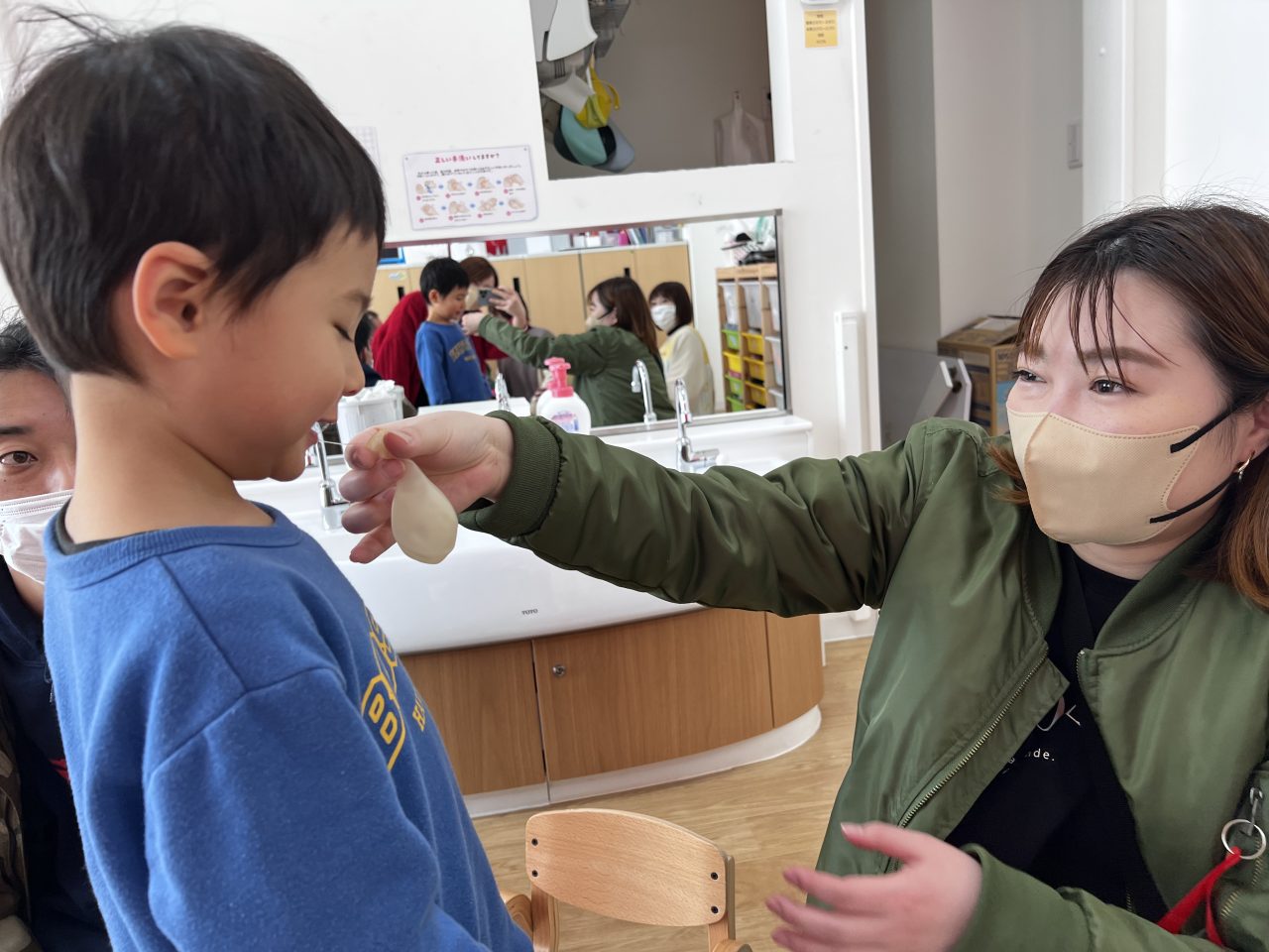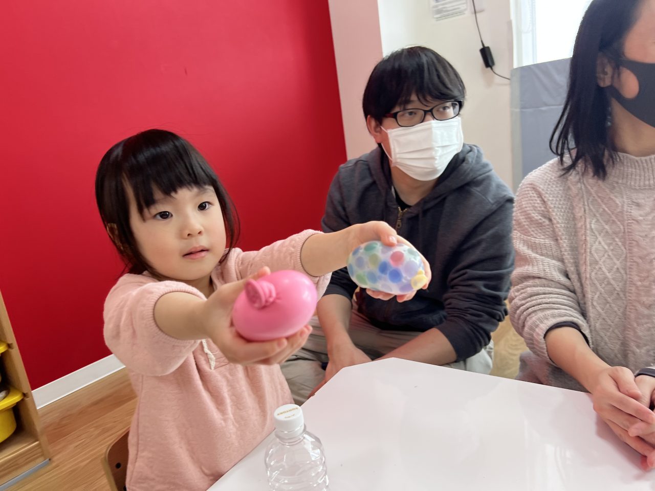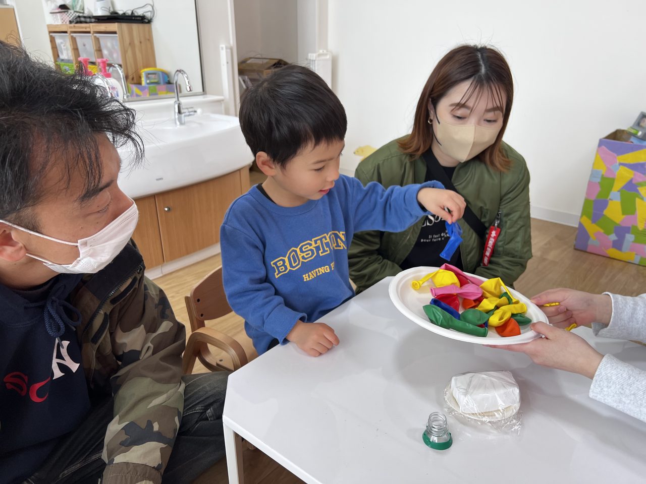 保護者の方が粘土をこねて、子ども達が風船につめたりと