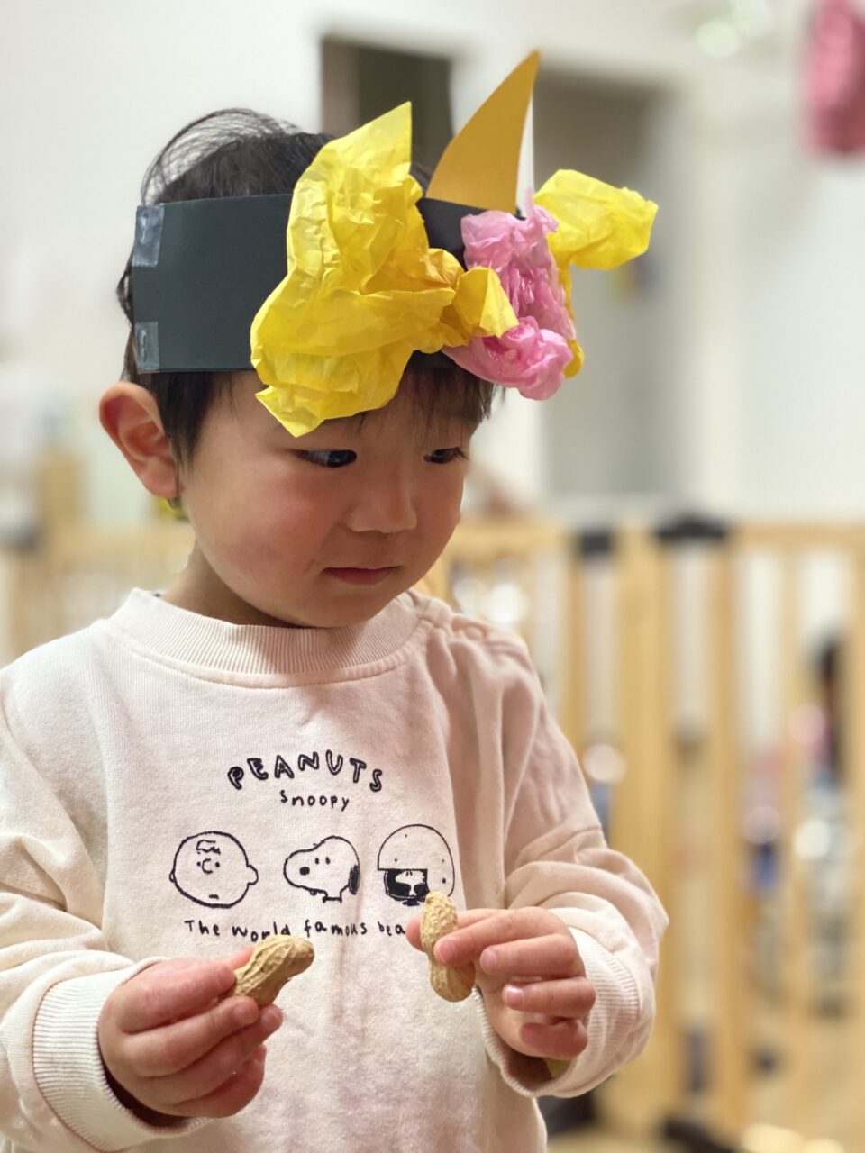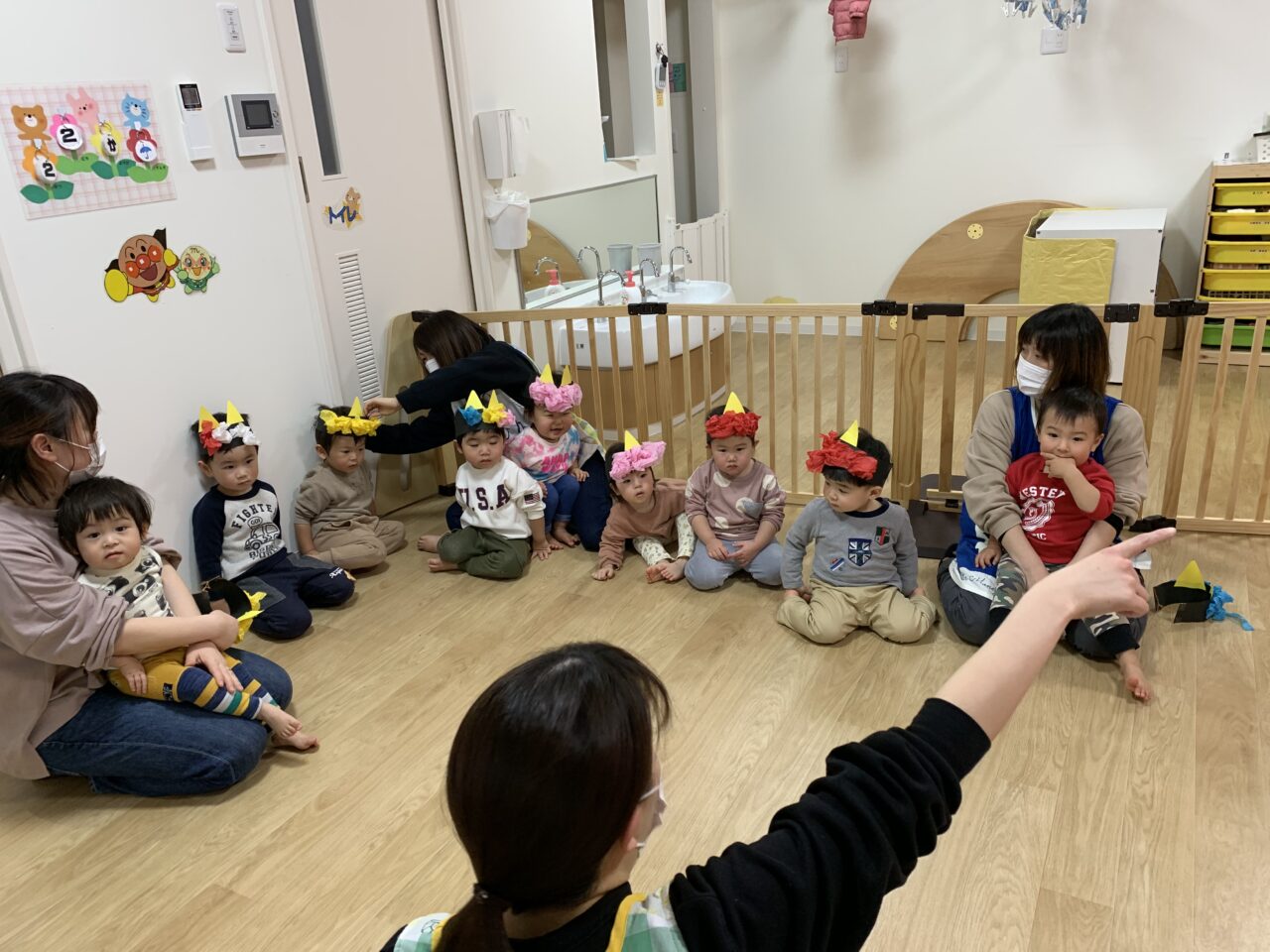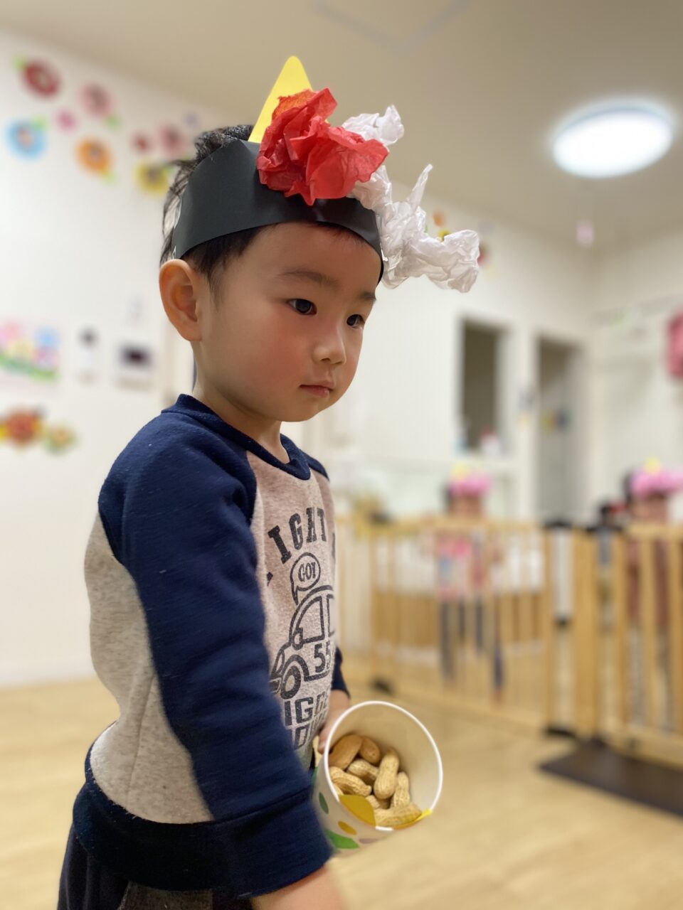 節分がどんな日かお話を聞き、鬼をやっつけるぞー!とやる気満々の子どもたち✊?✨