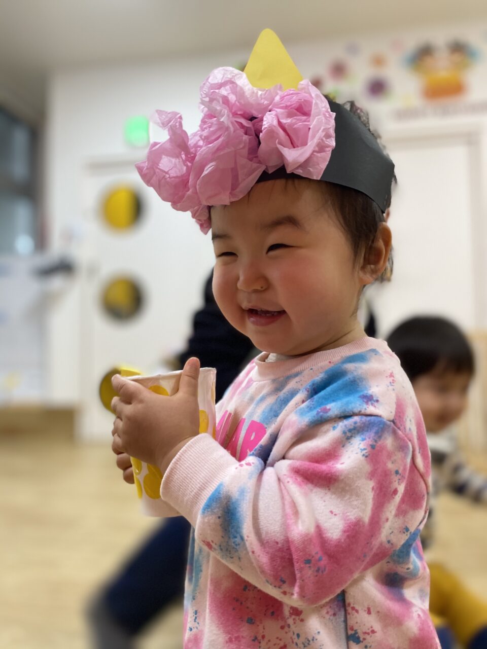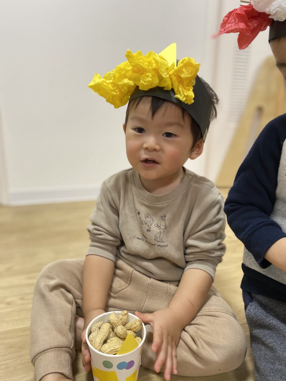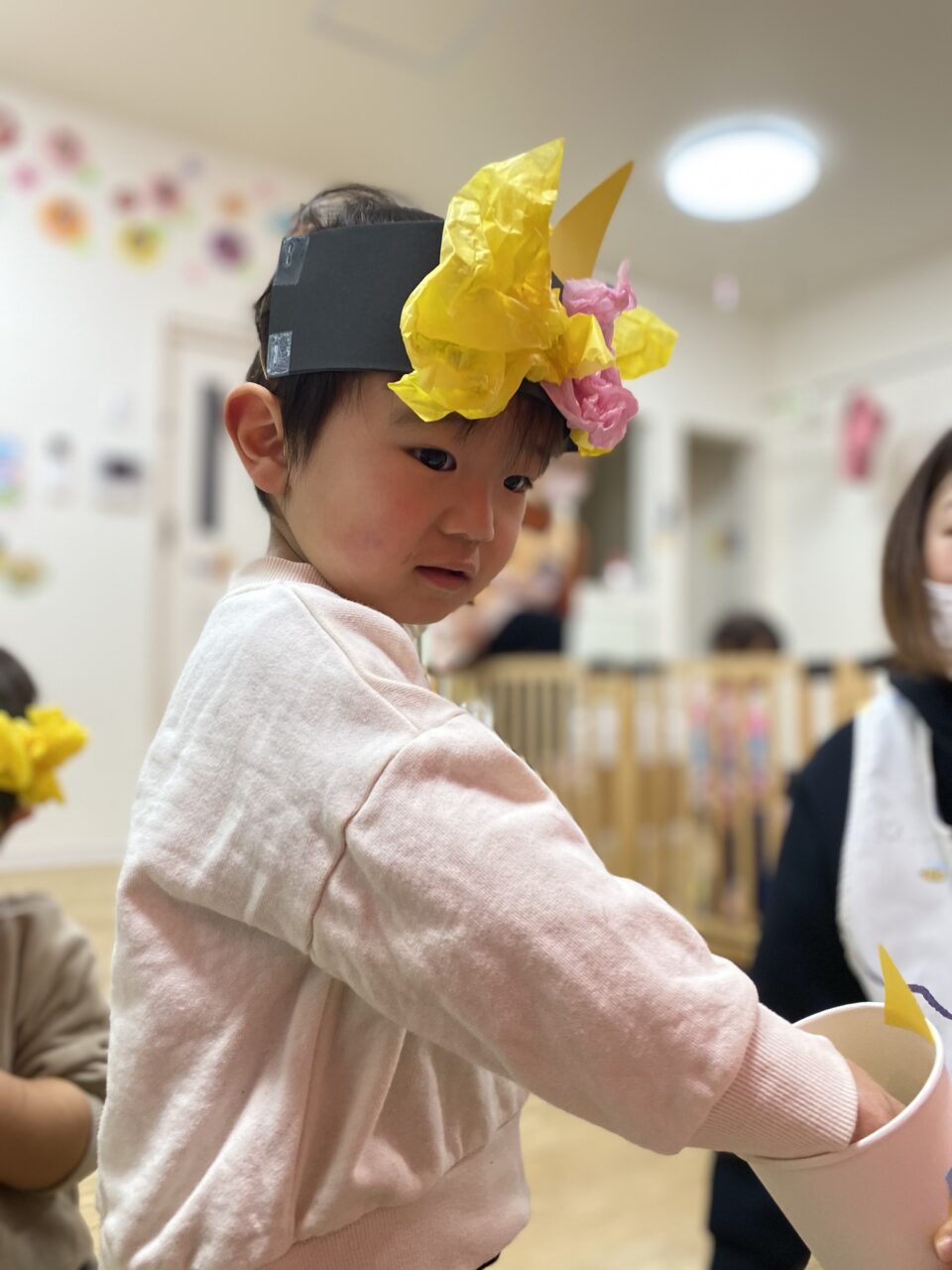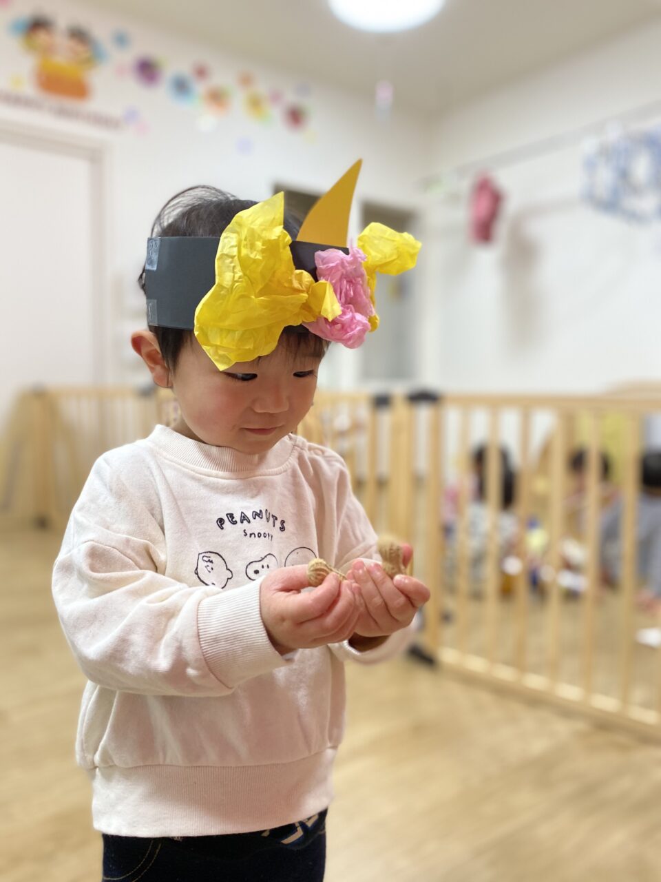 節分がどんな日かお話を聞き、鬼をやっつけるぞー!とやる気満々の子どもたち✊?✨