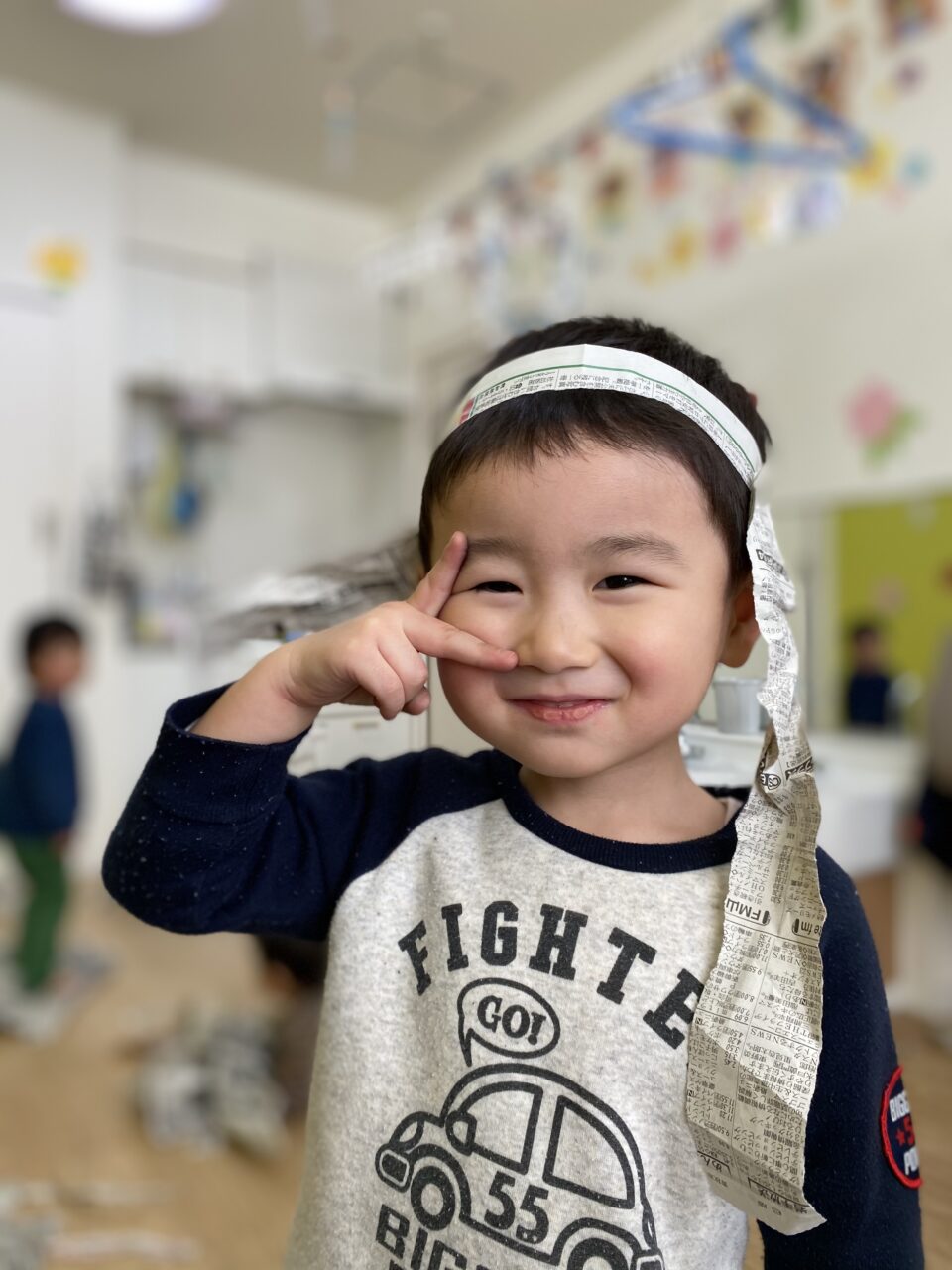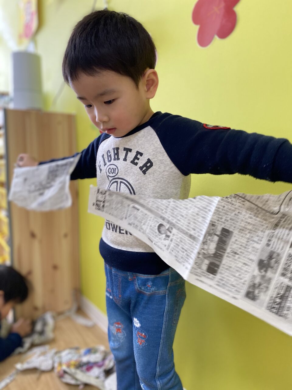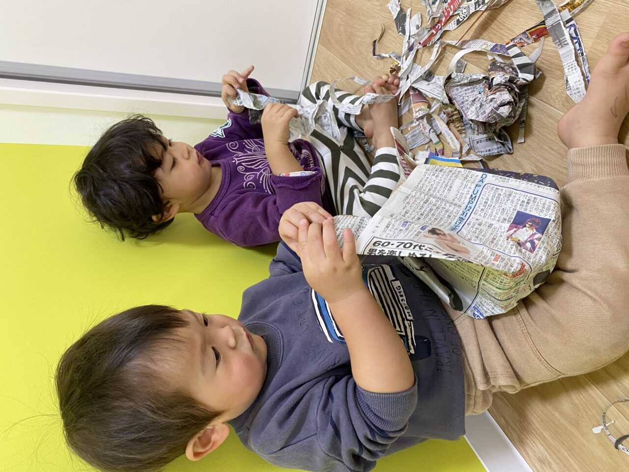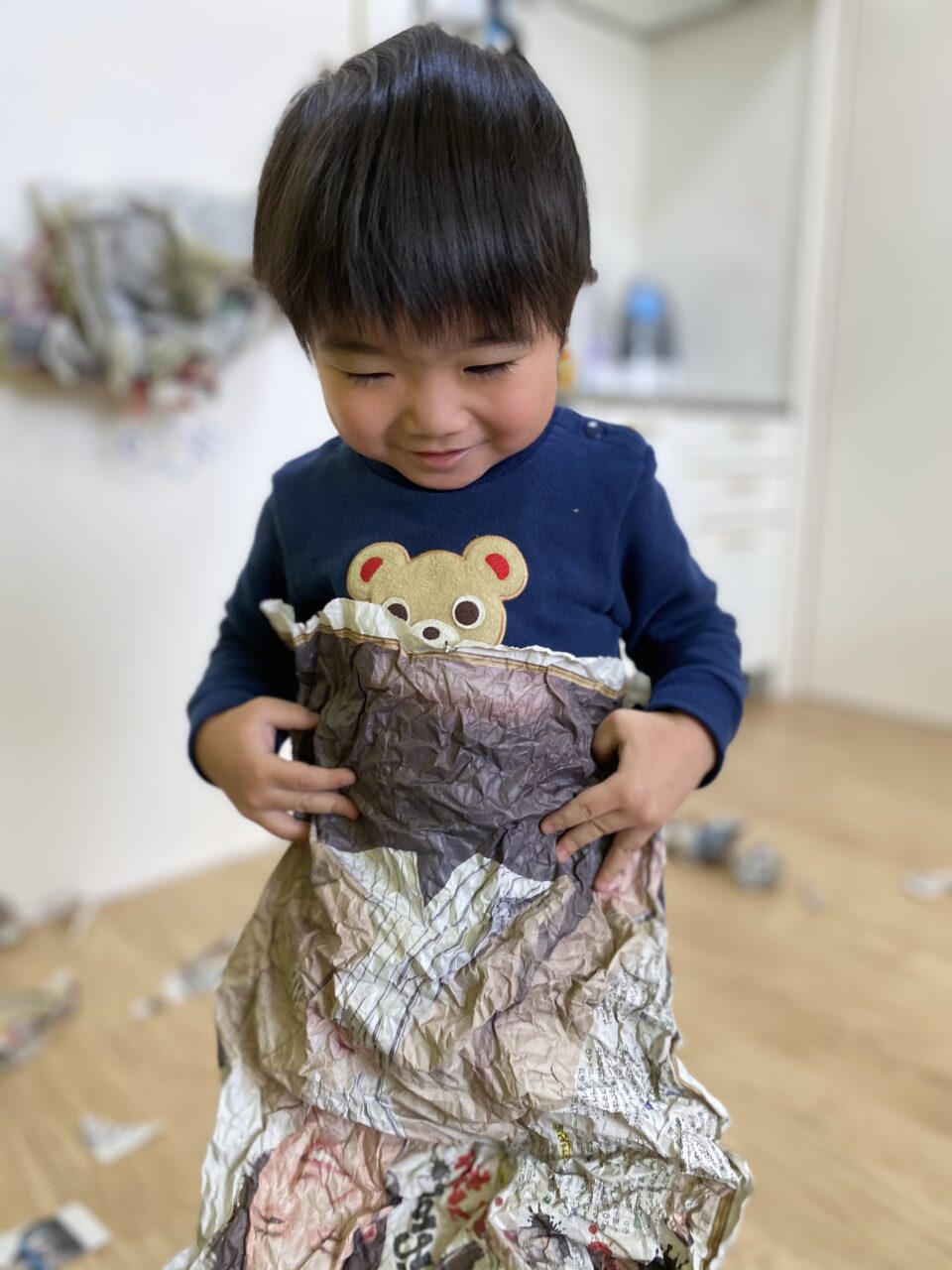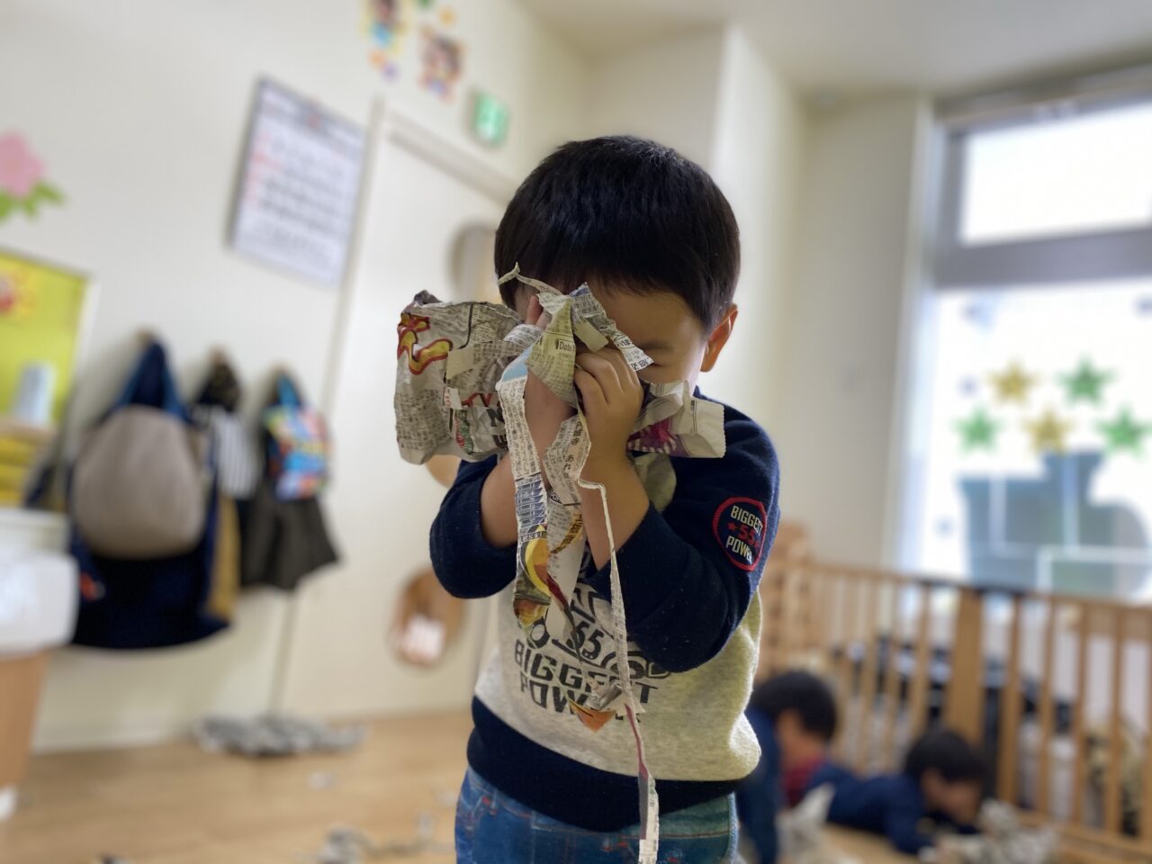 みんないい表情で遊んでますね✨新聞紙だけでも、お友達と先生と一緒だと無限の可能性がありますね❤️